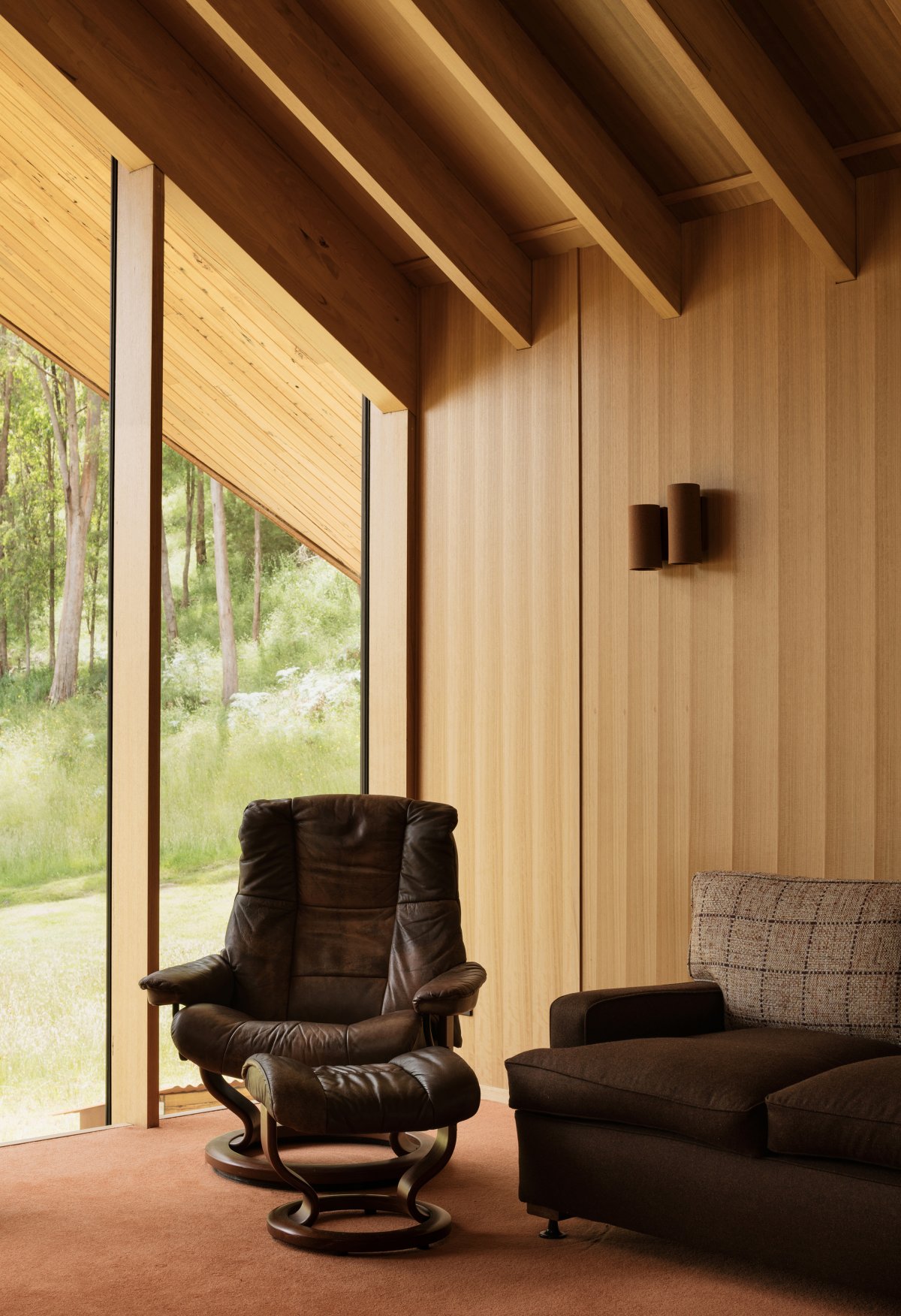 Traditionally, families from this area gathered at the church, so the structure relates to the volumes of a civic meeting place. The gables on each side ensure the views from the house capture the full aspect of the landscape, from the creek at the bottom of the valley to the ridgeline of the surrounding mountains. The large vertical expanse of the gables creates an open connection between the upstairs rumpus room and the downstairs living area.