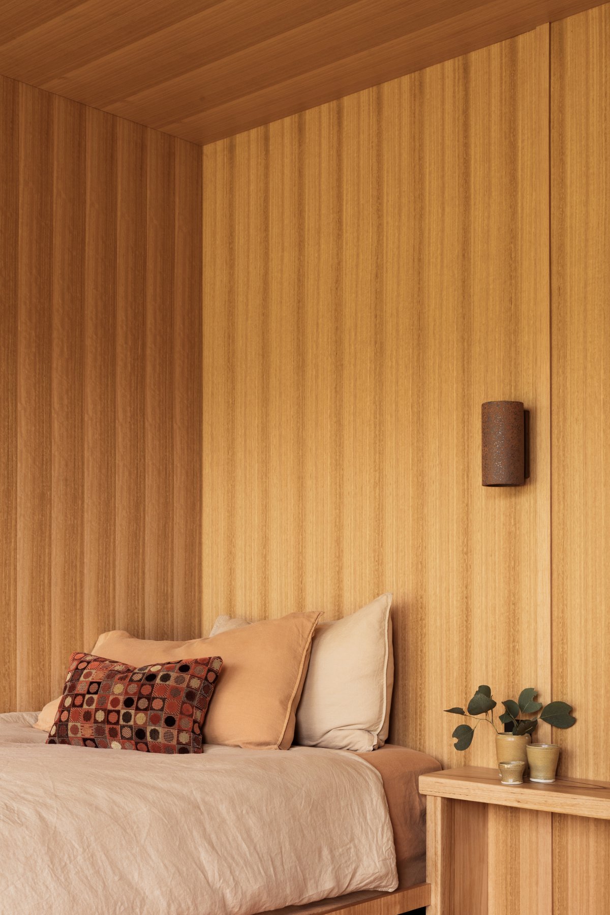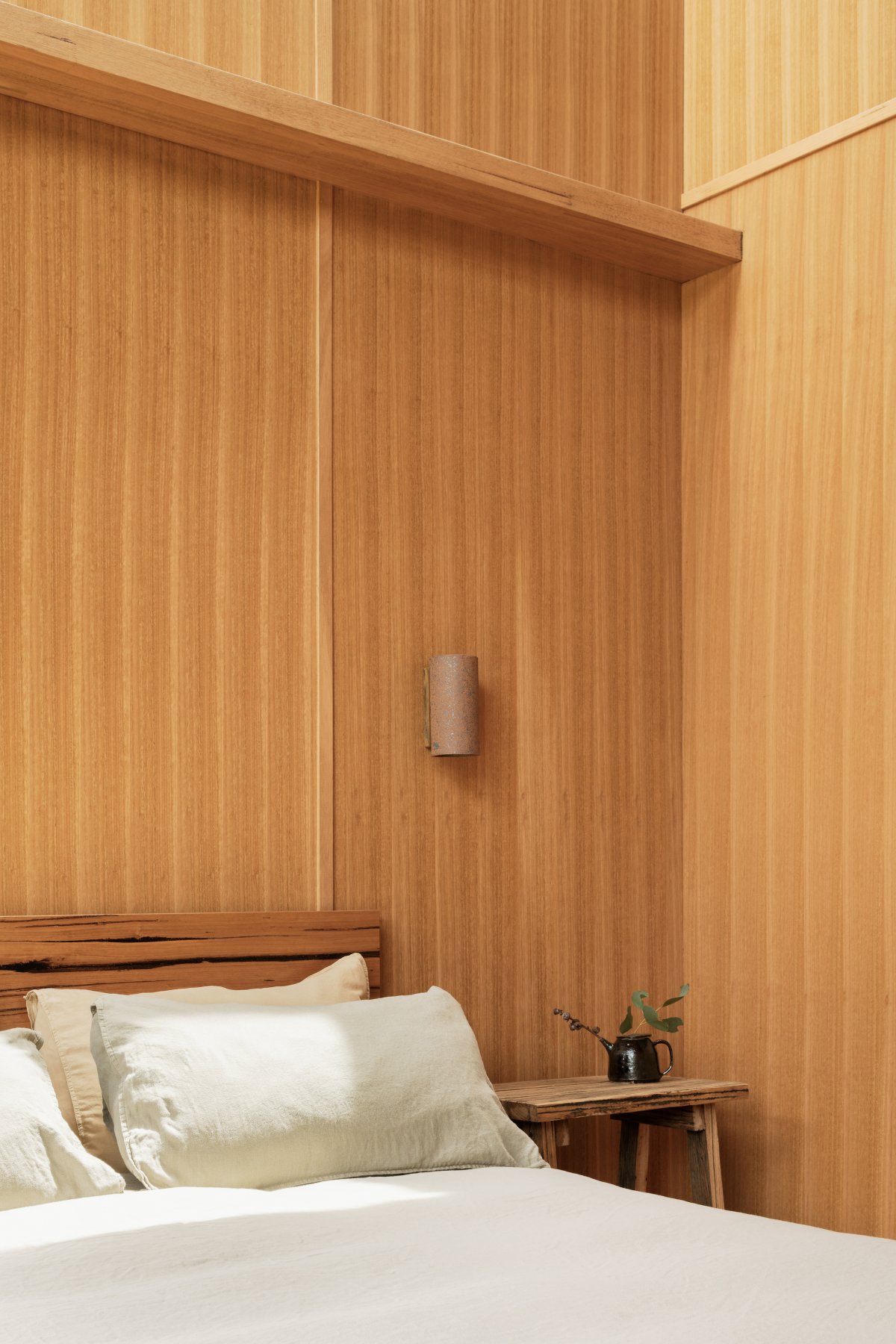 This project champions Australian hardwood. Exposed rafters create a rich ornamentation, and textural use of timber achieves a rich aesthetic experience despite a restrained palette. The glue-laminated timber, sustainably produced from the same species of trees found on the land, connects the internal with the external and enhances the dwelling’s overall efficiency.
