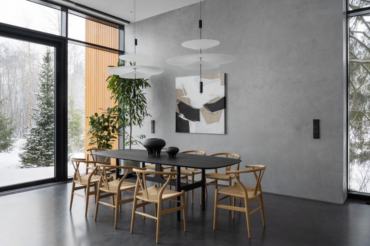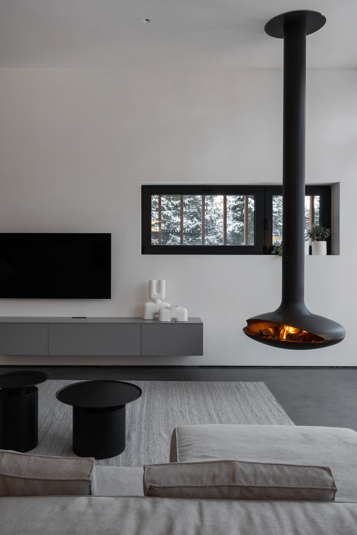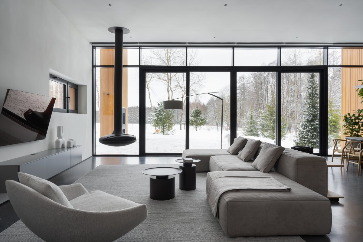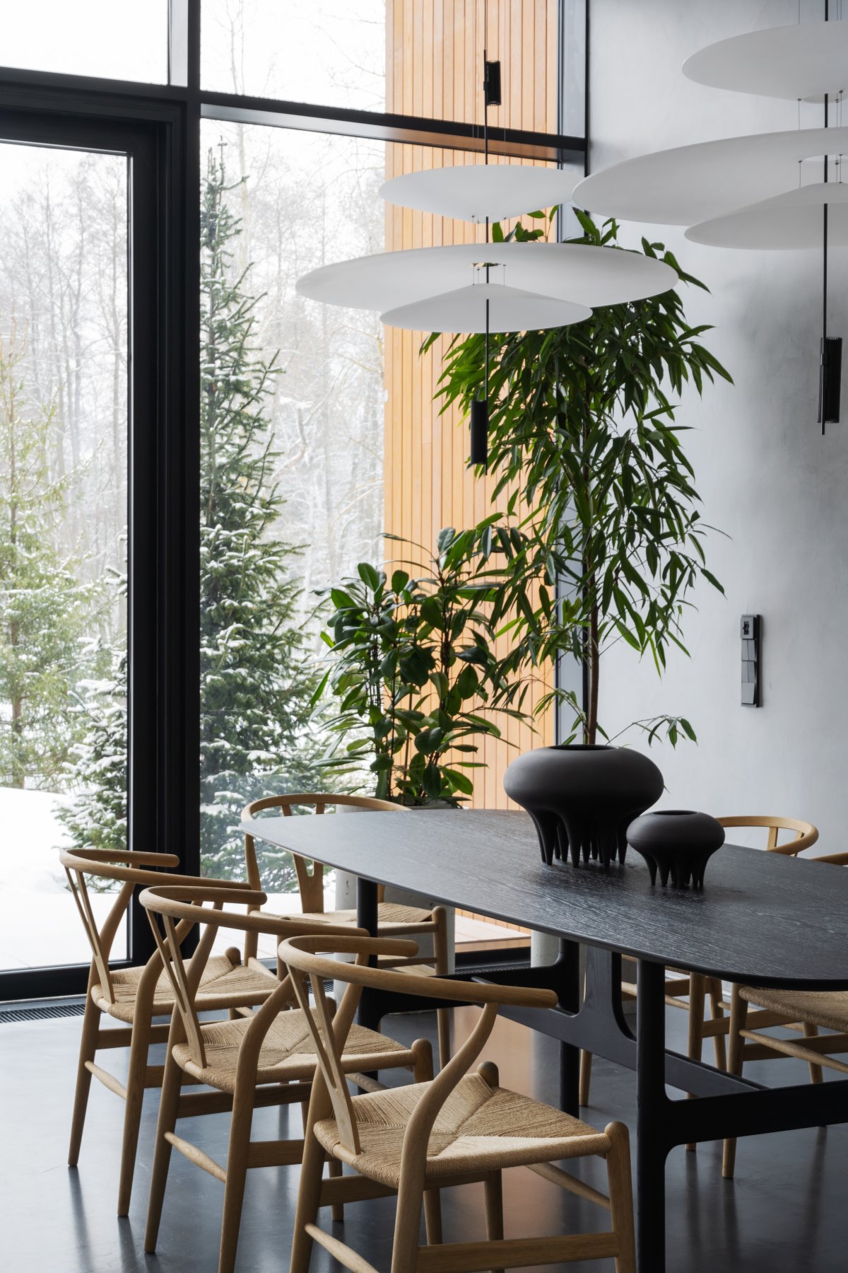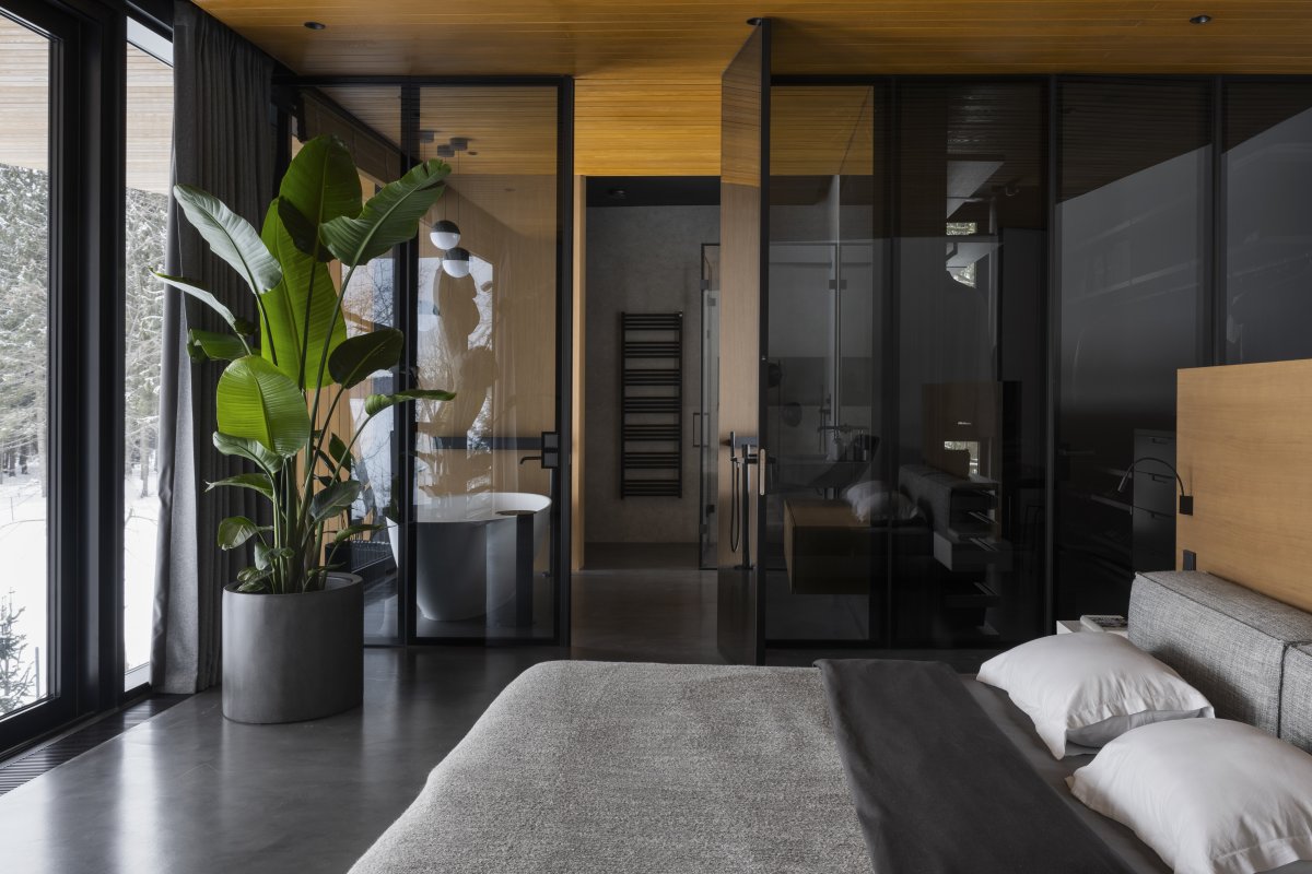 Panoramic windows in the living-dining area provide a picturesque view of the forest. One of the homeowners' important requests was a fireplace, so Architecture Bureau 8088 designed two: an outdoor fireplace built into a terrace canopy, and a suspended indoor fireplace in the living room, which "floats" in the air without obstructing the view of the terrace and yard. The chimney pipe runs through the master bedroom on the second floor, intentionally left visible to harmonize with the room’s aesthetic. To match its dark hue, Architecture Bureau 8088 added other dark accents, such as a lounge chair, art pieces, and a glass partition between the closet and bathroom.