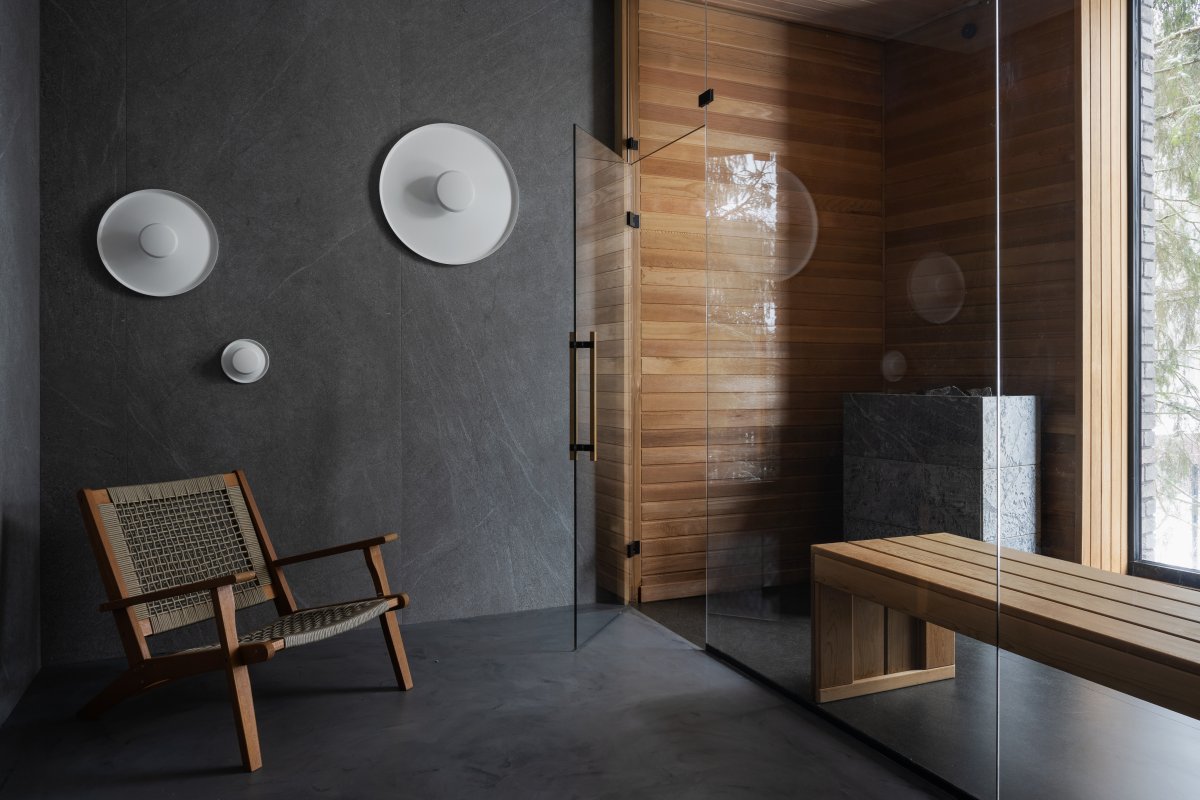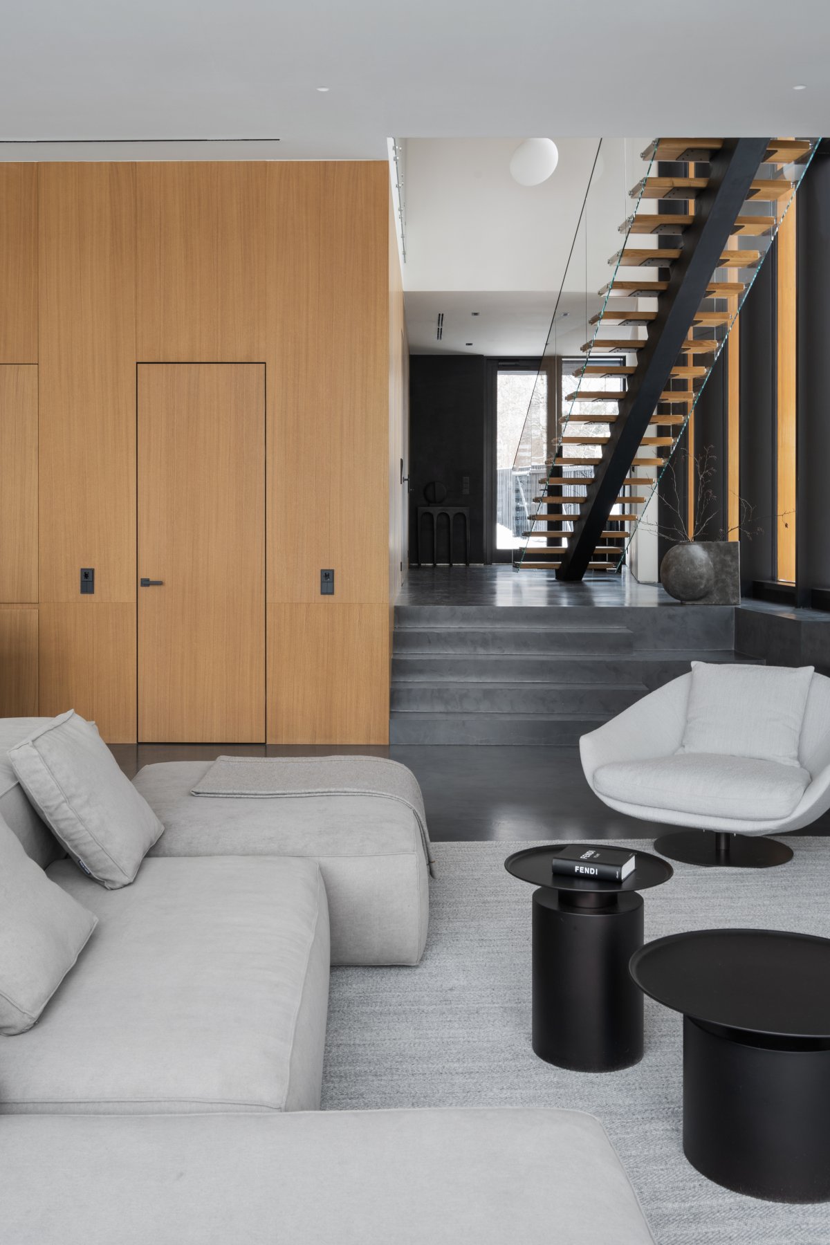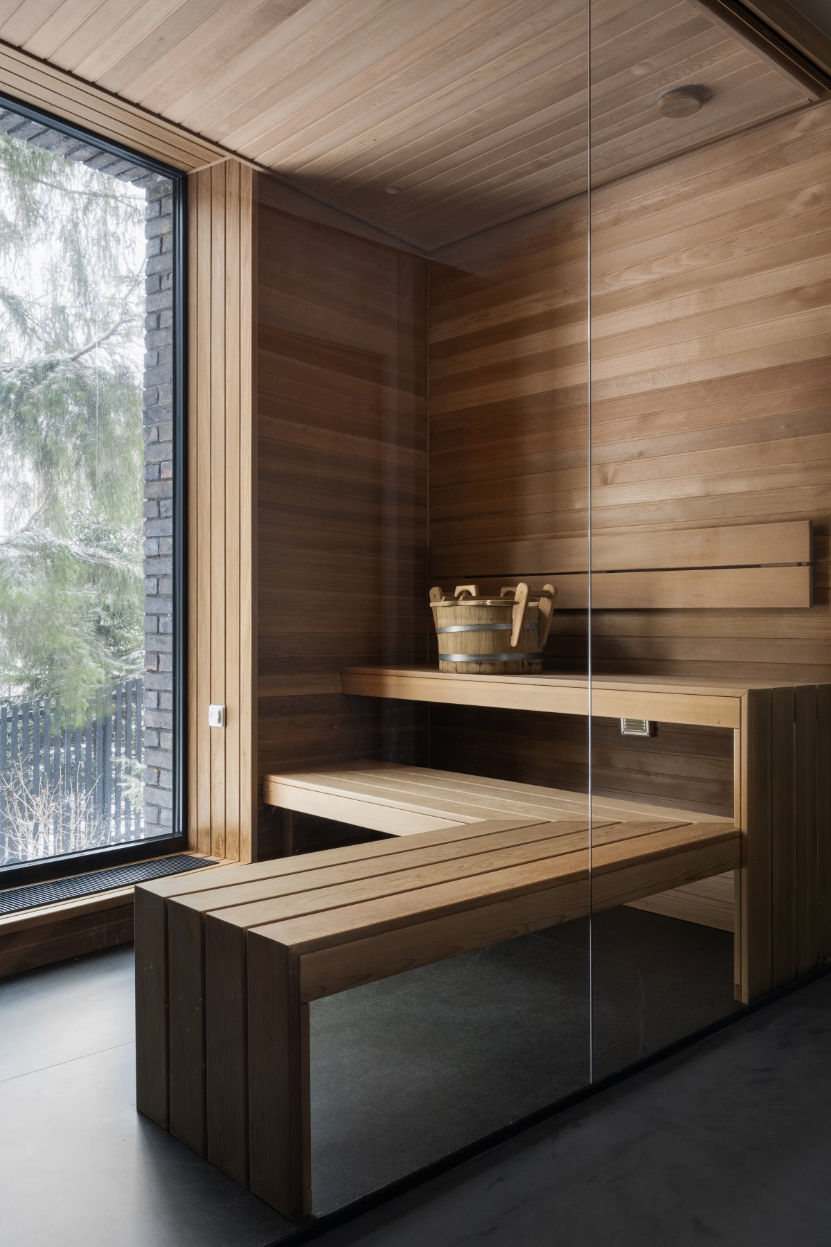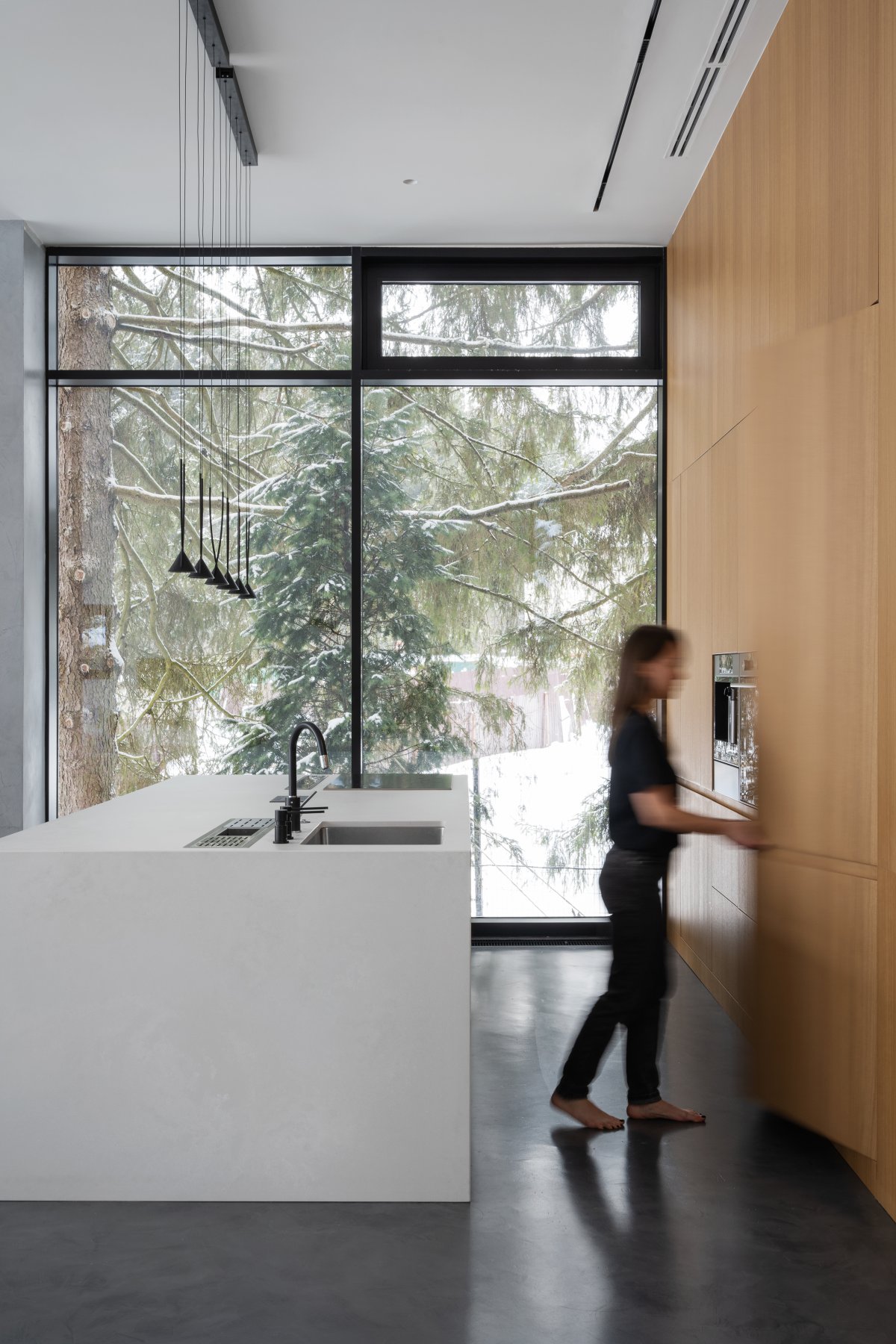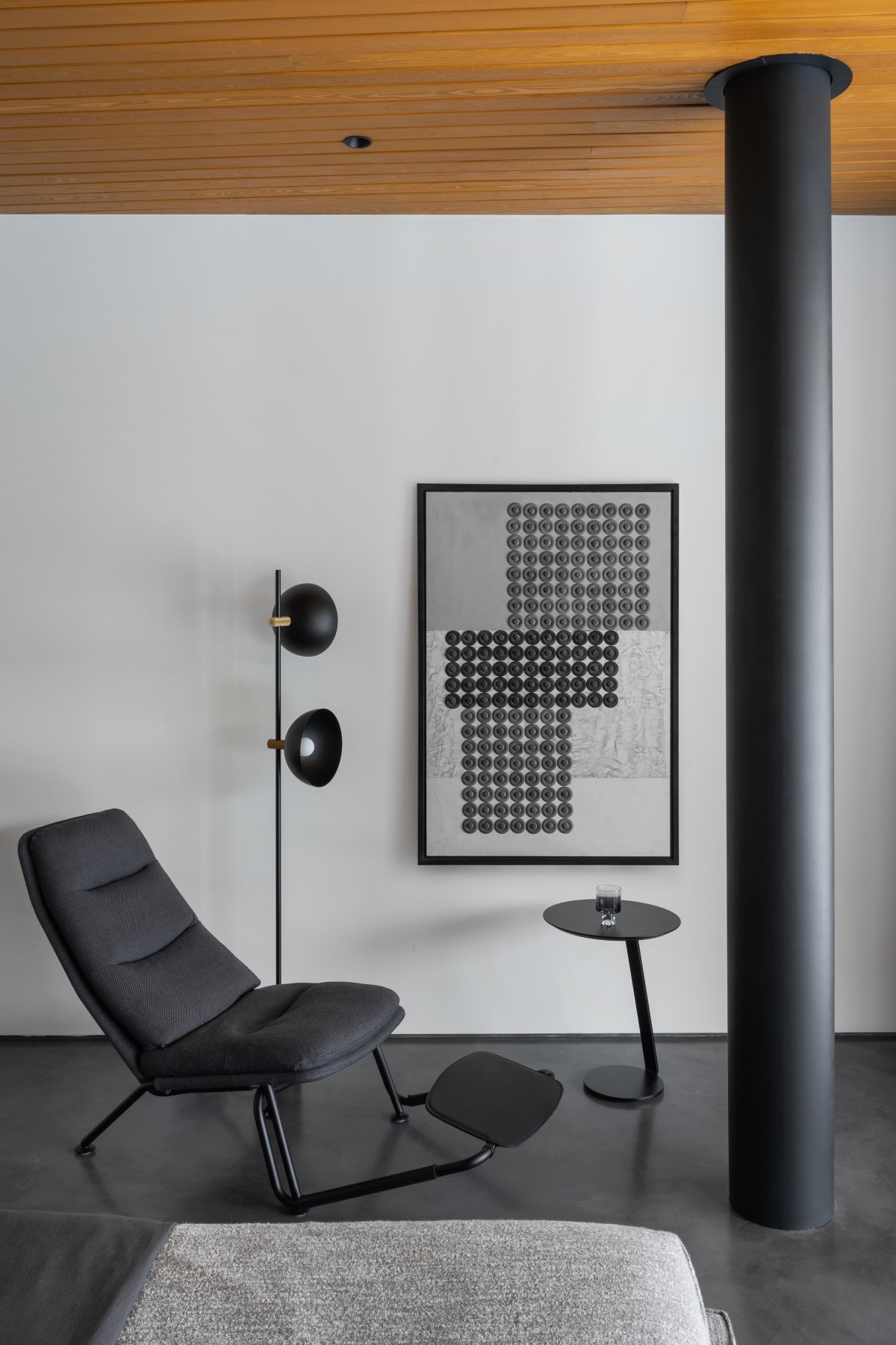 Panoramic windows in the living-dining area provide a picturesque view of the forest. One of the homeowners' important requests was a fireplace, so Architecture Bureau 8088 designed two: an outdoor fireplace built into a terrace canopy, and a suspended indoor fireplace in the living room, which "floats" in the air without obstructing the view of the terrace and yard. The chimney pipe runs through the master bedroom on the second floor, intentionally left visible to harmonize with the room’s aesthetic. To match its dark hue, Architecture Bureau 8088 added other dark accents, such as a lounge chair, art pieces, and a glass partition between the closet and bathroom.