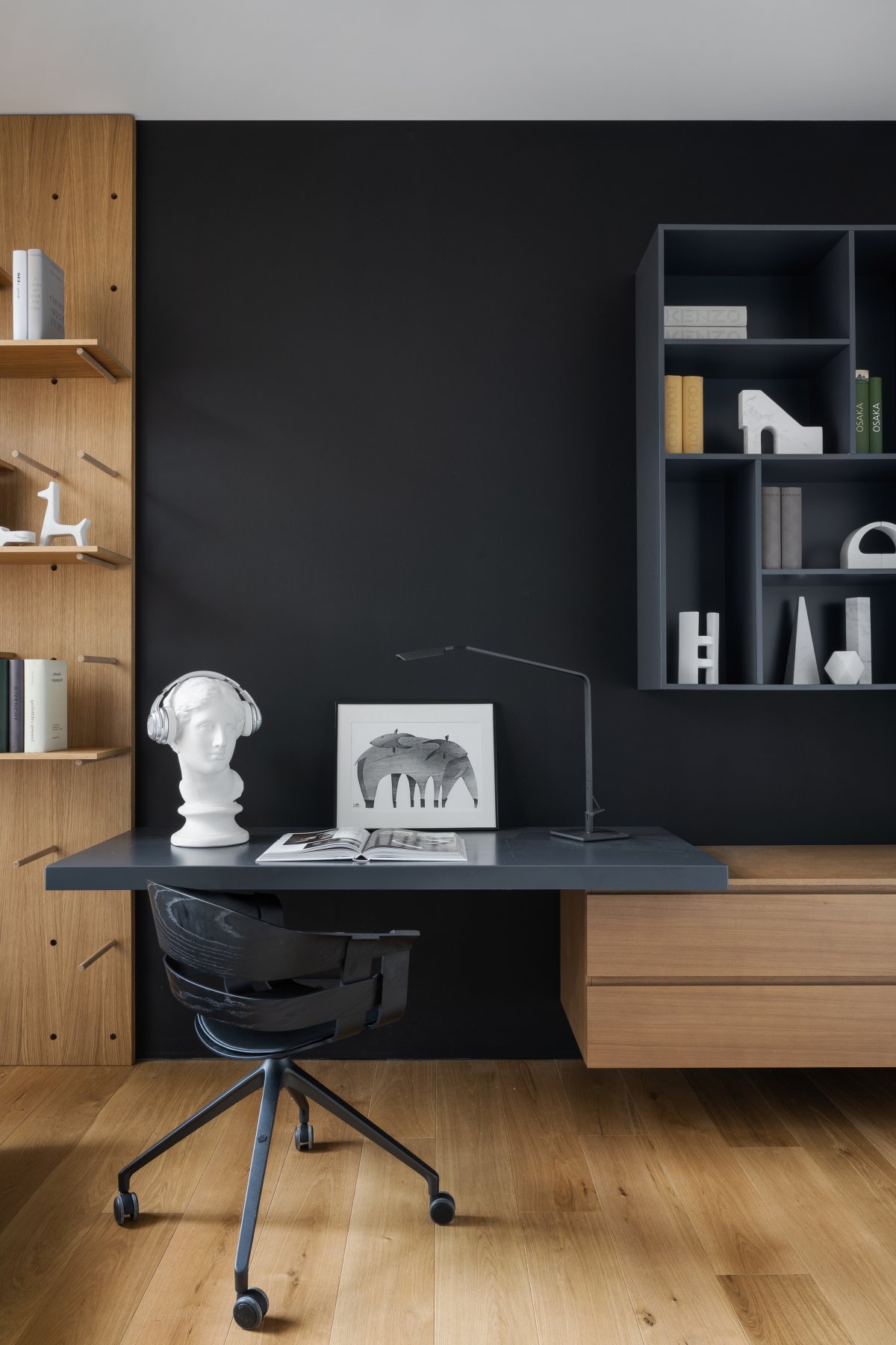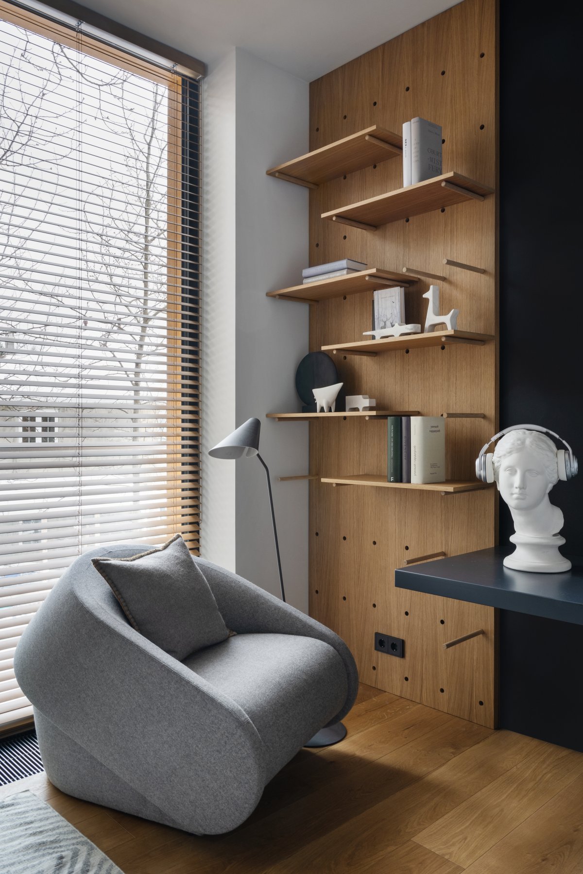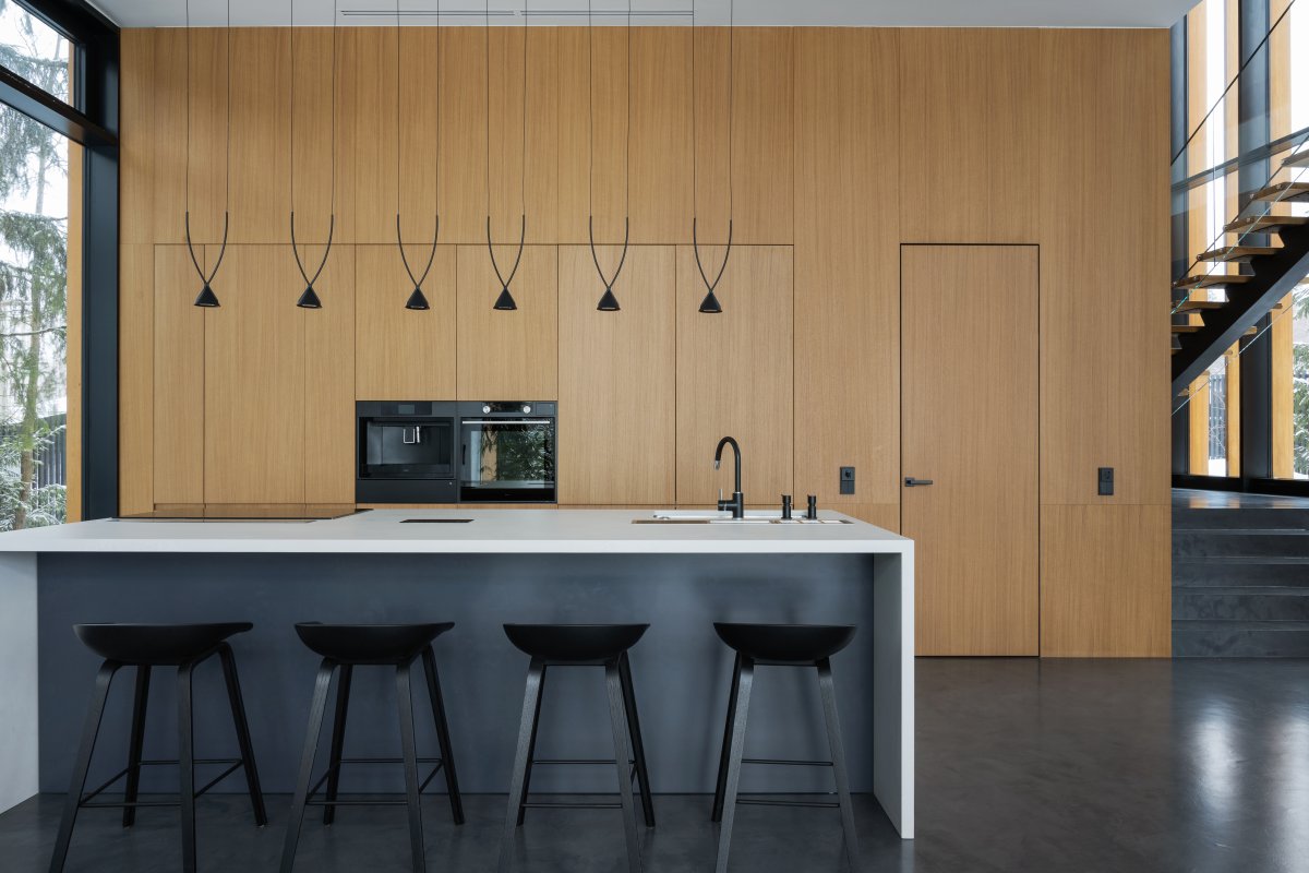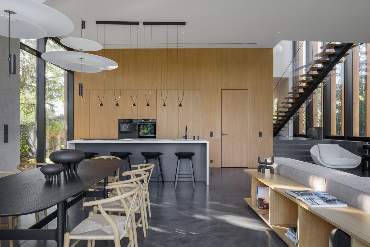 The interior was designed for a young family with a child, two dogs, and a cat. Since the house was initially well-designed according to the clients' wishes, no major layout changes were necessary during the interior planning stage. Only slight adjustments, such as shifting some doorways, were made. The intricate geometry of the space is due to the numerous beautiful, large trees on the plot, which the clients wished to preserve. A striking double-height hall with an expansive glass window offers views of both the living room and the upstairs hall, which can also serve as a gallery for contemporary art.