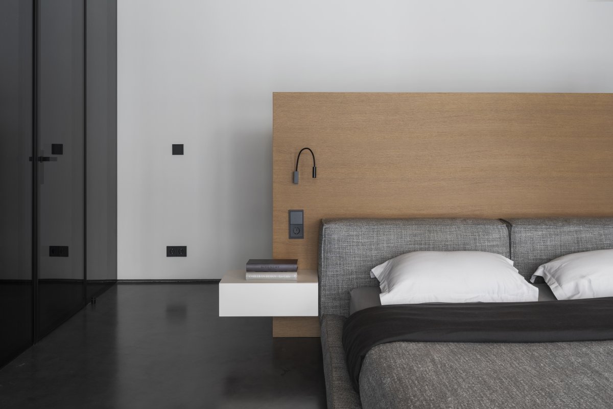 The minimalist interior unifies the entire space with white walls and tall white doors extending to the ceiling. Calm, muted tones highlight the beauty of the outdoor scenery, with warm wood wall panels softening the cool microcement and creating a cozy contrast throughout. In the master bedroom, the wood finish continues across the ceiling, extending into the terrace canopy while blending seamlessly with the microcement.