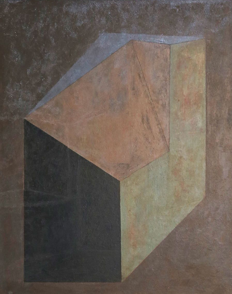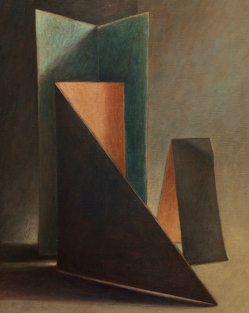 Berend Boorsma's semi-abstract geometric objects are subtly folded or stacked and seem to float in the air. Based on simple paper constructions, Boorsma’s series‘Folded Views’ is an ongoing exploration of dimensionality: of flatness and depth, and our perception of it. The paper constructions are a device, offering flat planes and sharp lines, areas of light and shade, however, the resulting paintings are less about geometry and mathematics, and more about tone, texture and the passage of time.