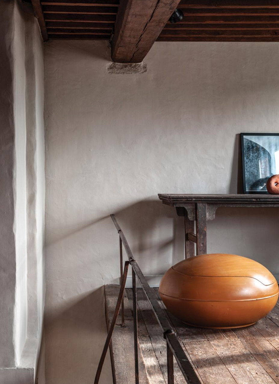 Boris Vervoordt: "Like my father, I am fascinated by old architecture." To evoke the unpolished elegance of the Wabi-Sabi aesthetic, the design of the interior and furniture leaves behind the texture of history and age, as one on the walls, furniture and other surfaces. The house can also be used as a gallery to collect objects and works of art that people like, which happens to be the design inspiration they get from it.