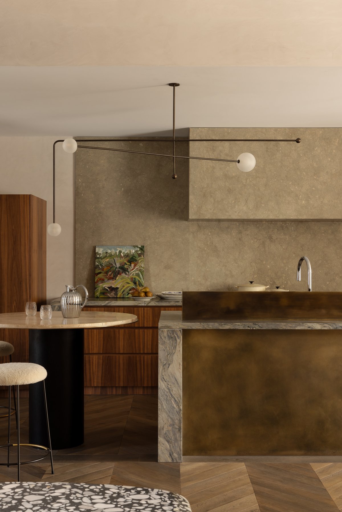 The strategy for the joinery was to design it almost as furniture pieces, instead of simple being vehicles to store and conceal. Treating joinery and storage as individual pieces of design allowed Perera to parlay the art deco gestures into a contemporary context befitting for everyday life with details that are unexpected and sculptural. Subtle layering of different stone combinations features throughout, refining the open plan living and kitchen and anchoring the space within a soft tonality.