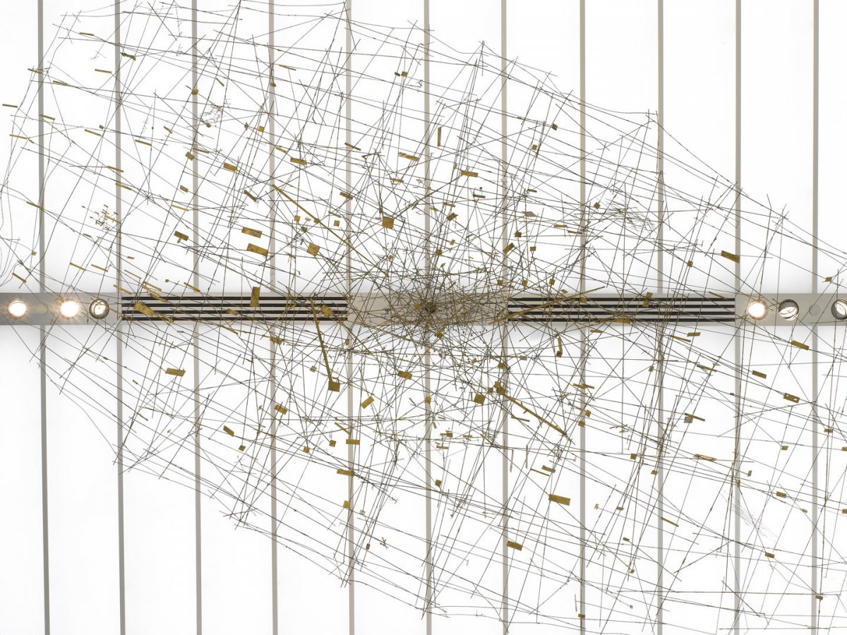 The interior faces a floating white terrazzo mezzanine and luminous ceilings, creating the impression of weightless architecture. These elements were created by Burdifilek in collaboration with modernist sculptor and furniture designer Harry Bertoia to create a 70-inch gold-plated screen and whimsical "cloud" decor suspended in mid-air.
