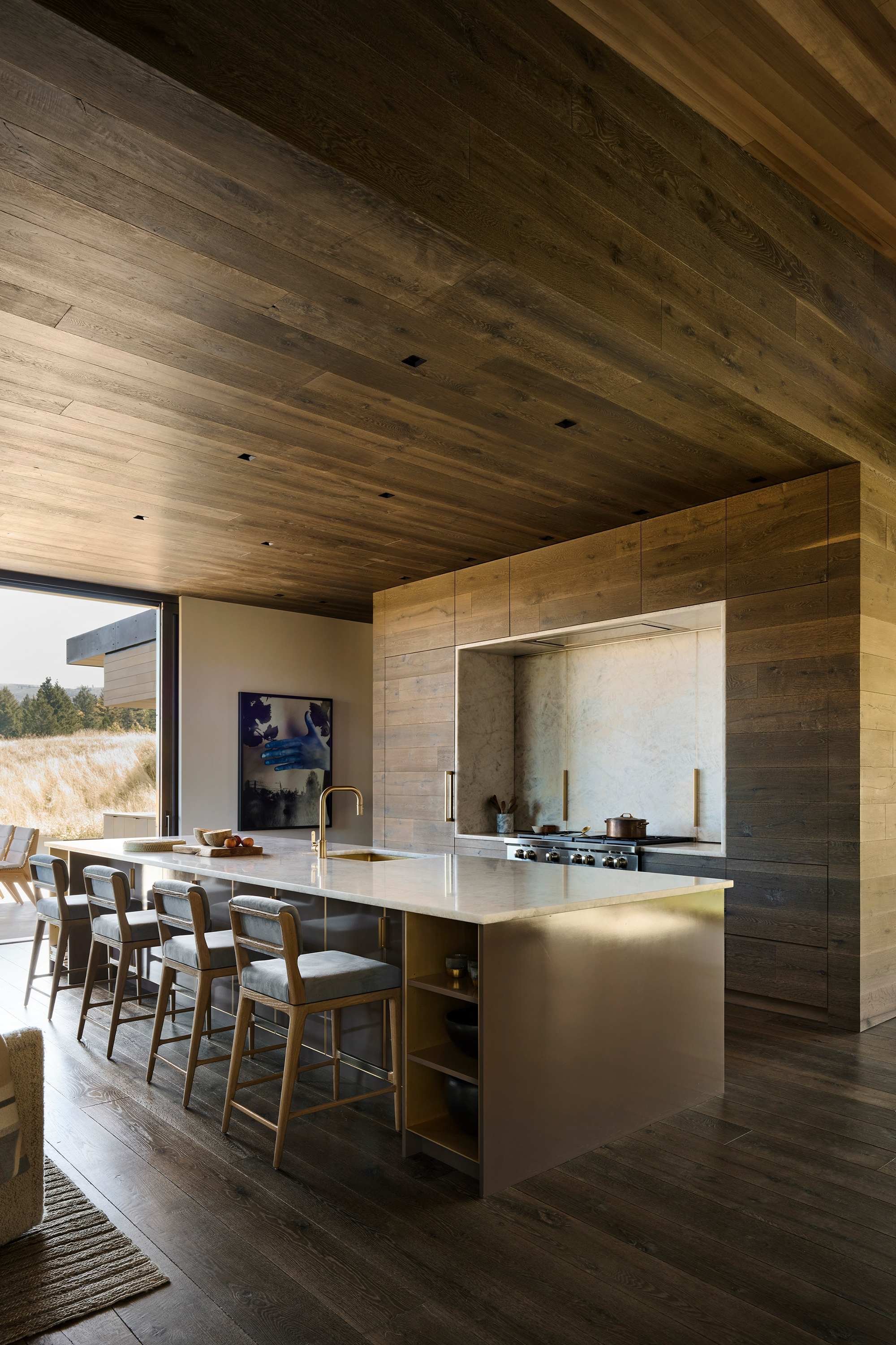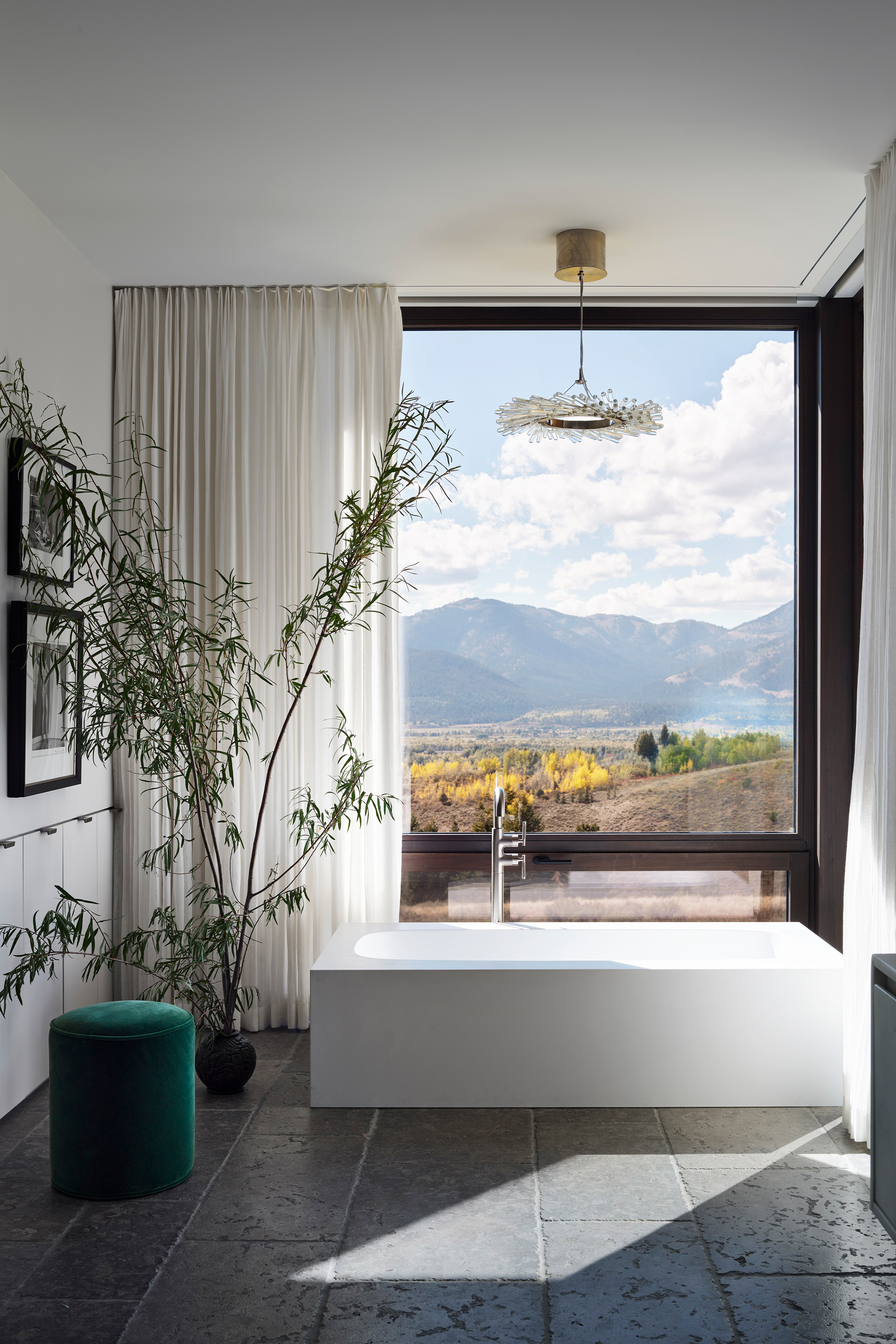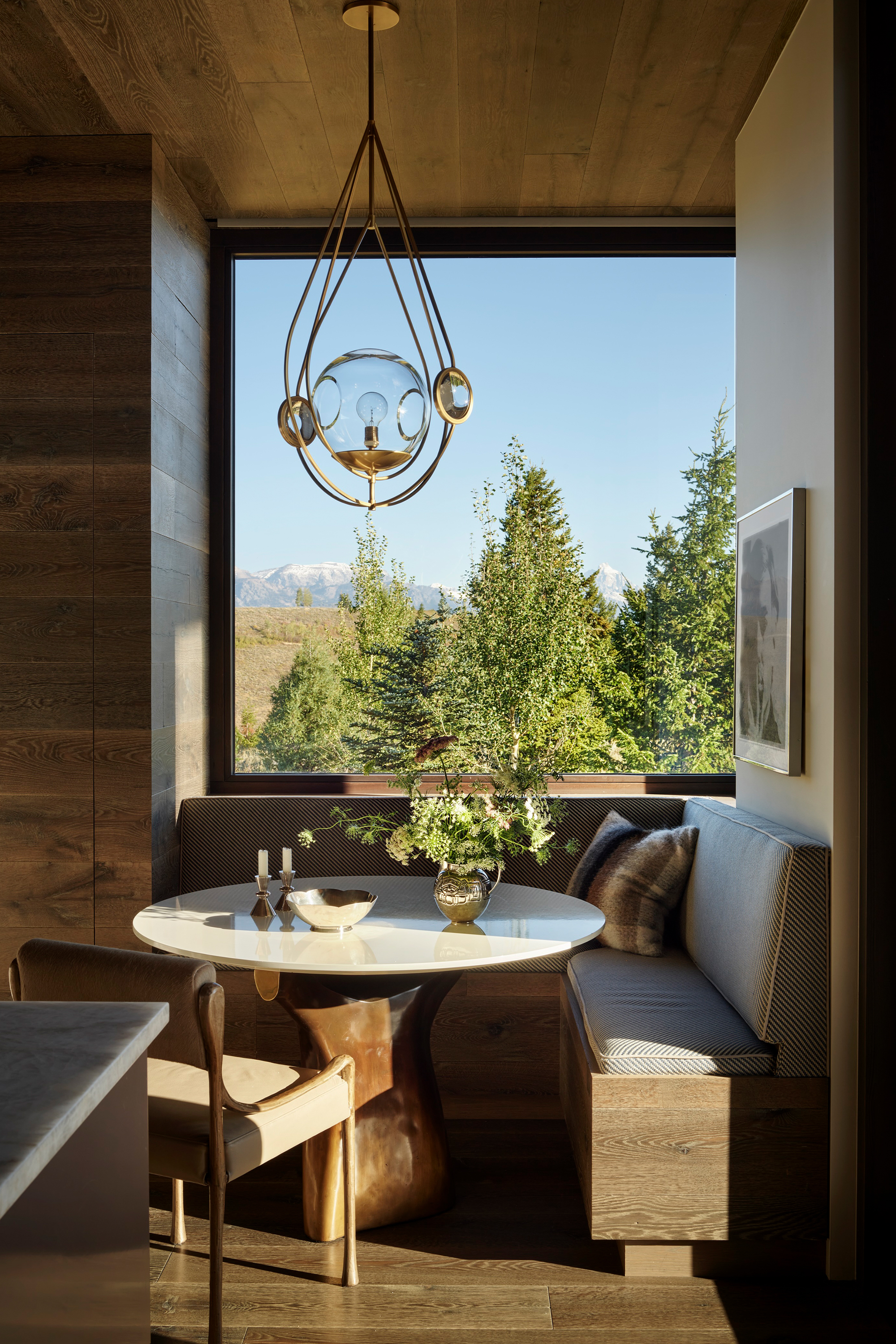 Throughout the home’s clean-lined spaces, modern furnishings — often with curvilinear lines — embrace a quiet, neutral color palette that keeps the focus on the mountain panoramas and the art. Natural fabrics and warm-tone metals —mohair, linen, alpaca, wool, leather, walnut, brass and bronze — are refined yet durable to stand up to a large, active family’s daily use. - Interior finishes including white oak and limestone flooring and quartzite countertops were chosen in concert with the architecture’s regionally connected use of wood and stone to provide an understated yet sophisticated backdrop.