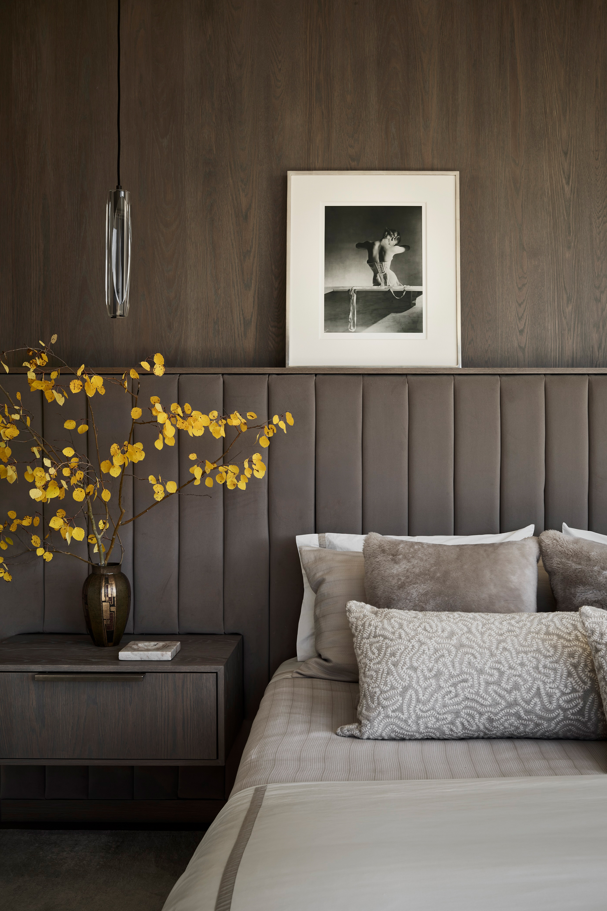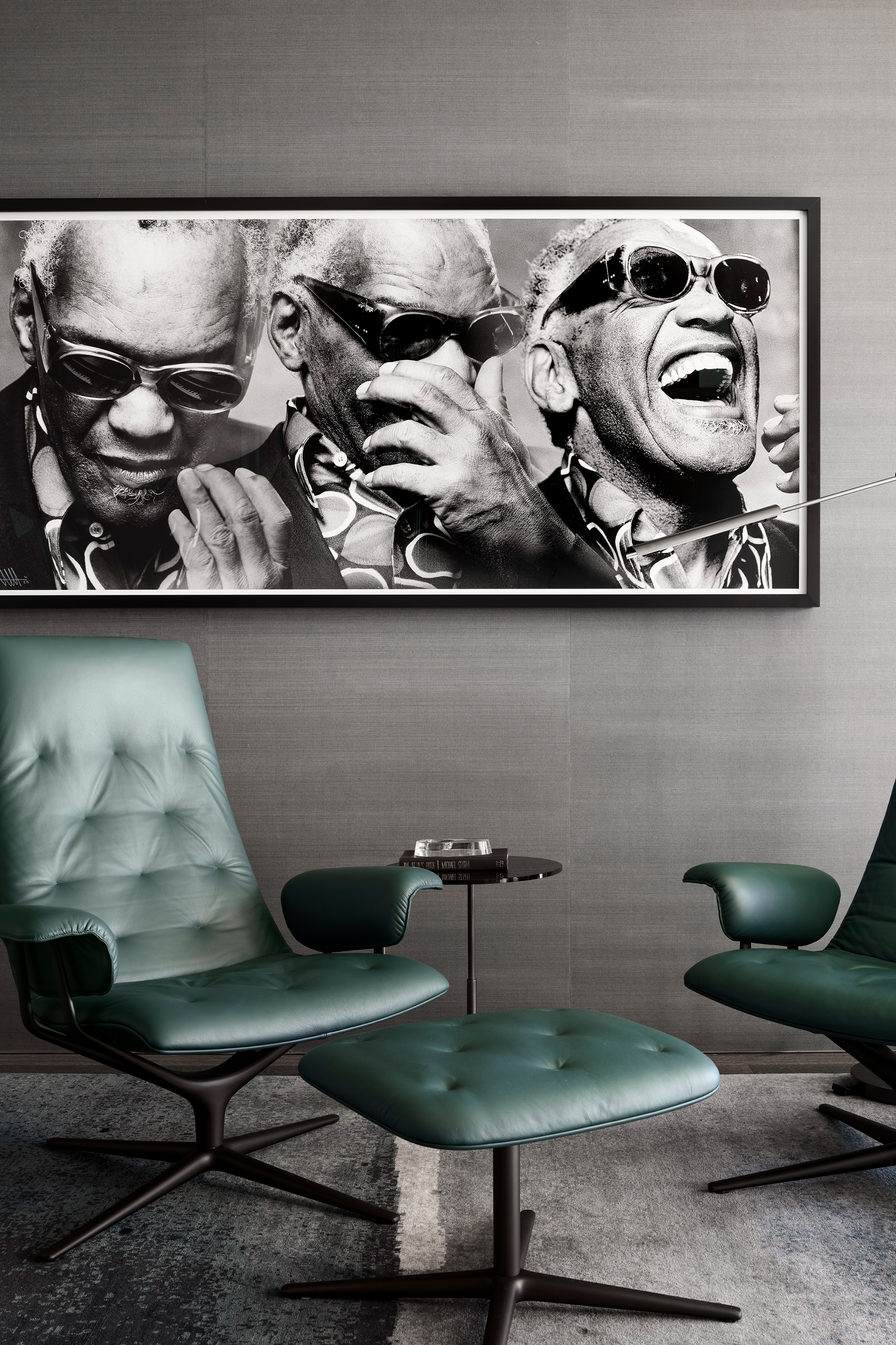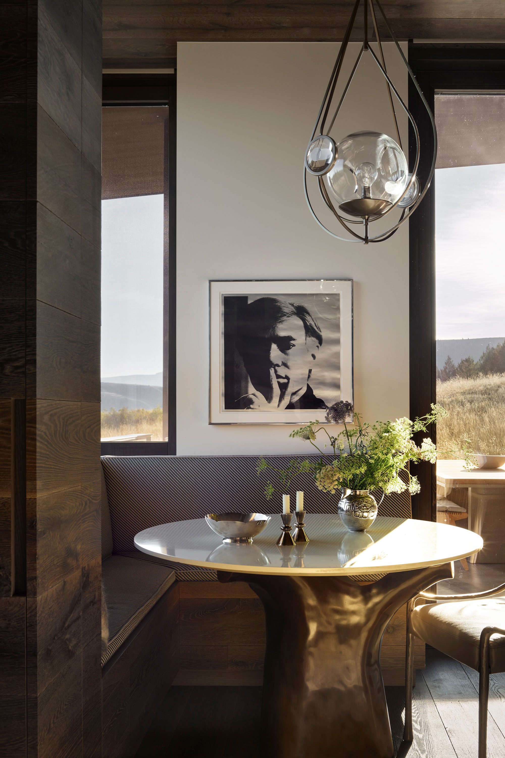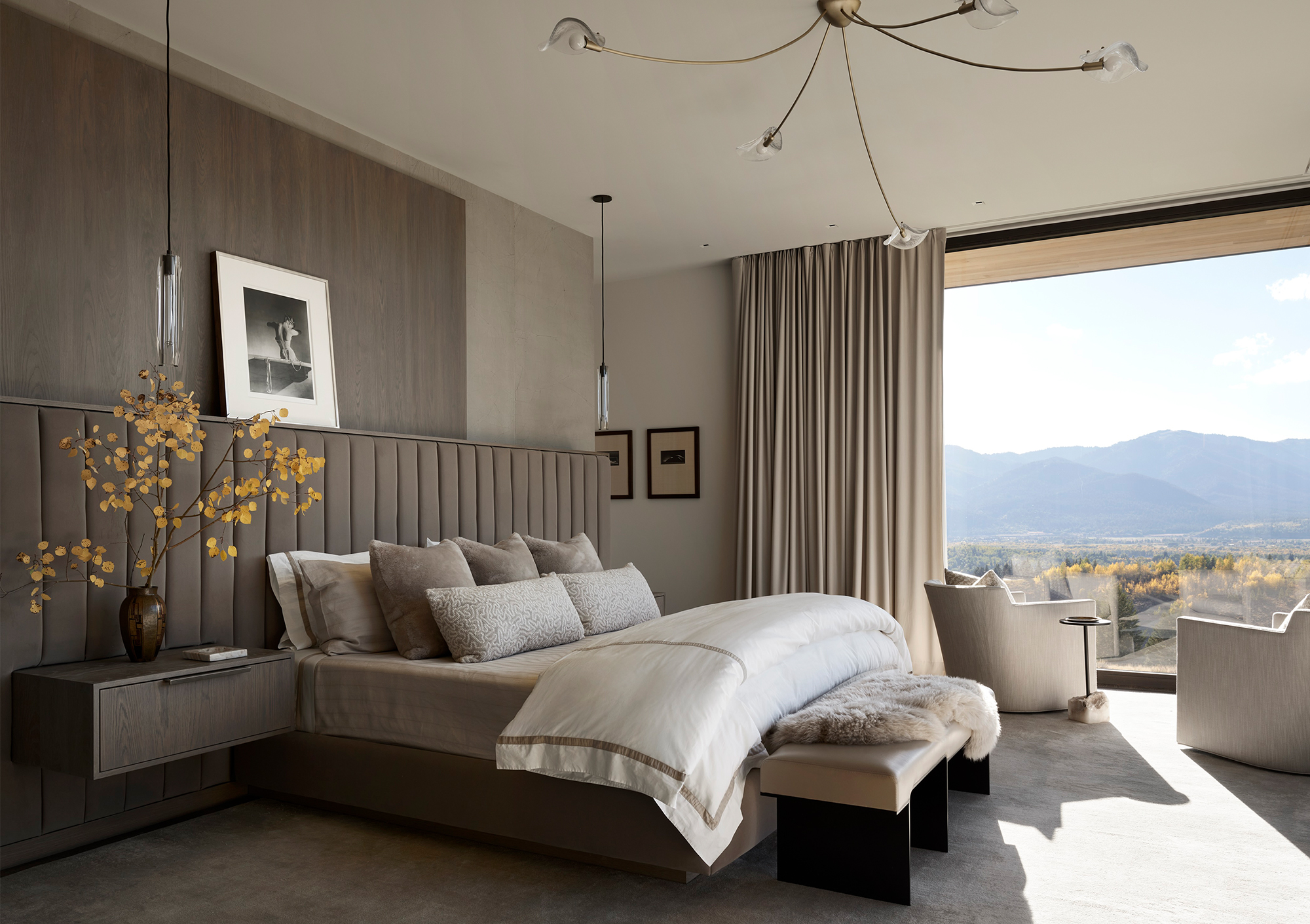 Throughout the home’s clean-lined spaces, modern furnishings — often with curvilinear lines — embrace a quiet, neutral color palette that keeps the focus on the mountain panoramas and the art. Natural fabrics and warm-tone metals —mohair, linen, alpaca, wool, leather, walnut, brass and bronze — are refined yet durable to stand up to a large, active family’s daily use. - Interior finishes including white oak and limestone flooring and quartzite countertops were chosen in concert with the architecture’s regionally connected use of wood and stone to provide an understated yet sophisticated backdrop.