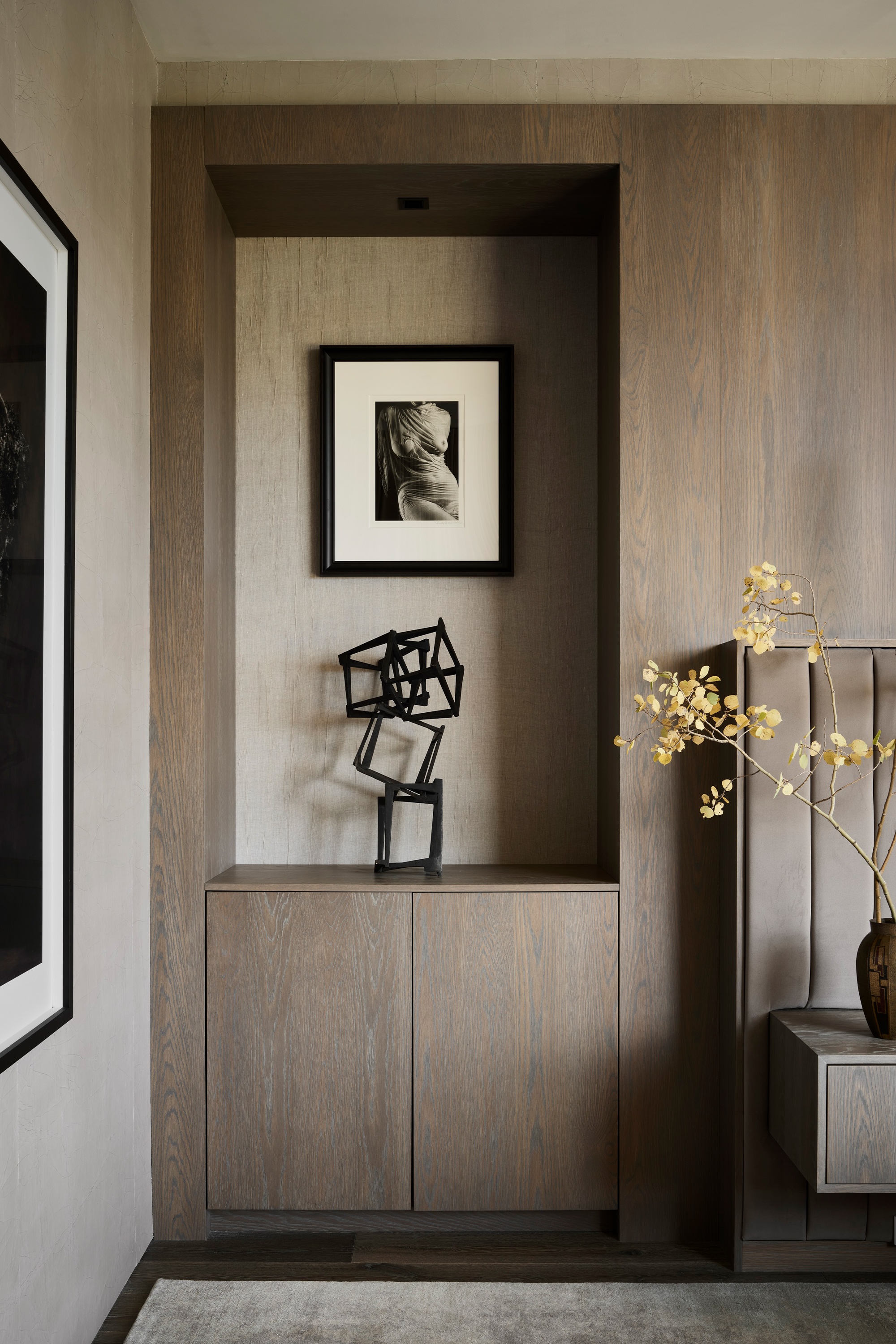 To create a home that respects the scale of its surroundings while also addressing the needs of a large, active family, the architecture unfolds as a series of interlocking volumes. Organizing the main house and guesthouse around a central courtyard provides shelter from the elements and frames moments of arrival and reflection. The interior spaces are arranged to balance public and private zones, with art serving as the connective tissue. A circulation gallery weaves through the home, guiding occupants to spaces that reveal themselves progressively—each new angle or threshold offering a different perspective, much like Novatt’s sculpture.