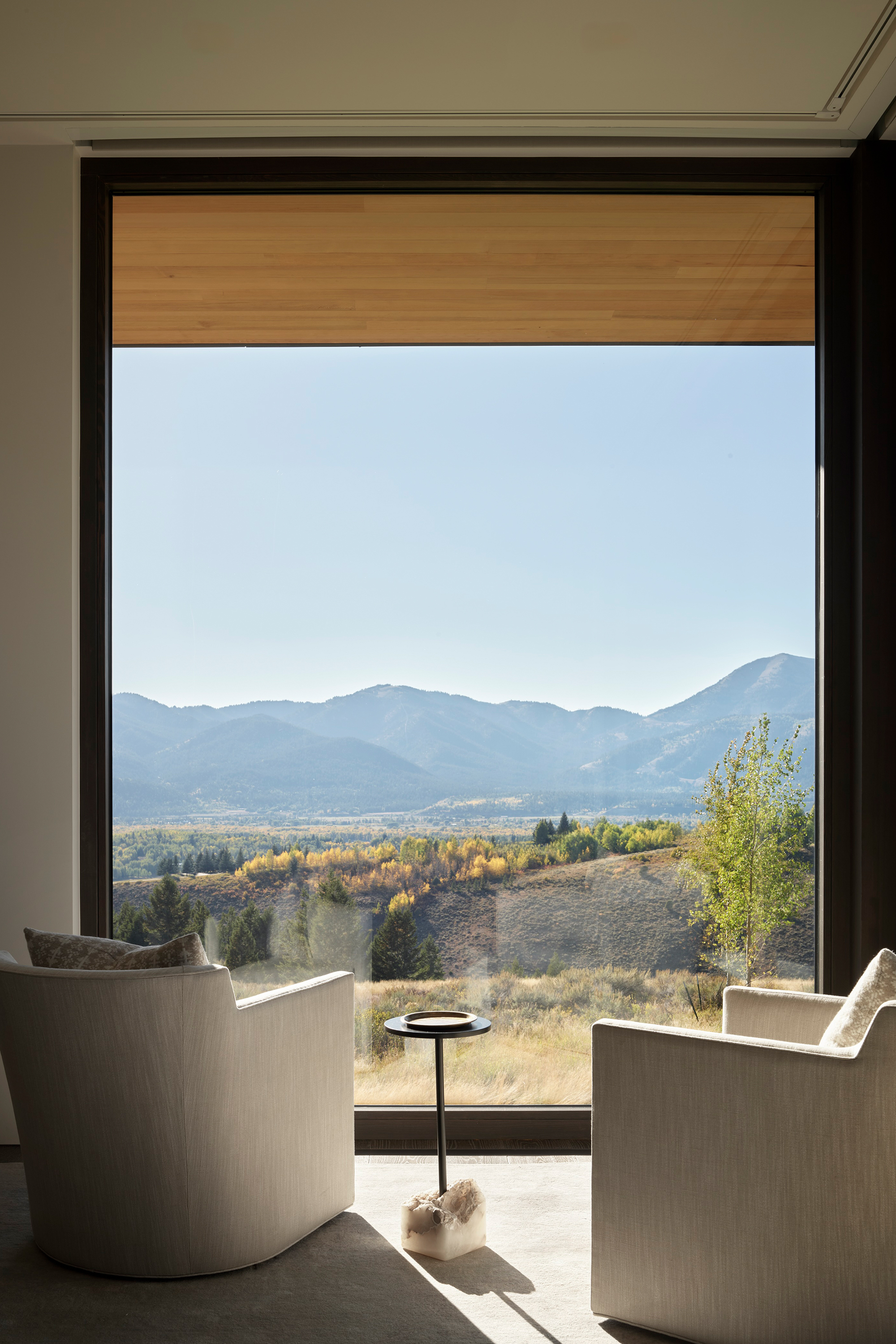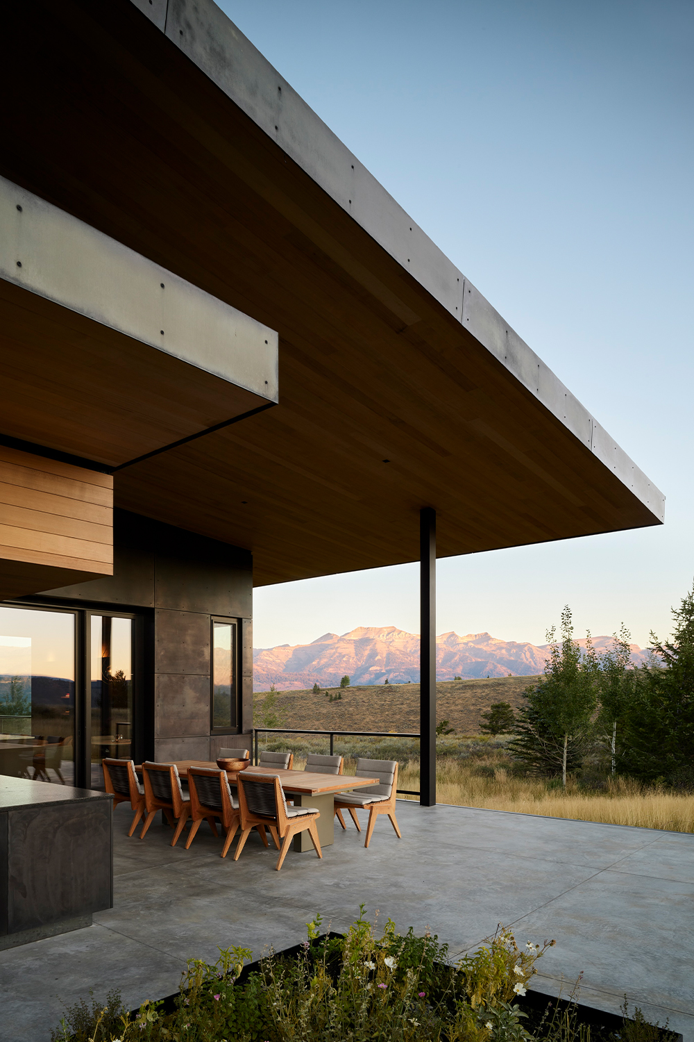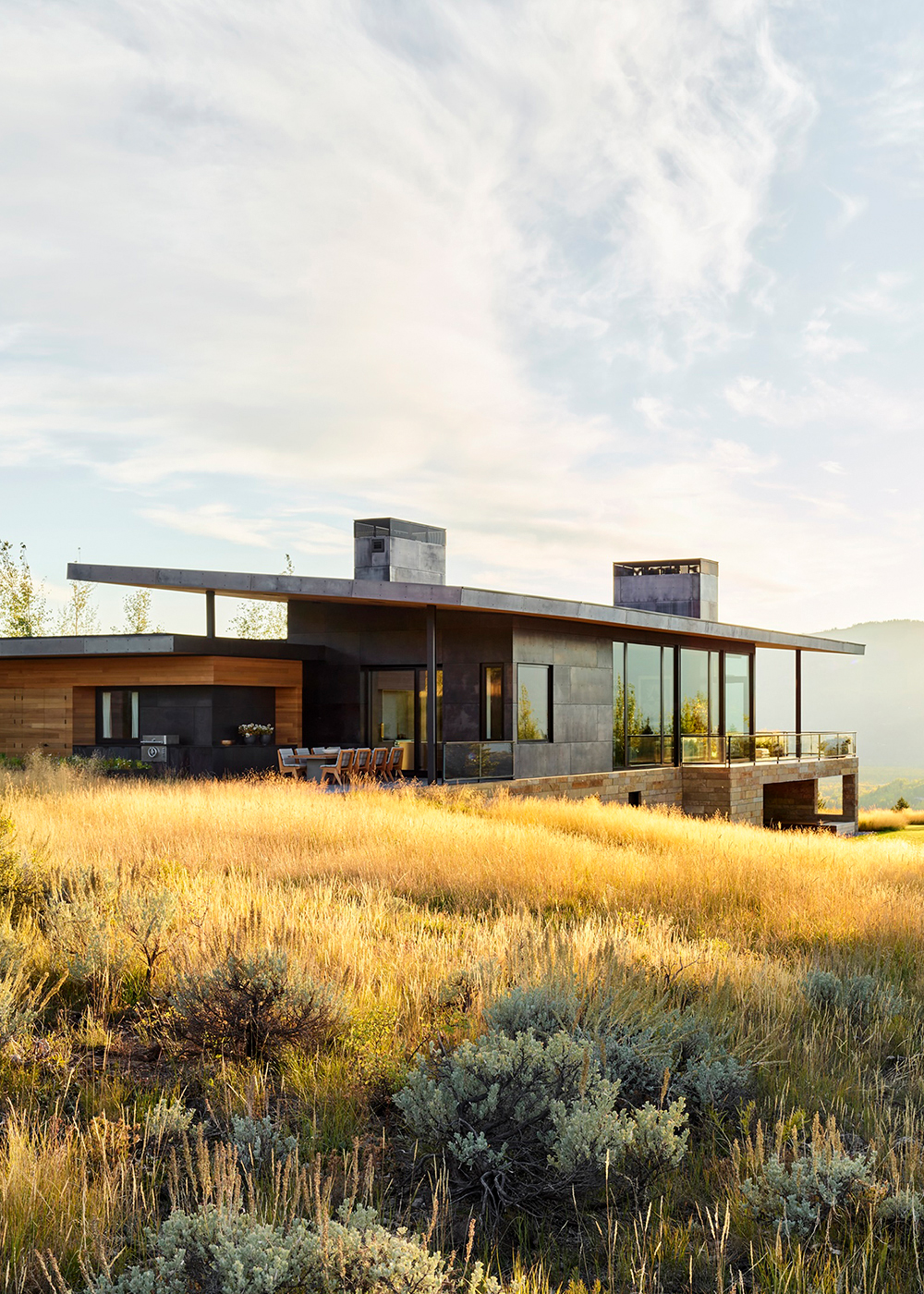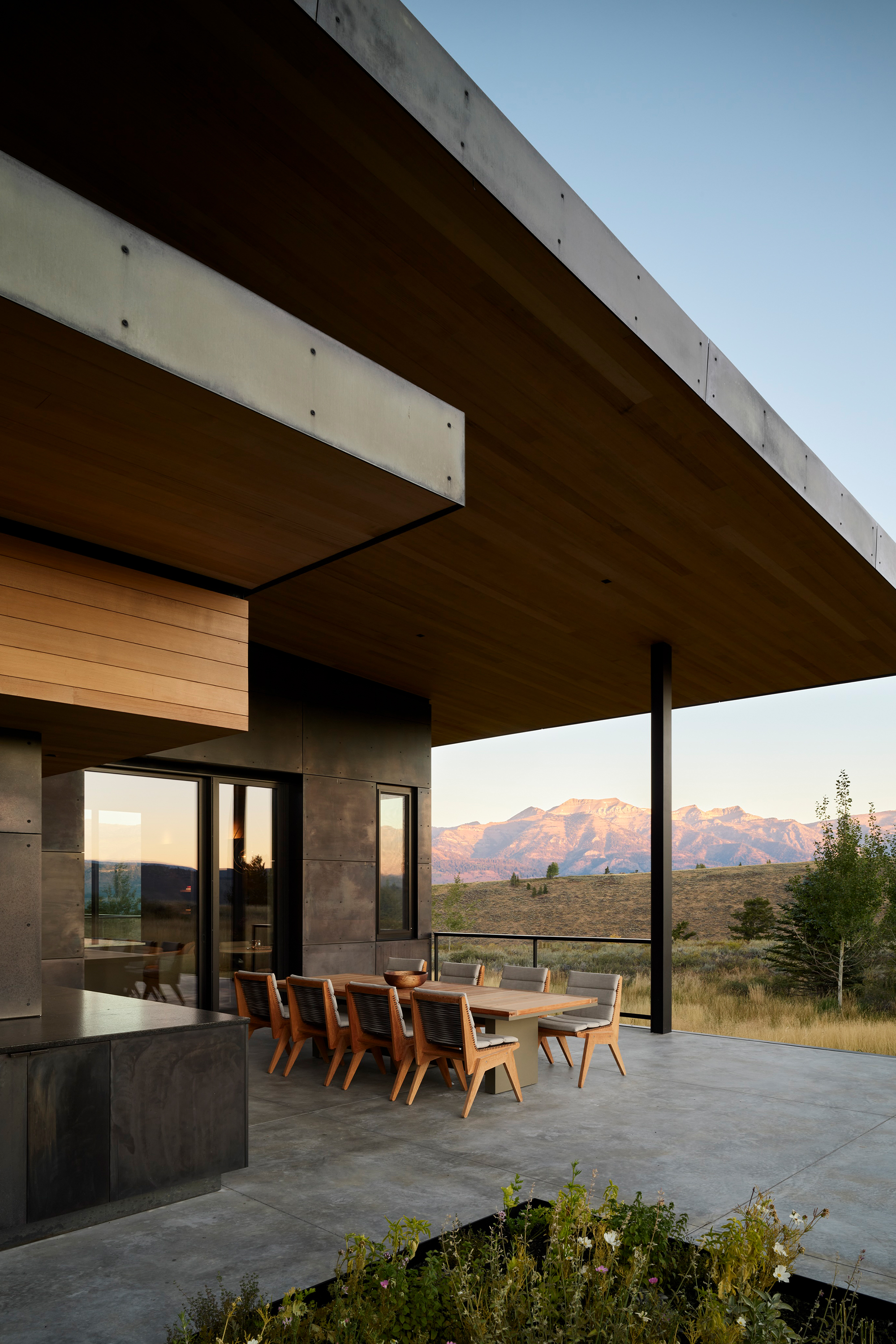 The house sits on a ridgeline with expansive views of the surrounding mountains, embracing its dramatic site. The property offers a rare combination of sweeping panoramas and more introspective moments in the landscape, a balance of vantage and refuge which the design similarly embodies. “This project is about contrast,” says Andy Ankeny, AIA, Partner at CLB. “The experiences within this home are variable, and yet the architecture itself is a simple, refined gesture.”