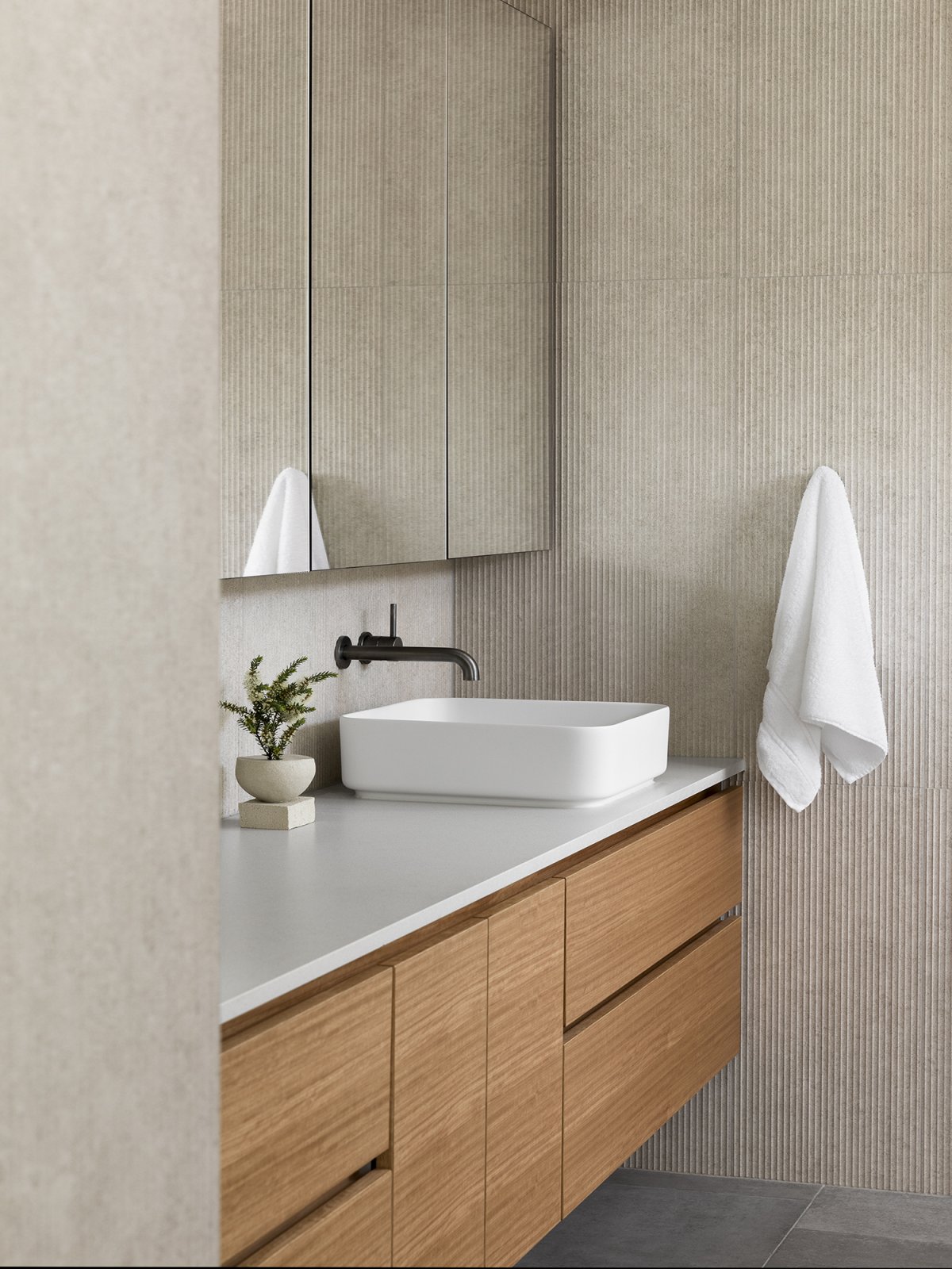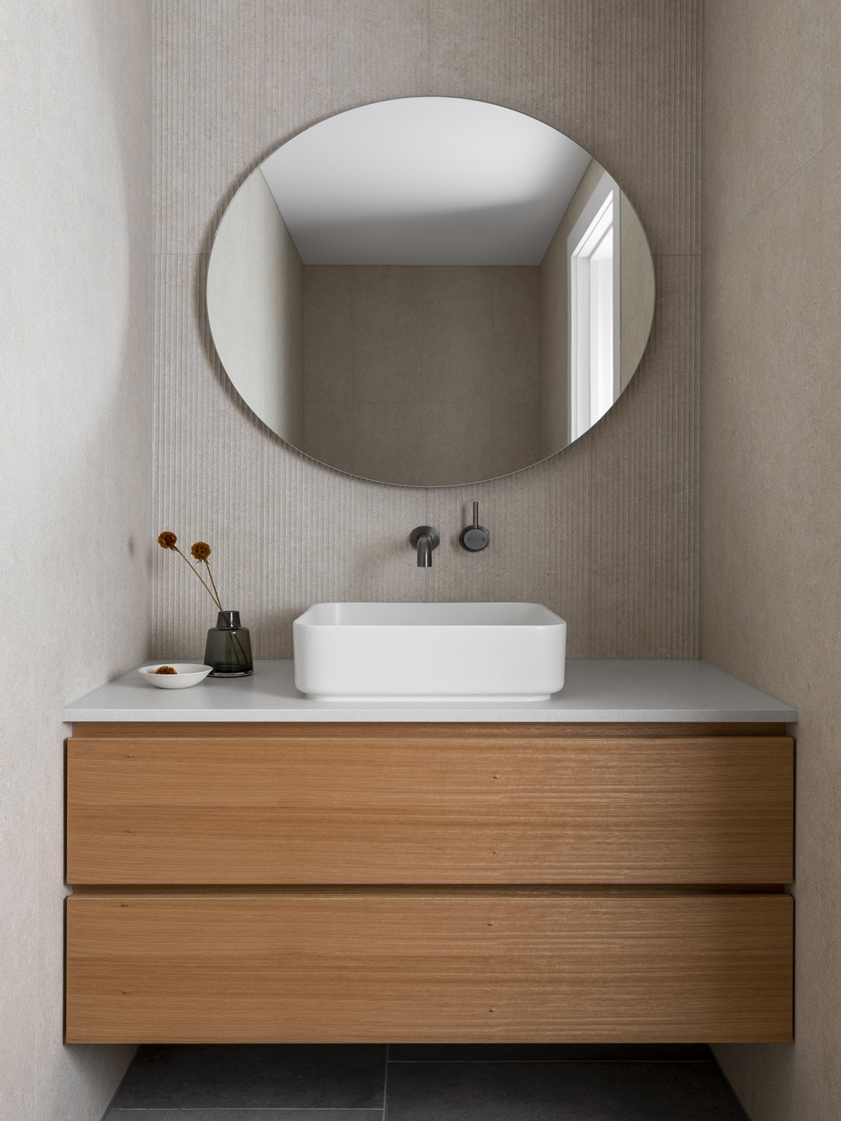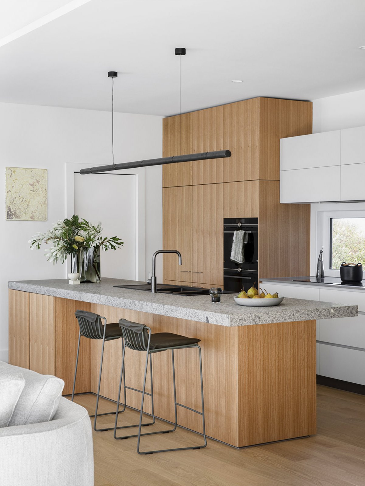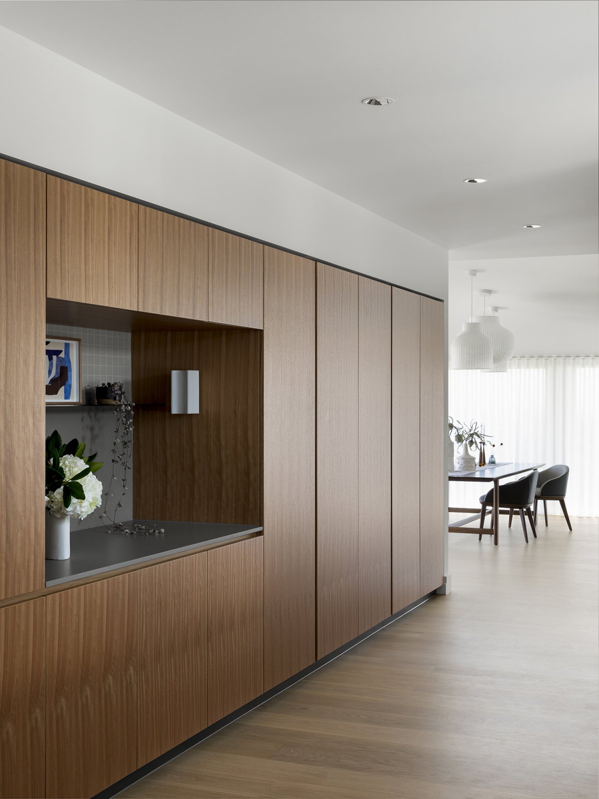 Cool, pastel tones continue throughout the house and reference the surrounding coastal environment. The combination of soft tones and natural textures successfully expresses and celebrates the landscape. Subtle tonal variations create a calming environment that allows the expansive landscape to take center stage in any event. The result is Cape Schanck as an exquisite, peaceful and communal family home.