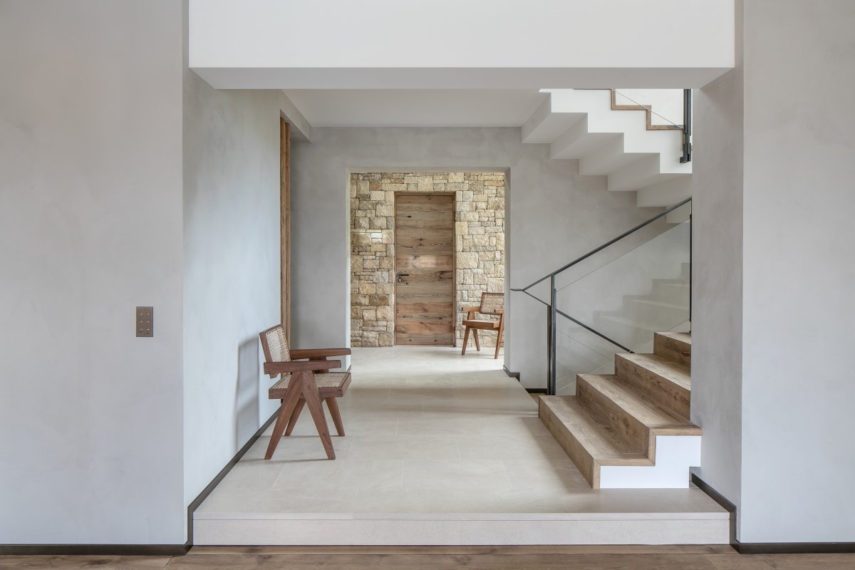 The exterior of the villa embodies a contemporary regional architectural approach. It comes to life via a blend of traditional elements such as ancient stone cladding and a traditional tiered garden planted with Mediterranean essences and contemporary materials such as minimalist windows, concrete and contemporary wooden blinds. The rear of the house reveals an entirely different picture. Sun drenched stone walls, punctuated by openings framed by grey blocks of concrete of different volumes, create a mysterious setting that connotes the artistic language of Land Art, dear to both architects.