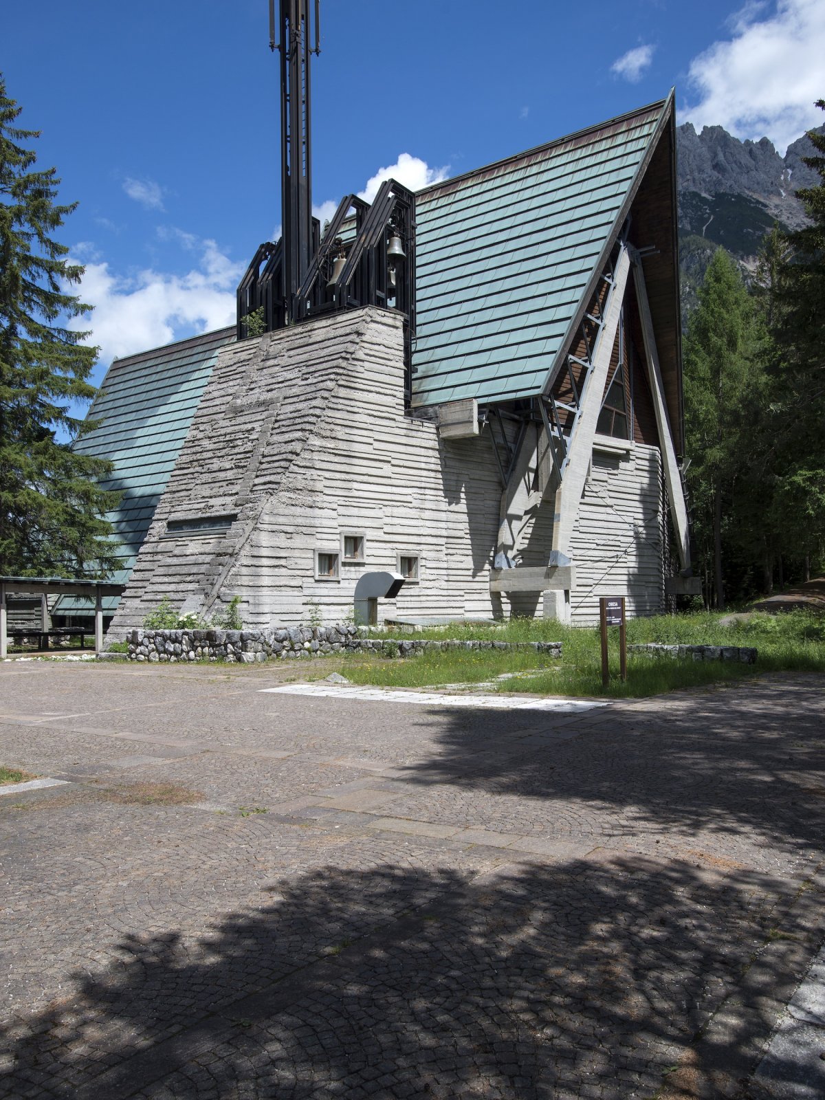 Carlo Alberto Scarpa designed the church in Borca di Cadore, Italy, in collaboration with Studio Gellner. Edoardo Gellner writes: "From the very beginning of the city's planning, the church was placed in a dominant position in the residential area as a terminus for pedestrian routes linking the buildings in the city centre.