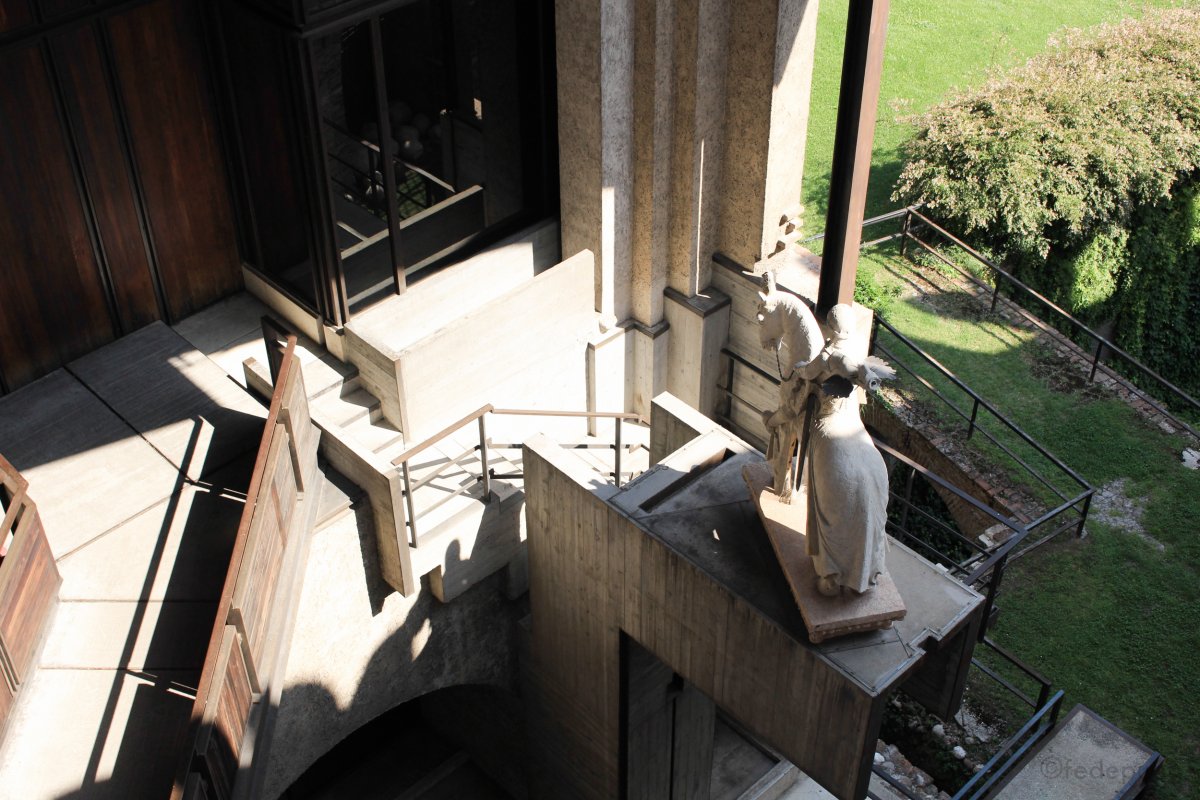 The main interventions are radical modification to the structure and a new path of visit, the opening of a forgotten but existing gate connecting the two main courtyards, passing under the public street of the bridge. Or also the collocation of the Cangrande’s statue, the most precious valuable monument of the veronese history on a 7 meters concrete basament.