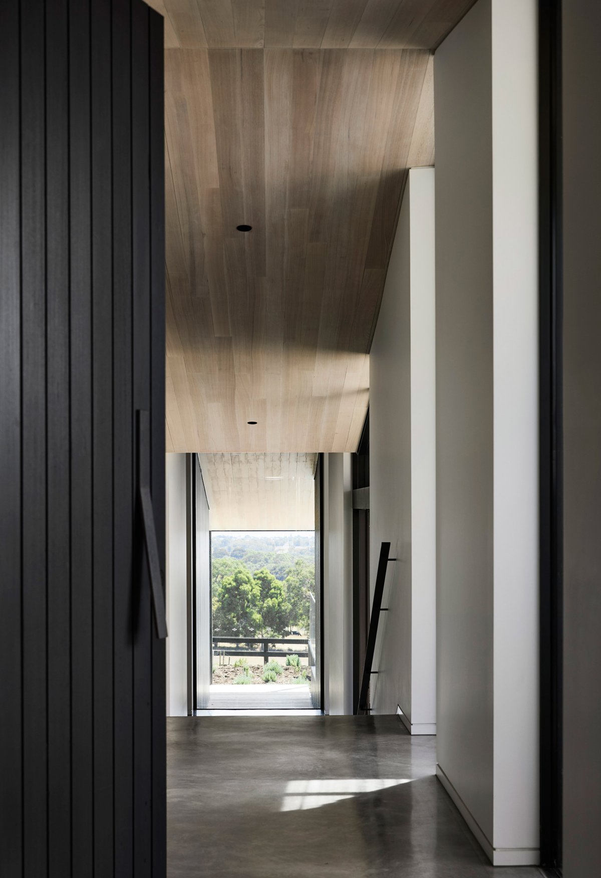 The design intentionally omits ornamentation seeking to minimise the palette of materials. The predominance of the vertical blackened timber cladding defines the façade materiality and, when glimpsed from within, acts to constantly remind occupants of the rural narrative. Designed with an overriding sense of authenticity and rigour, multiple floor levels respond to the natural fall of the surrounding landscape and delineate activity, while a tough materiality of blackened timber, steel, glass, natural stone and concrete are featured in unrestrained sophistication balanced by a softness in the warm oak lining to the ceiling and joinery pieces.
