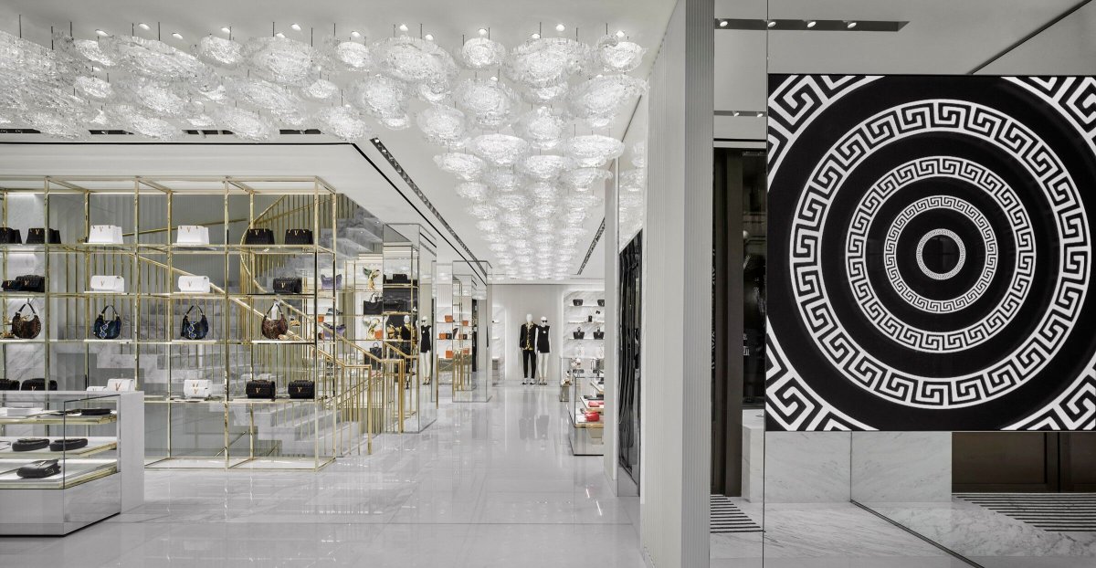 The collections are displayed in a series of "tableaux" mindfully placed around the space, sequencing discovery of the brand's different aspects. The unique feature is a crafted glass ceiling elaborated from Versace's famous Barocco motif and crafted in solid glass by master glassmaker Vistosi.
