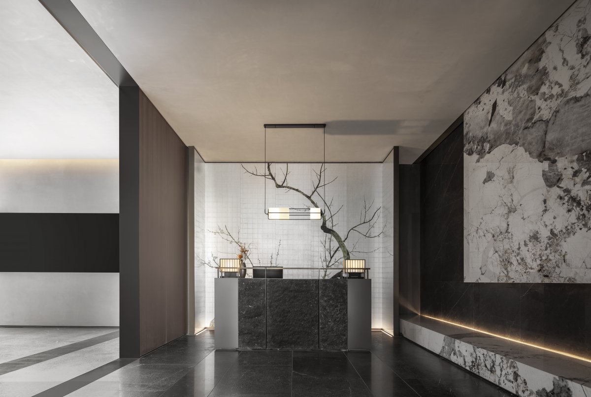 Front porch design sequence of the screen, the construction of the space of the Oriental "ceremony" field, the formation of a psychological sense of ritual transformation of the straight reception desk, supplemented by dexterous and delicate metal components, with exquisite craftsmanship to convey the craftsman spirit, convey the beauty of Oriental etiquette. The background subject is taken from the classical Chinese painting screen, which echoes with the natural ink texture of the stone, to build a three-dimensional painting space.