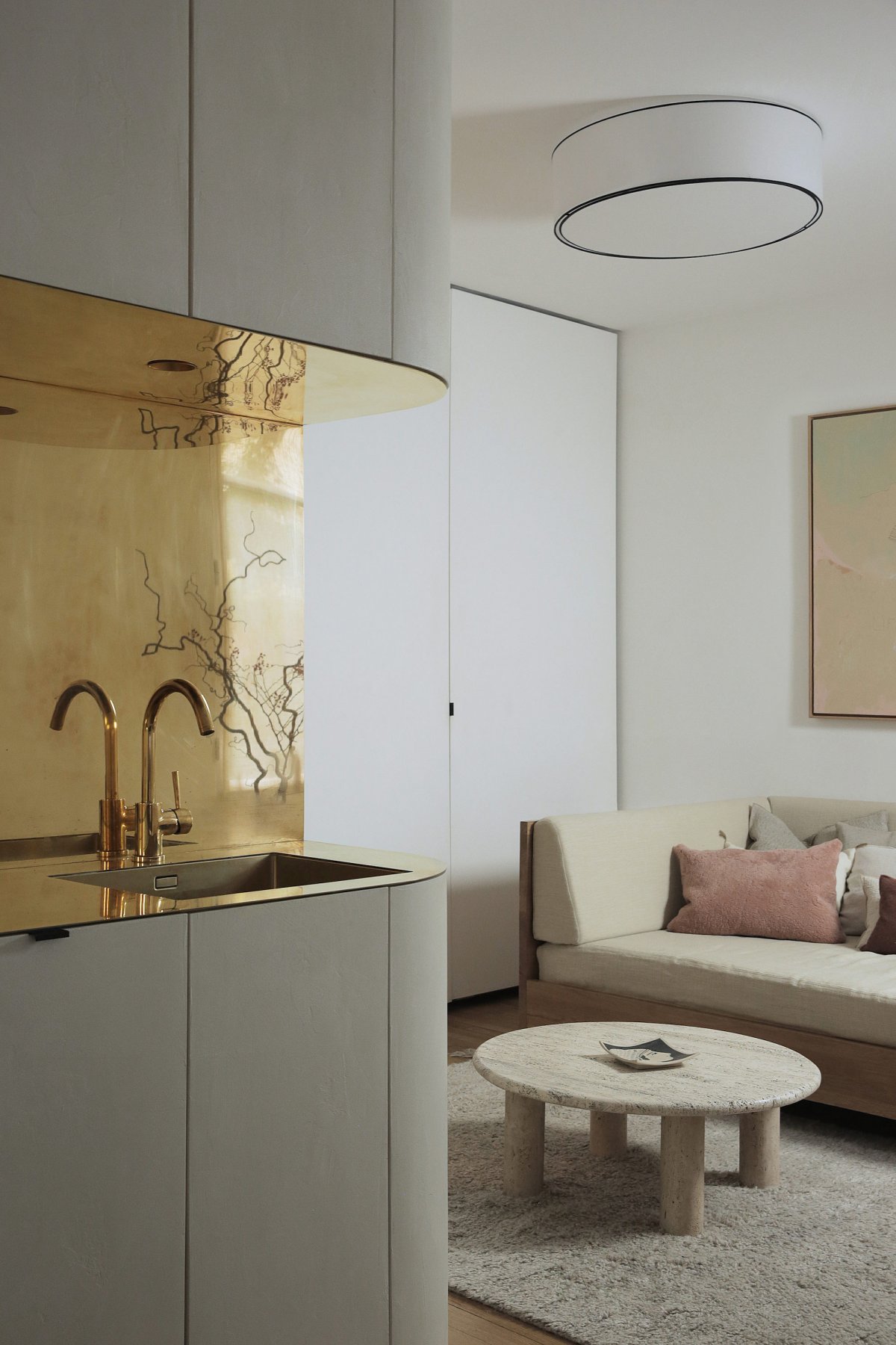 Turning the rectangular space into an L-shaped room, the designers decorated the apartment in pastel colours, built a separate bathroom, installed a linear kitchen along the exterior wall and used polished brass panels. This decision allowed the studio to be effectively zoned, dividing the living and dining rooms.