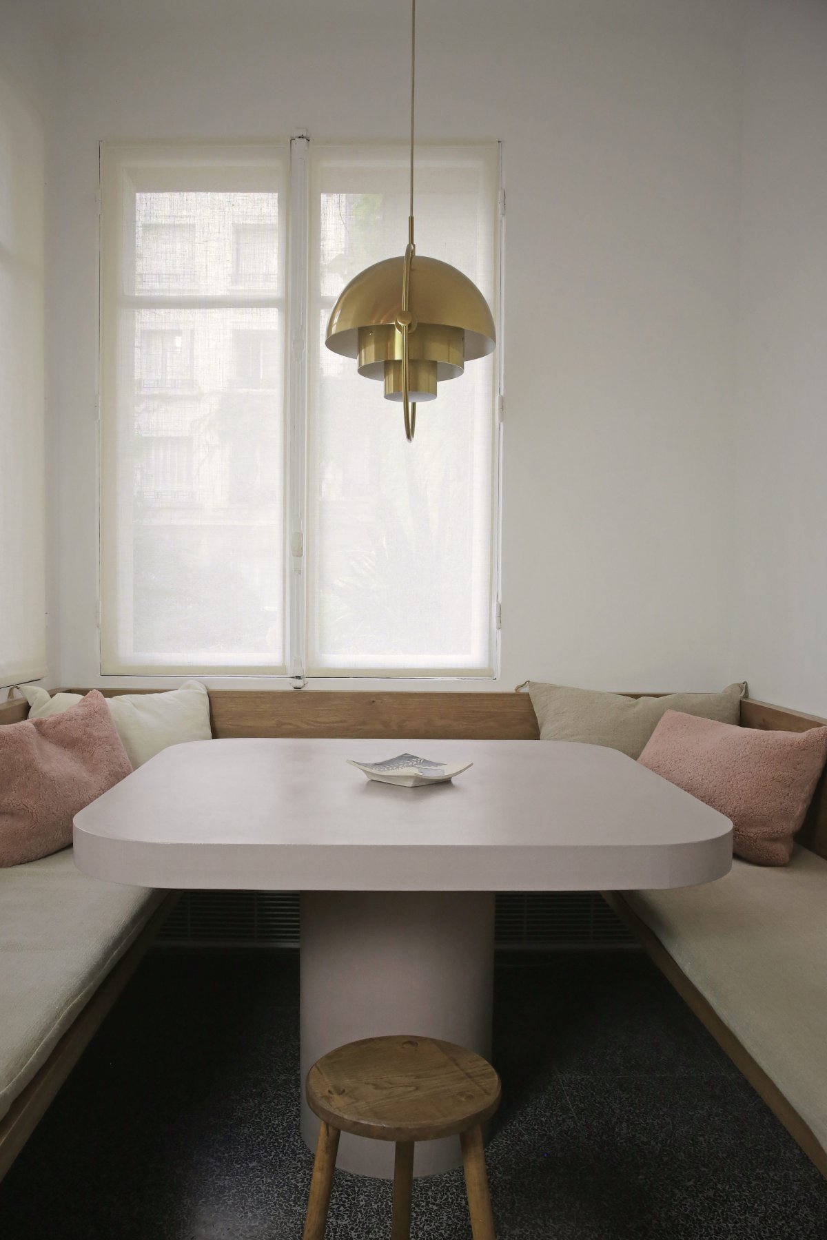 A functional table with rounded corners in the compact dining room is surrounded by a built-in U-shaped wooden stool. Matte oak surfaces and warm white shadows used to paint the walls and ceiling create a noble backdrop against which the kitchen's gold decor looks like a delicate jewel in an ivory box.