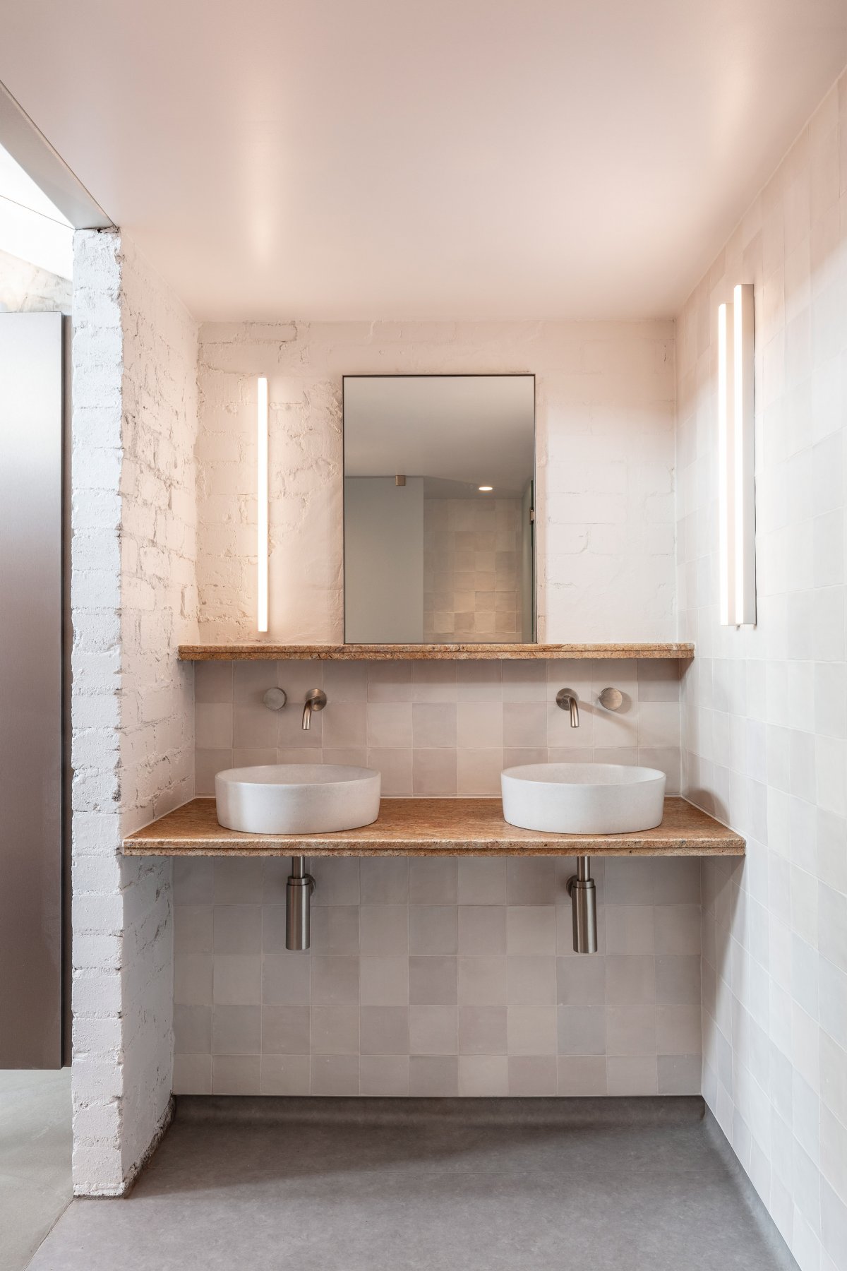 To enhance Shelter's industrial shell and temper its pink-hued timber walls, Esoteriko has used stainless steel to create several elements.This includes the guest lockers and curved screens that wrap around the changing and treatment rooms. These have purposefully been made to sit below the ceilings to amplify the centre's lofty interior.