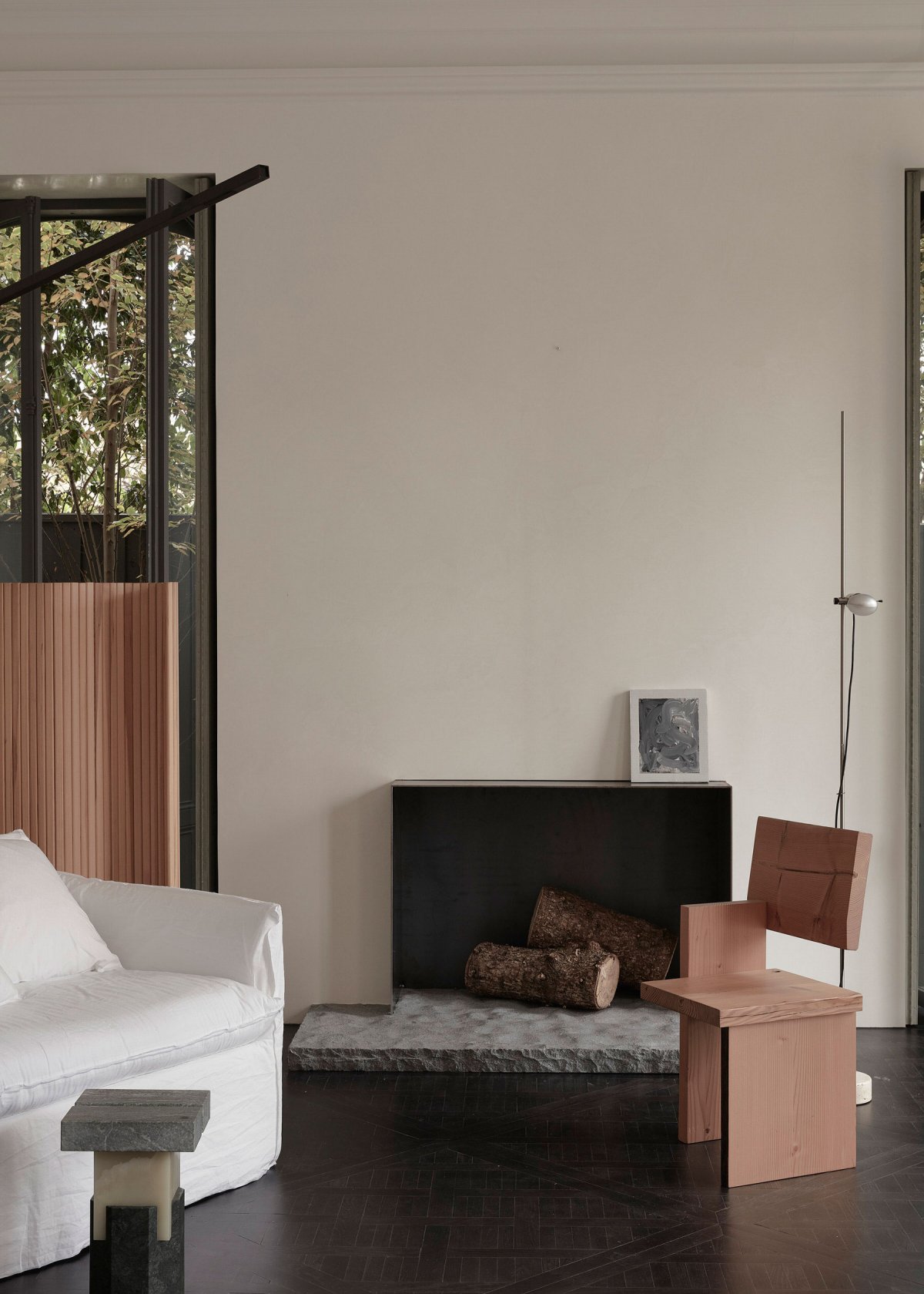 The simple tone of the interior reflects the deconstruction of the marble character. Black steel floor-to-ceiling shutters line the white walls, black steel also forms the circular atrium, and a black grid ceiling above the kitchen area. In the bedroom, wheat-linen curtains glowed softly against woollen carpets. Smoky grey delicate handles are also used in cabinets. A pendant, floating gently next to a stone fireplace, is consistent in texture and has a touch of luxury.