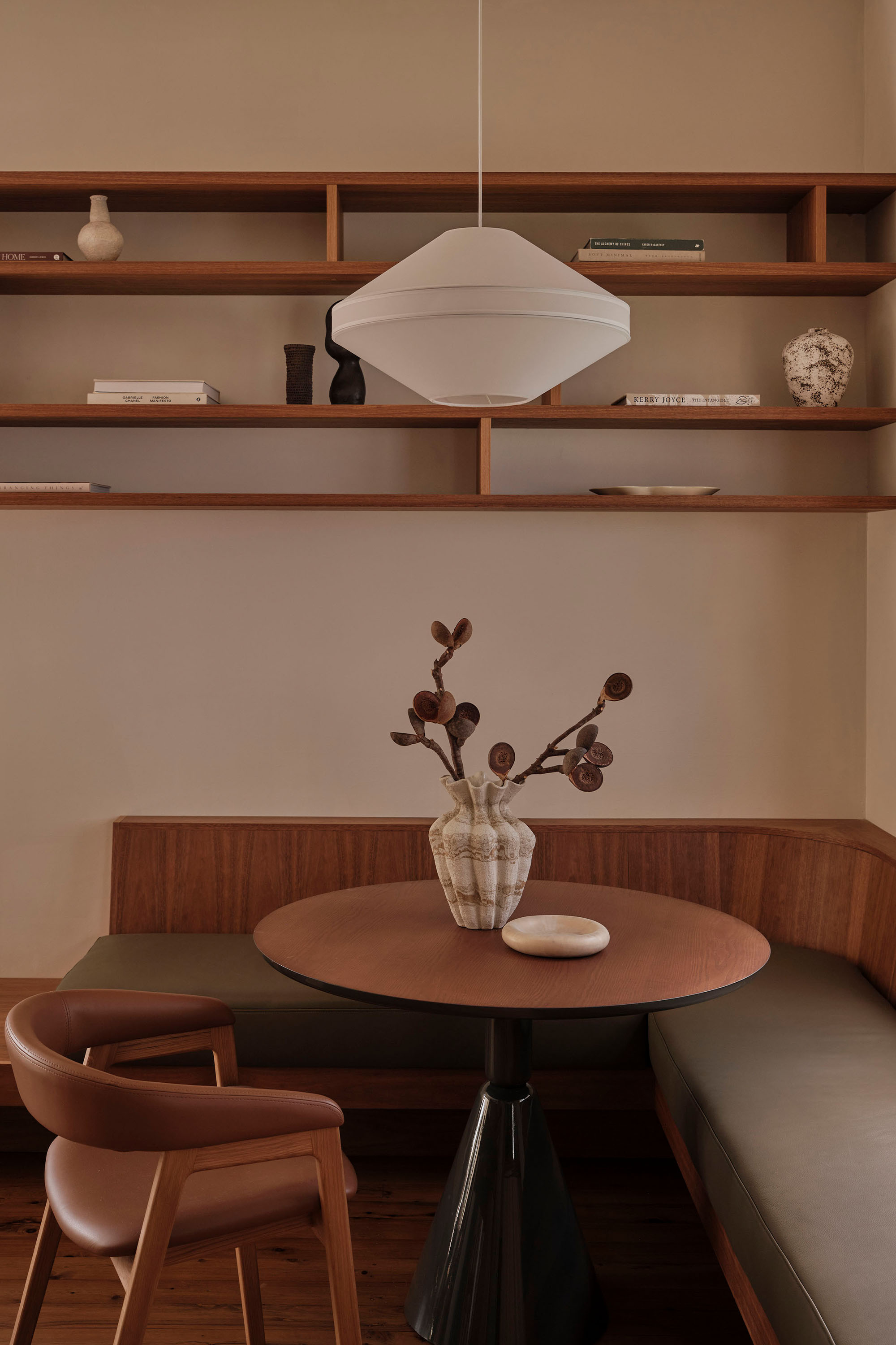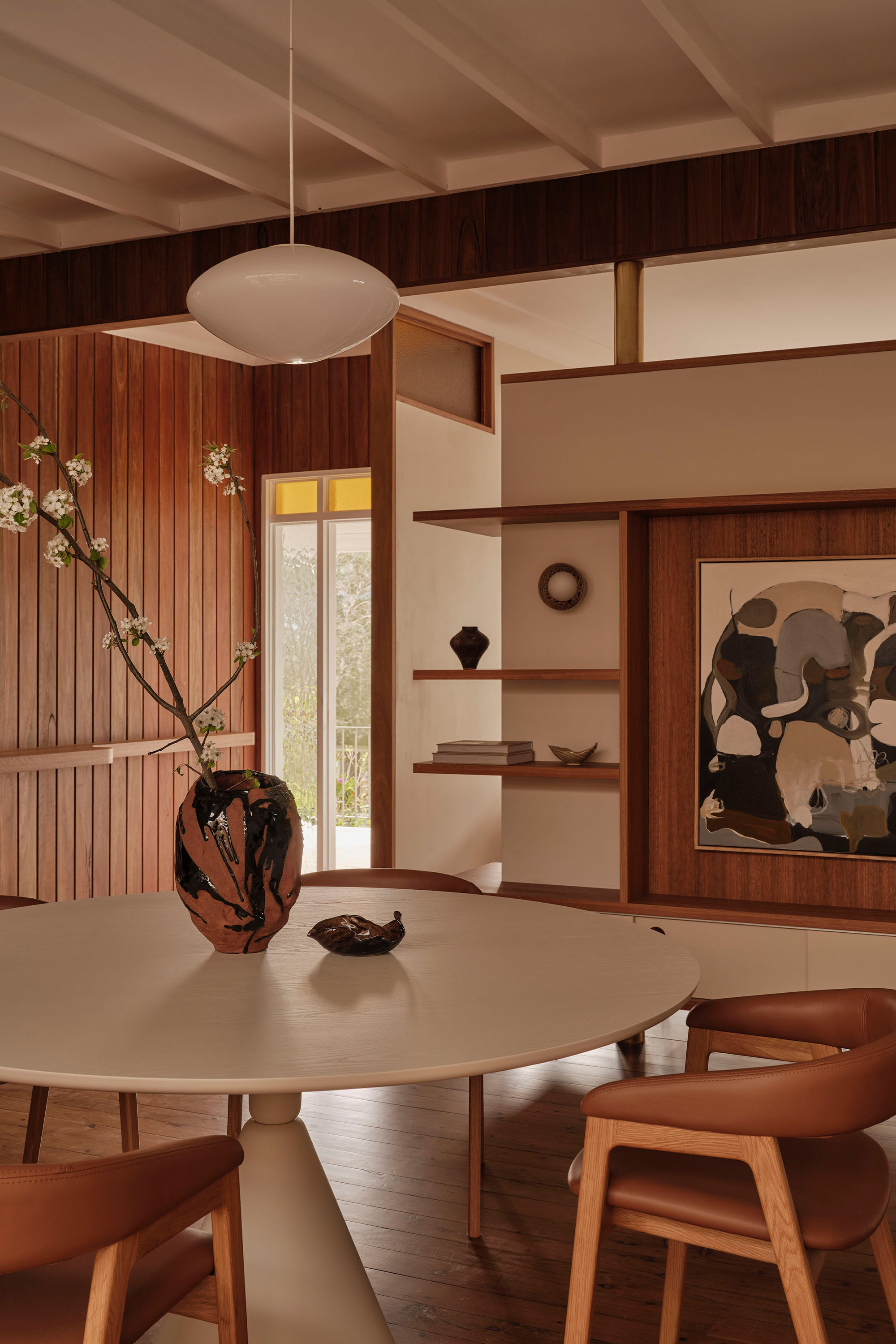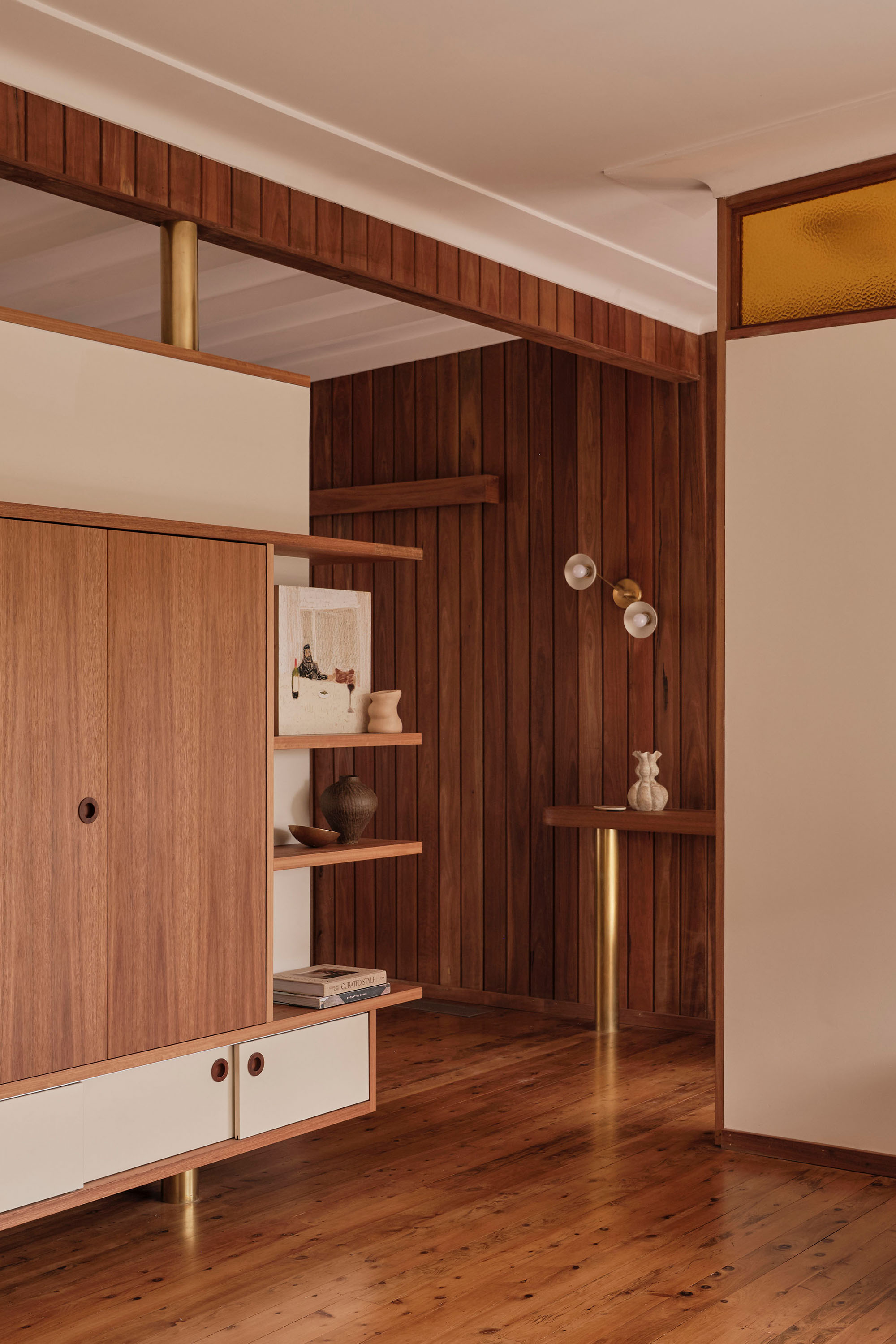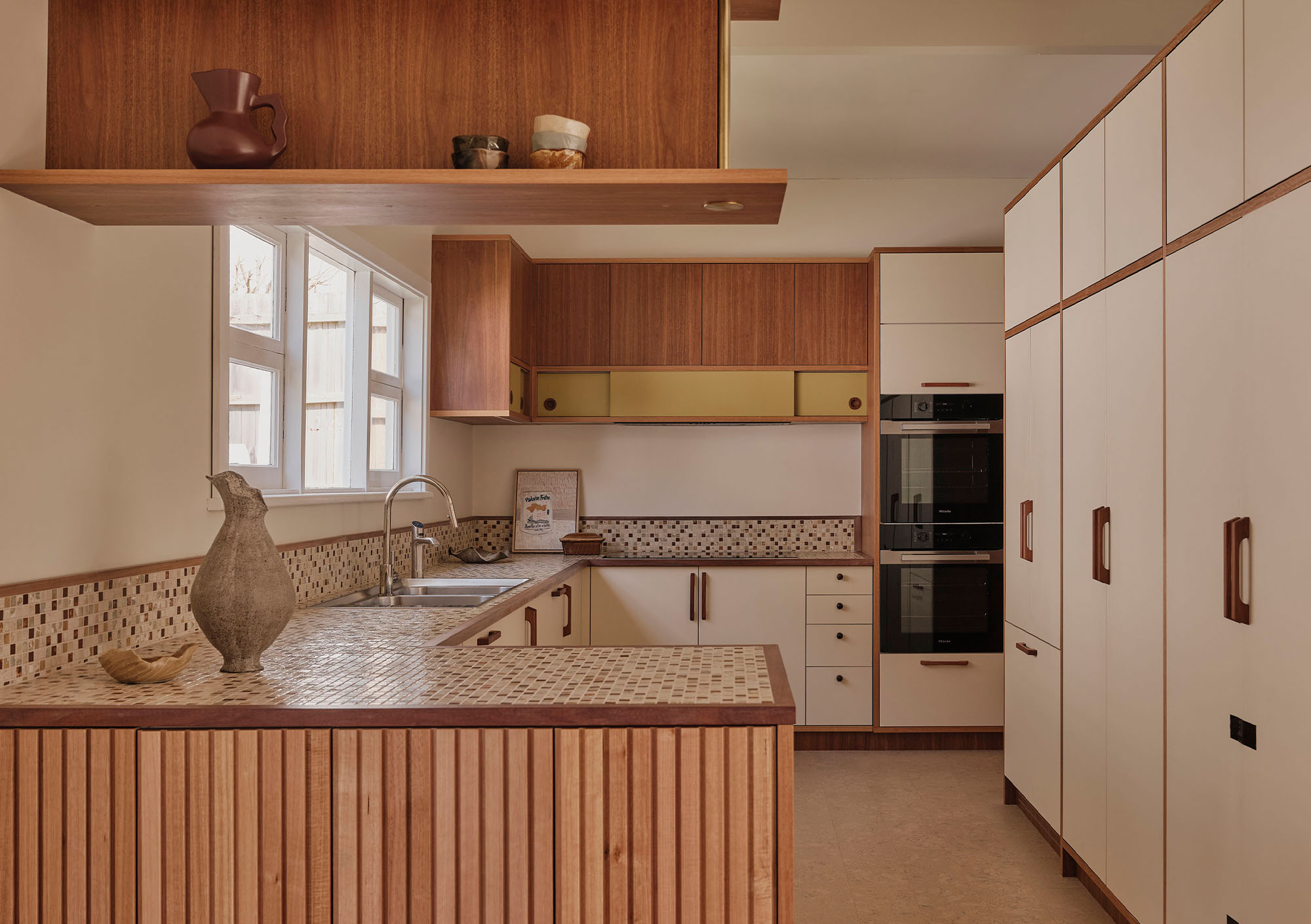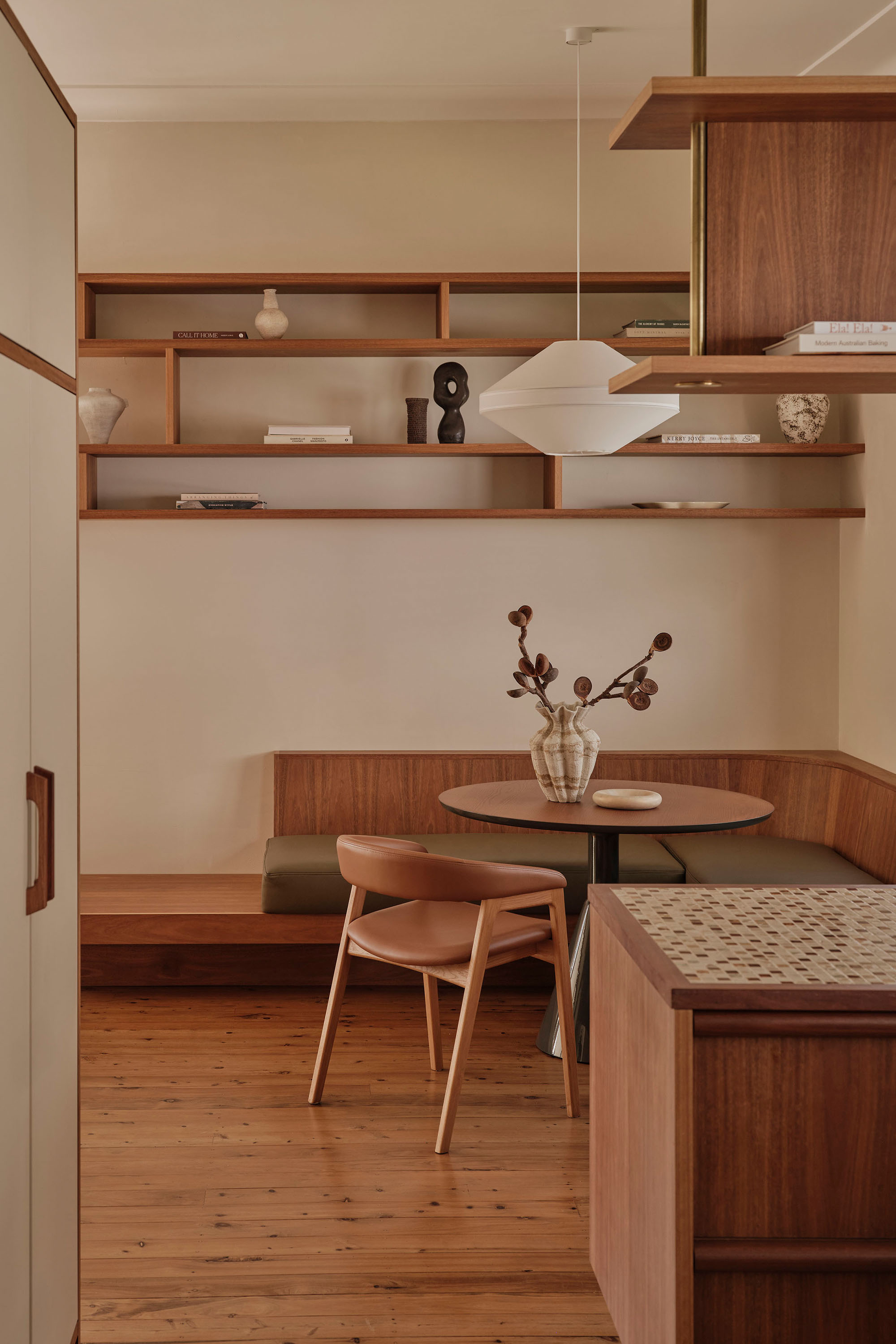 Throughout, materials, colour, and form reference the design language of the era. The kitchen is a showcase of retro expression, with laminate surfaces paired with mosaic benchtops and custom timber hardware. Bespoke joinery features slim linear profiles, segmented shelving, and cantilevered banquette seating, all echoing the geometric forms of the 1960s.