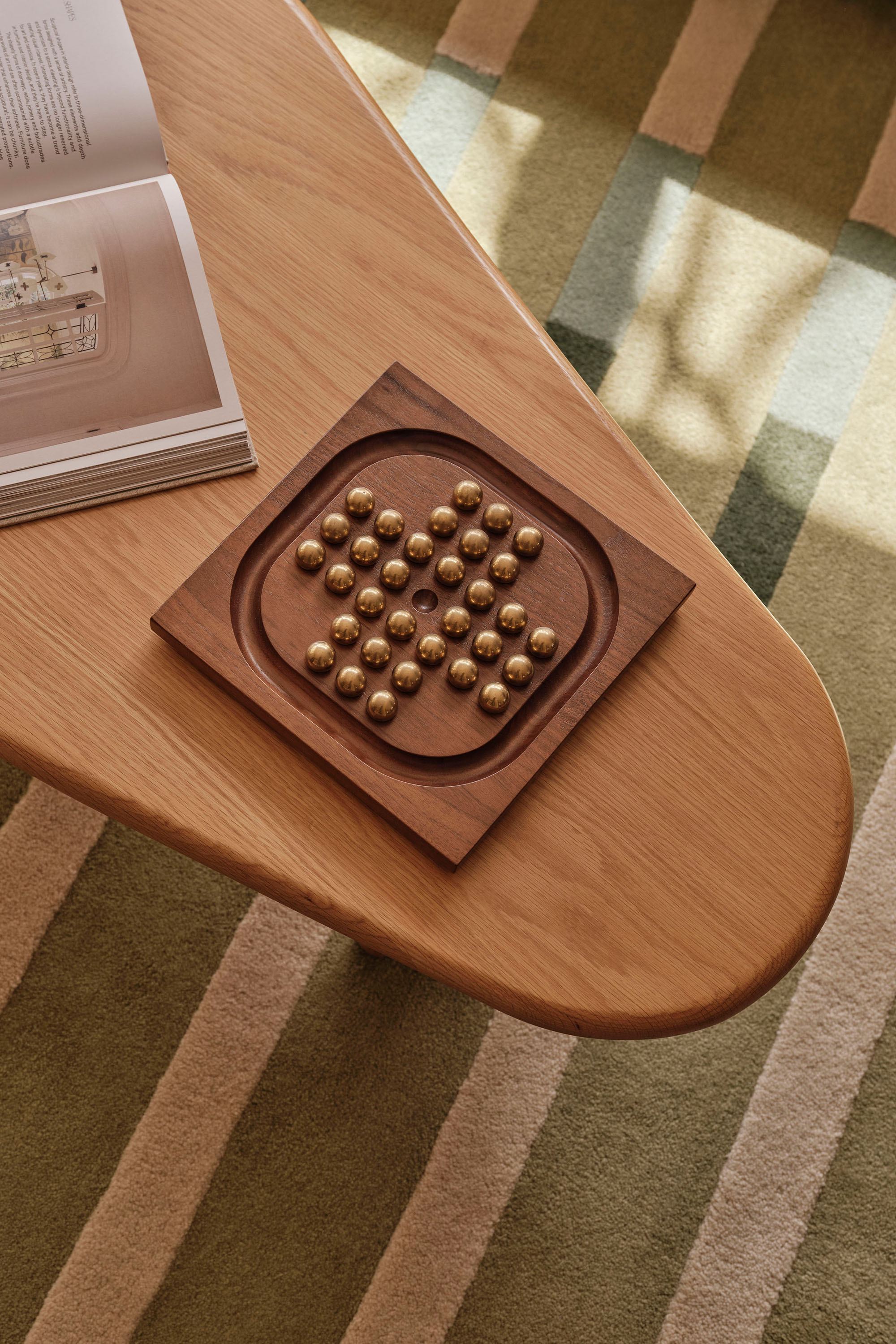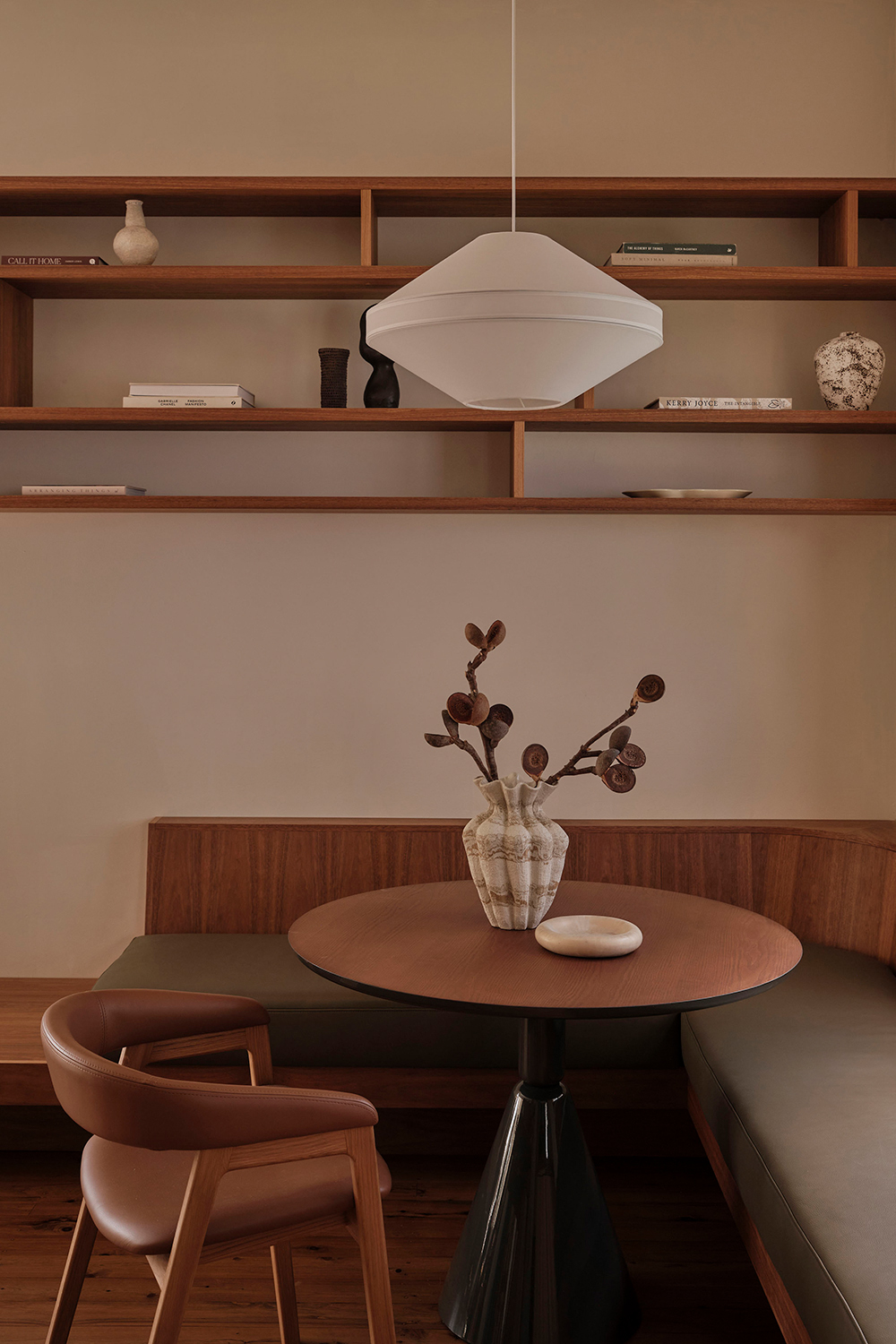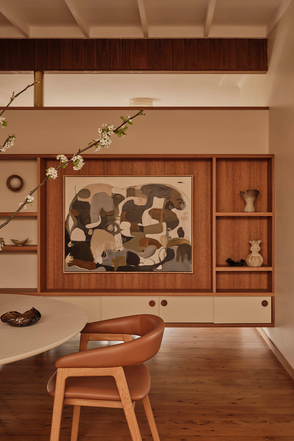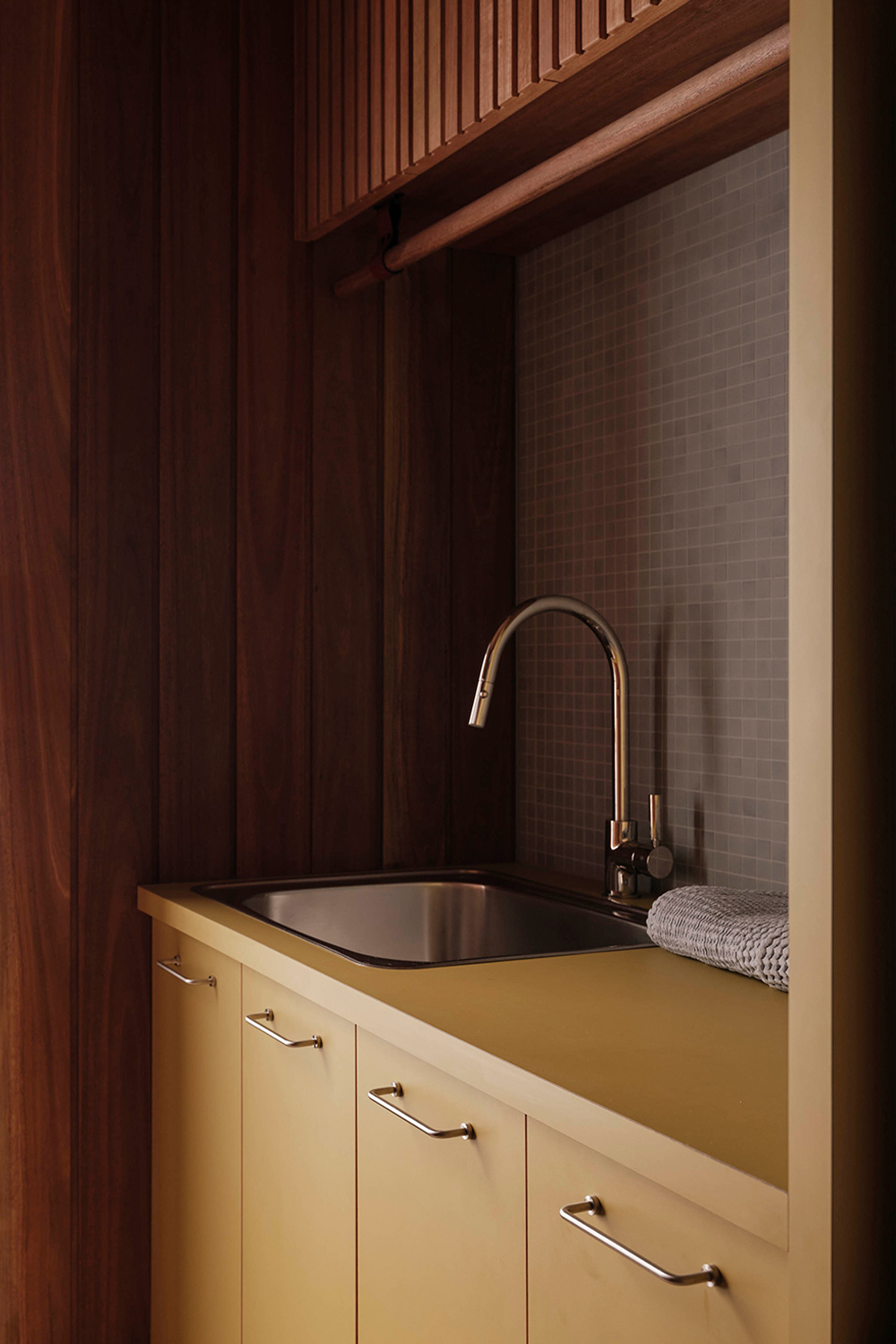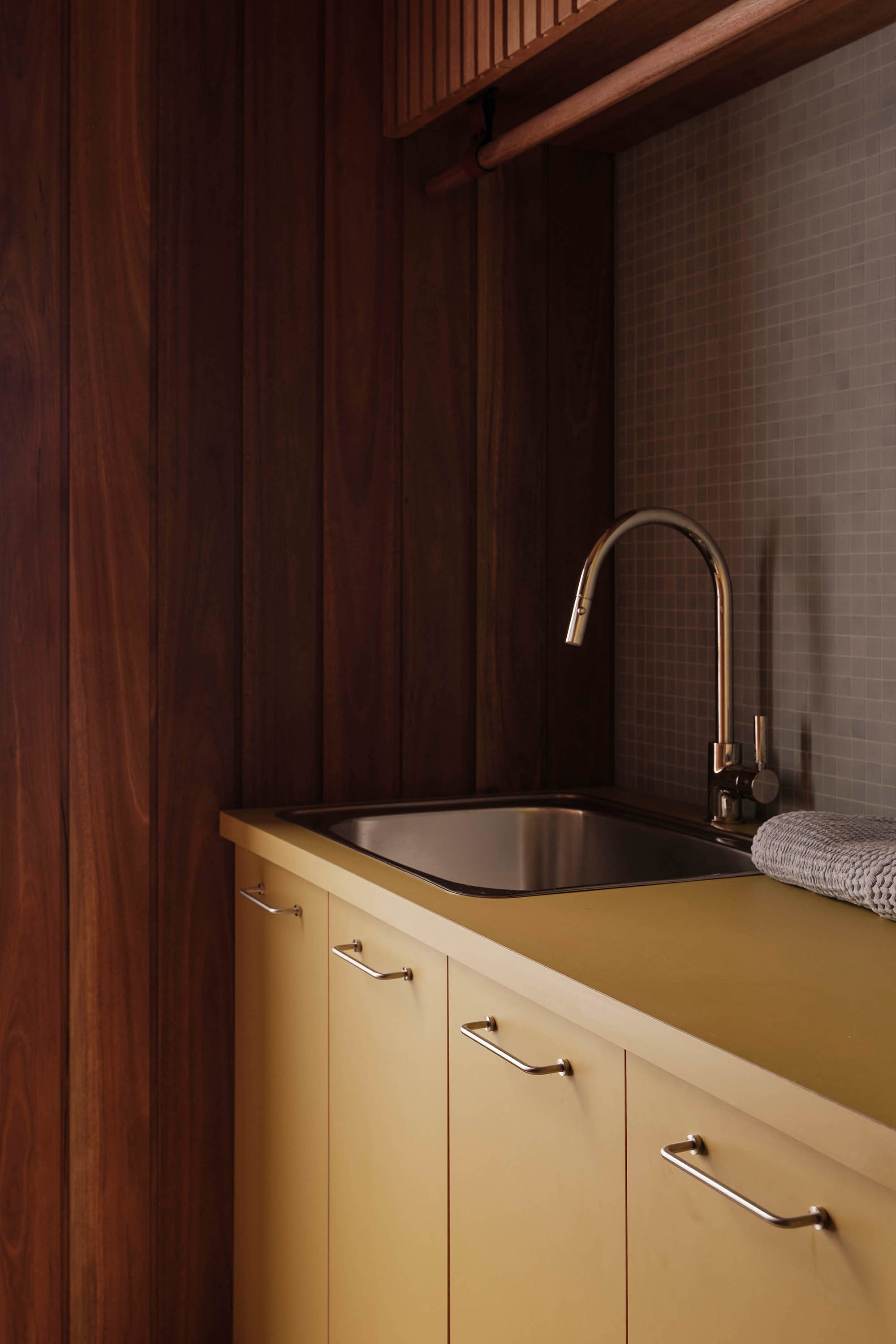 Throughout, materials, colour, and form reference the design language of the era. The kitchen is a showcase of retro expression, with laminate surfaces paired with mosaic benchtops and custom timber hardware. Bespoke joinery features slim linear profiles, segmented shelving, and cantilevered banquette seating, all echoing the geometric forms of the 1960s.