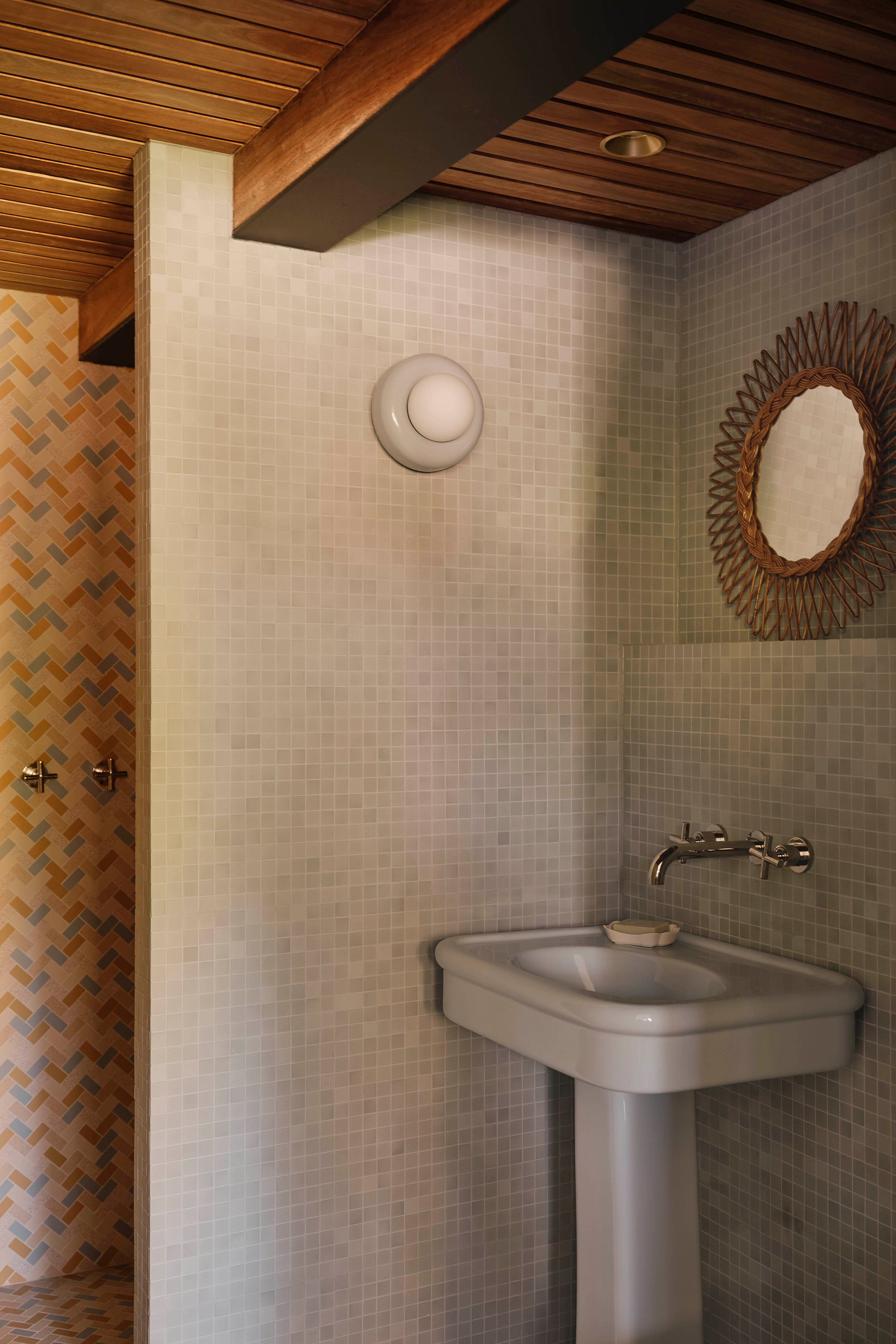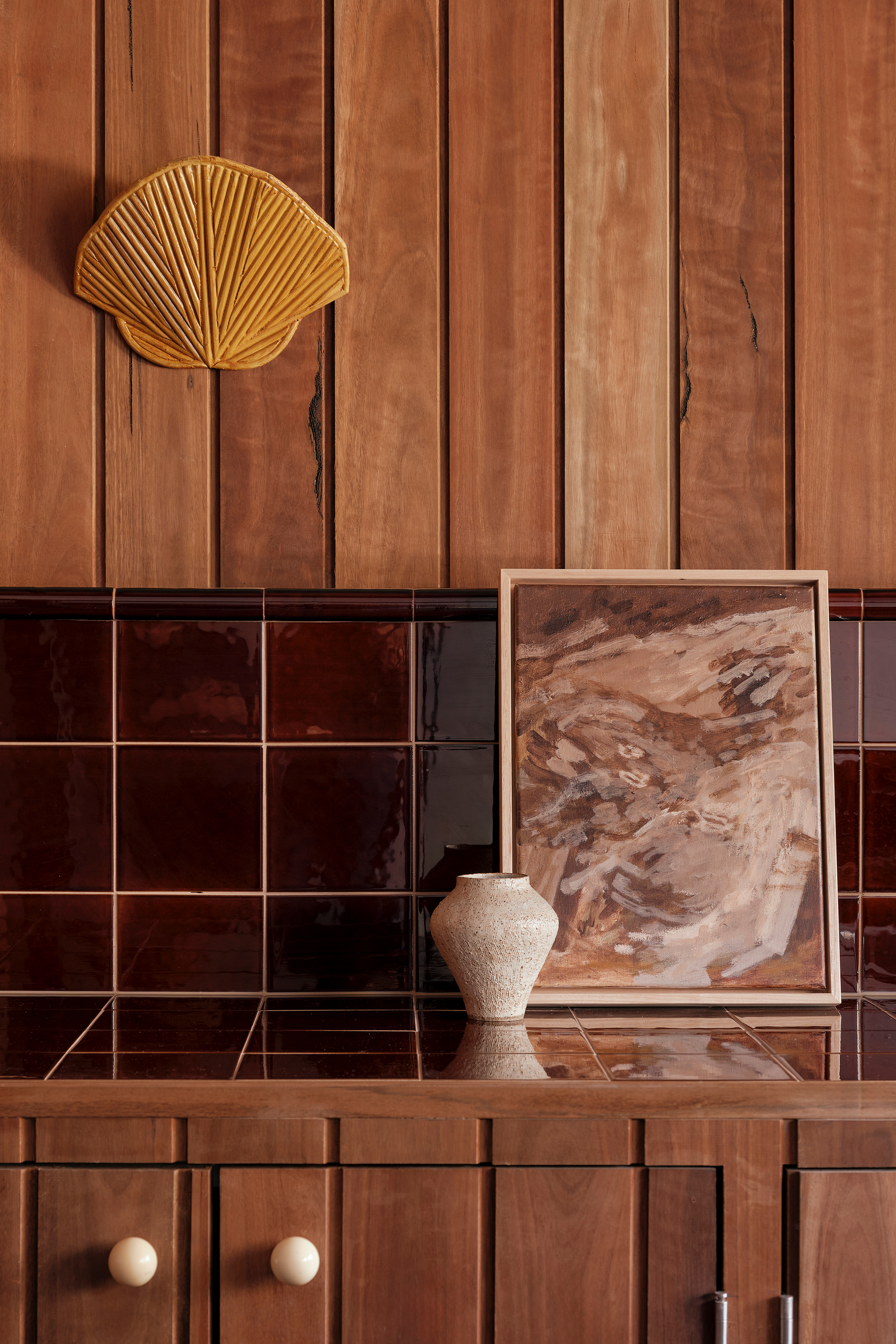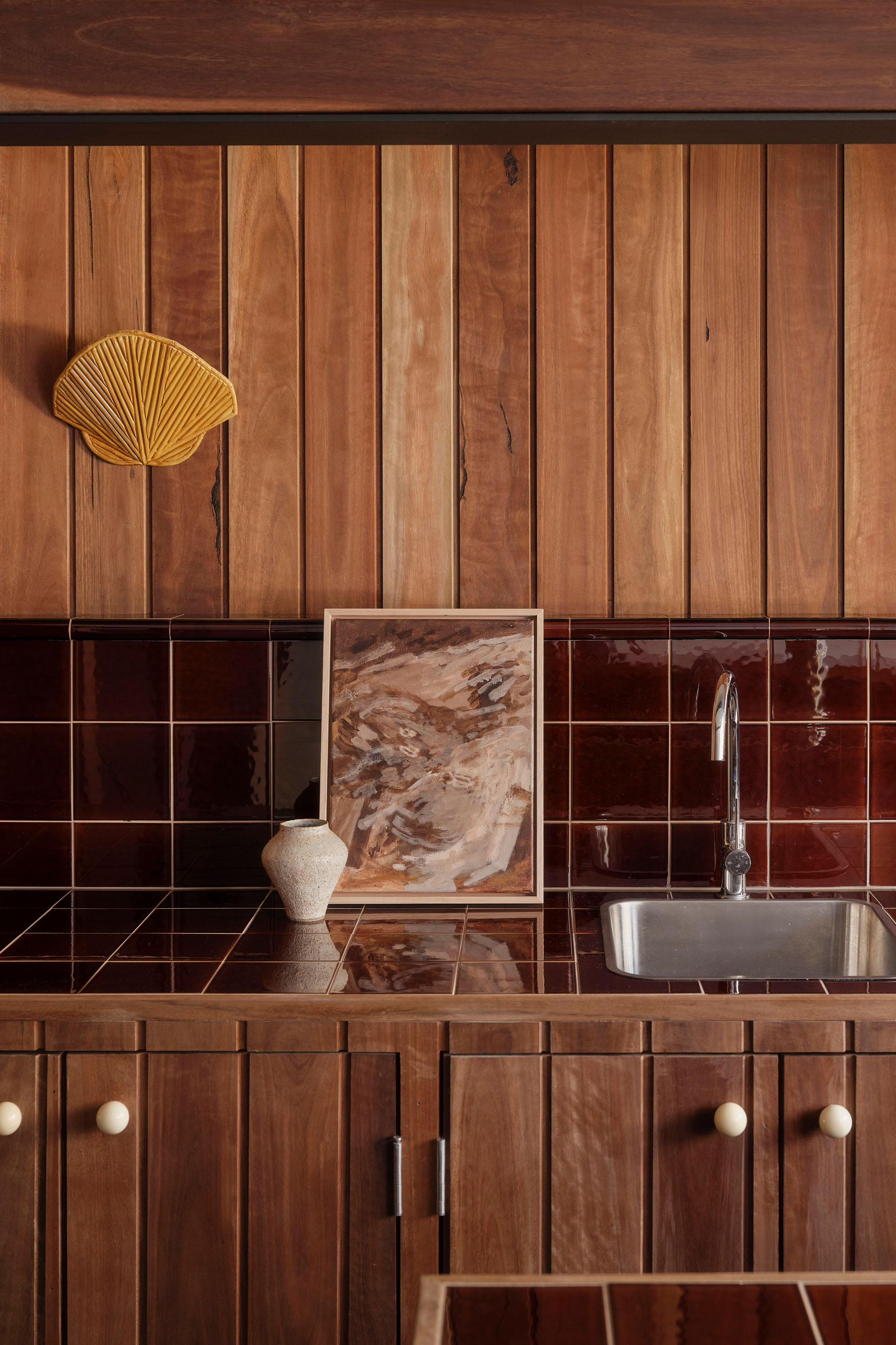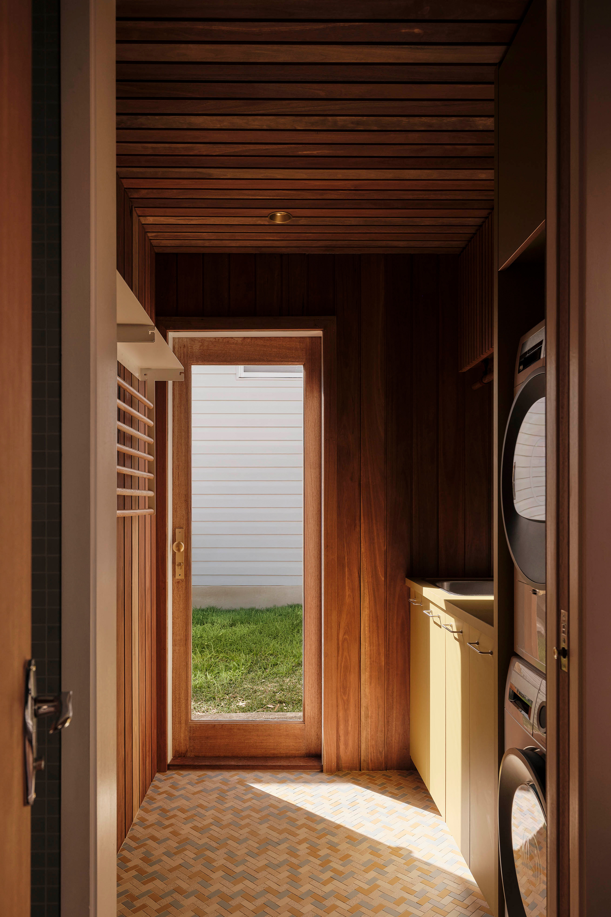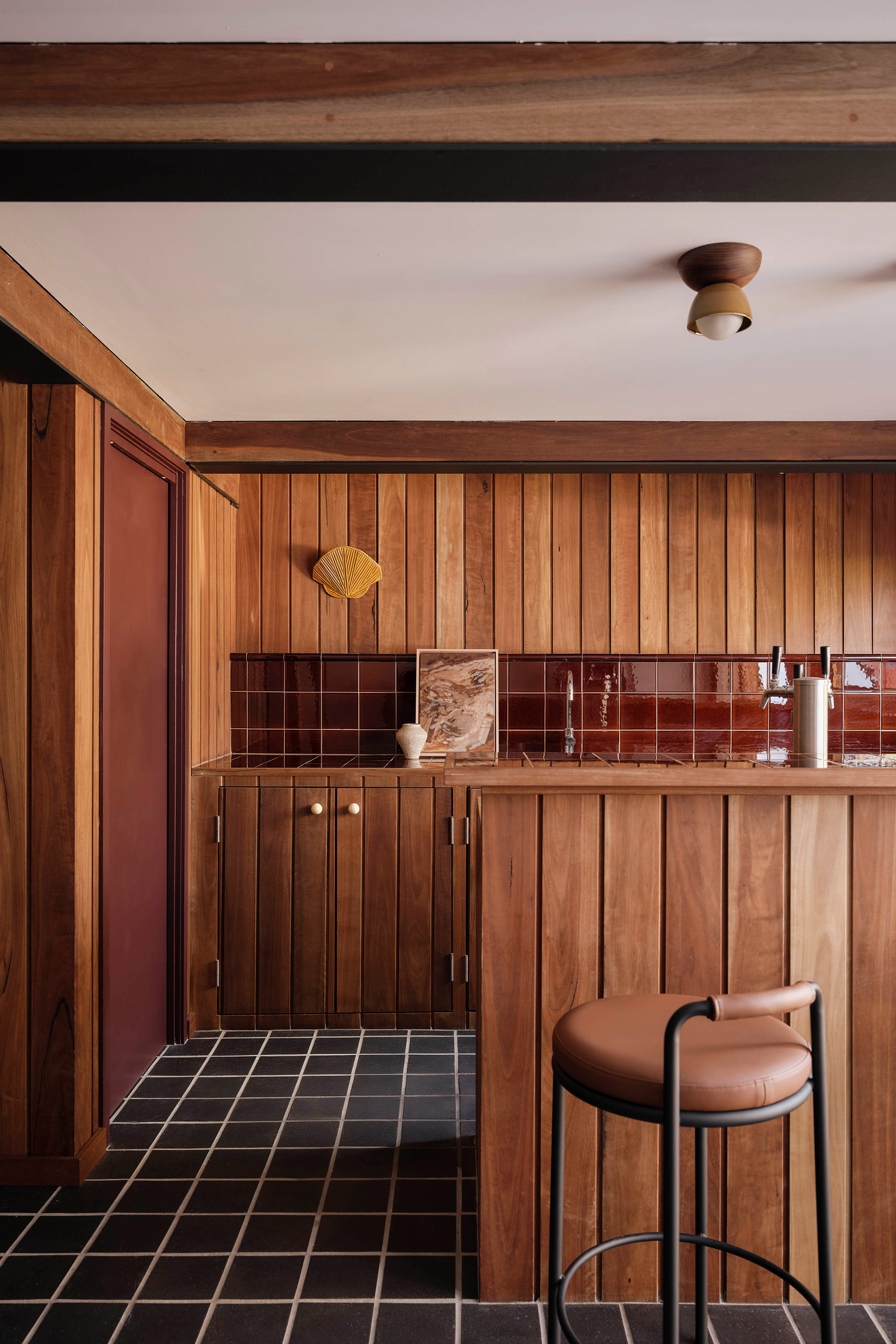 The service spaces were refined for modern convenience, with a reconfigured laundry and powder room designed to function independently. Downstairs, a playful new pool bar and lounge were introduced, transforming a former storage room into a bold social hub. Patterned tiles, pedestal bases, shell lights, and textured timbers create the feeling of a 1960’s pool bar rediscovered and revived, complete with an adjoining ensuite in preparation for the reinstatement of the original pool.