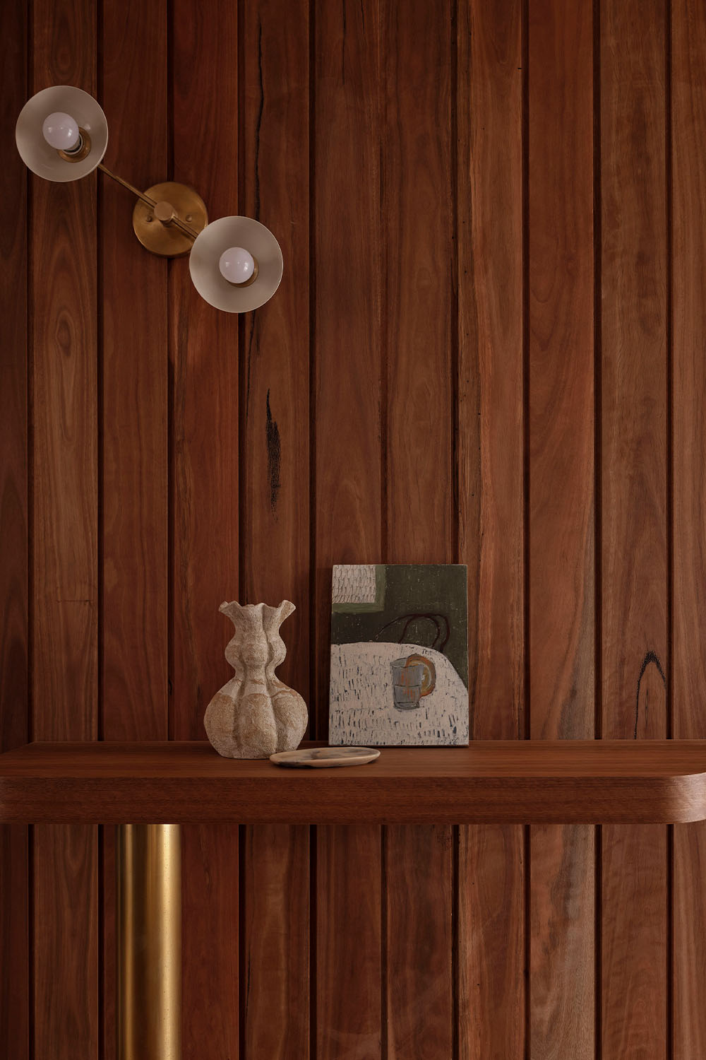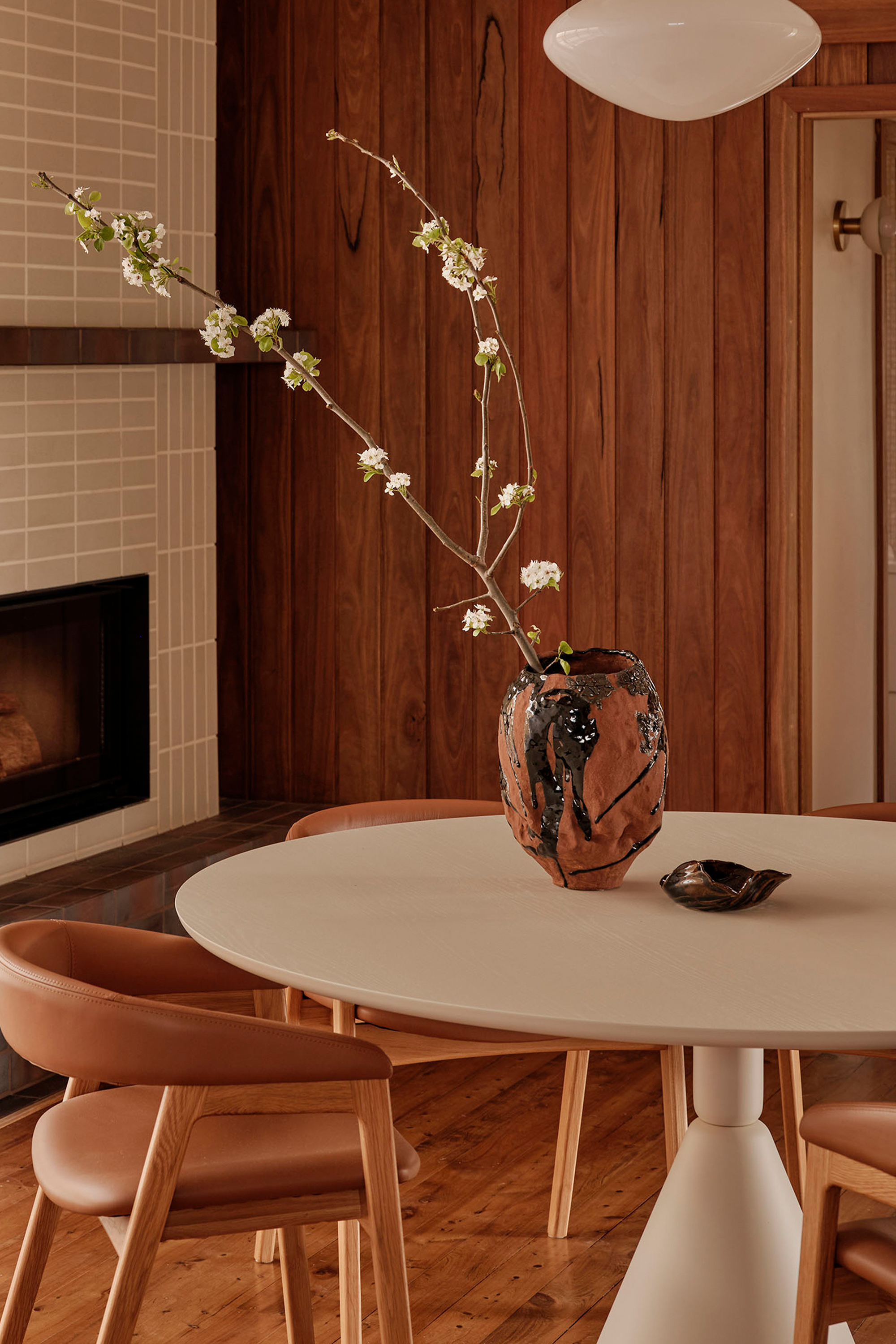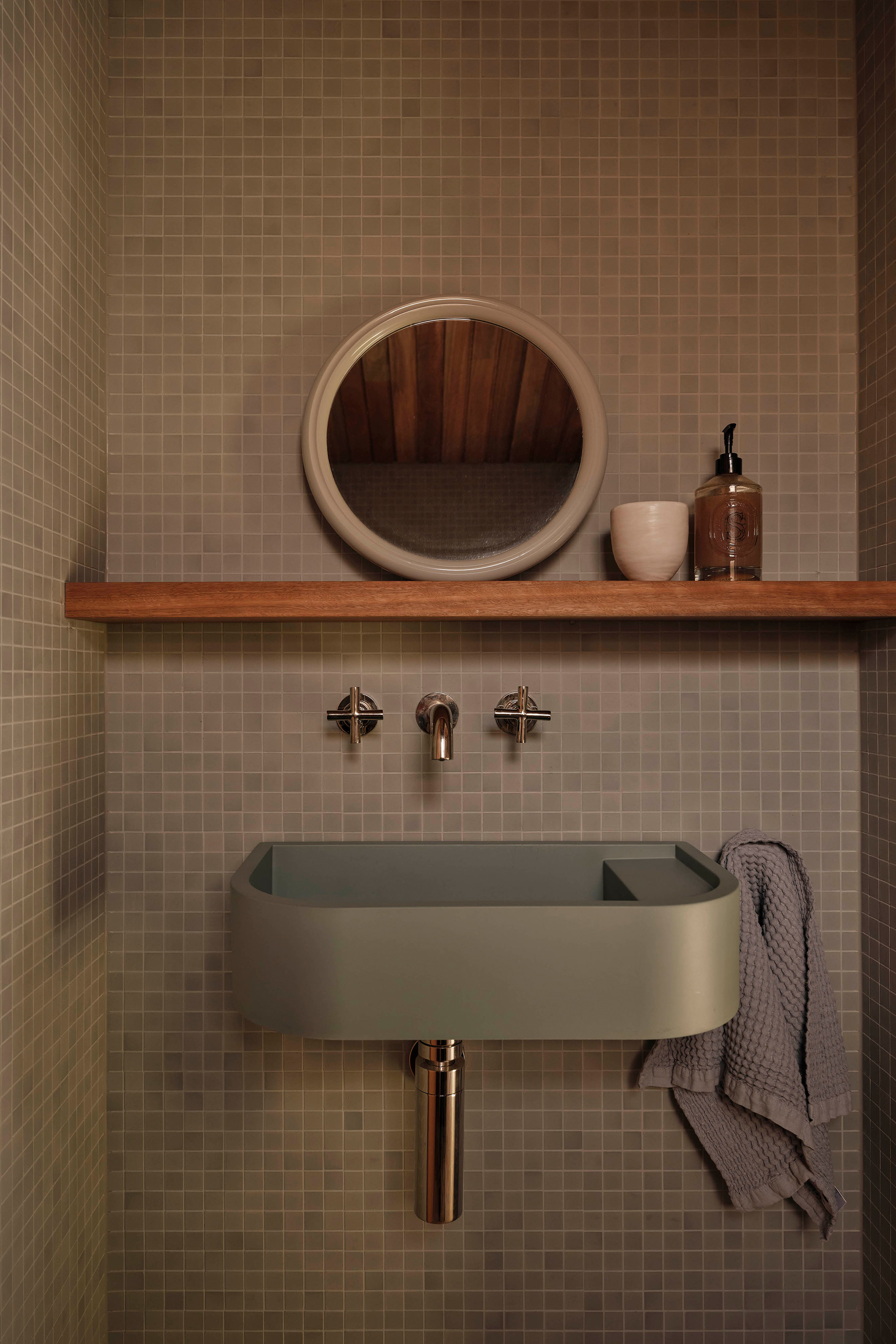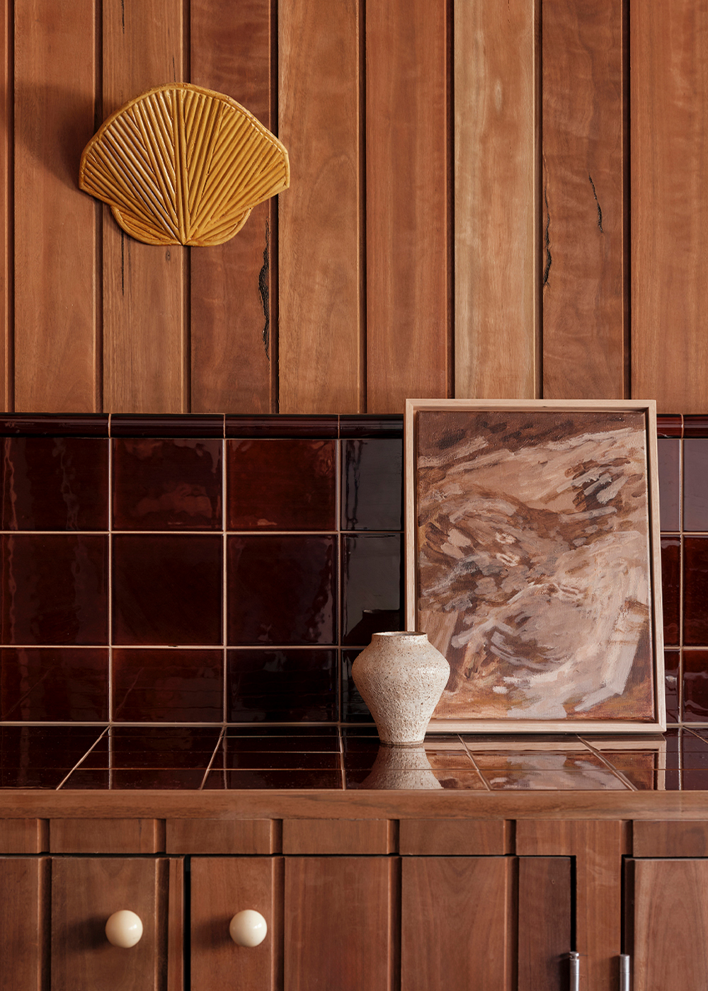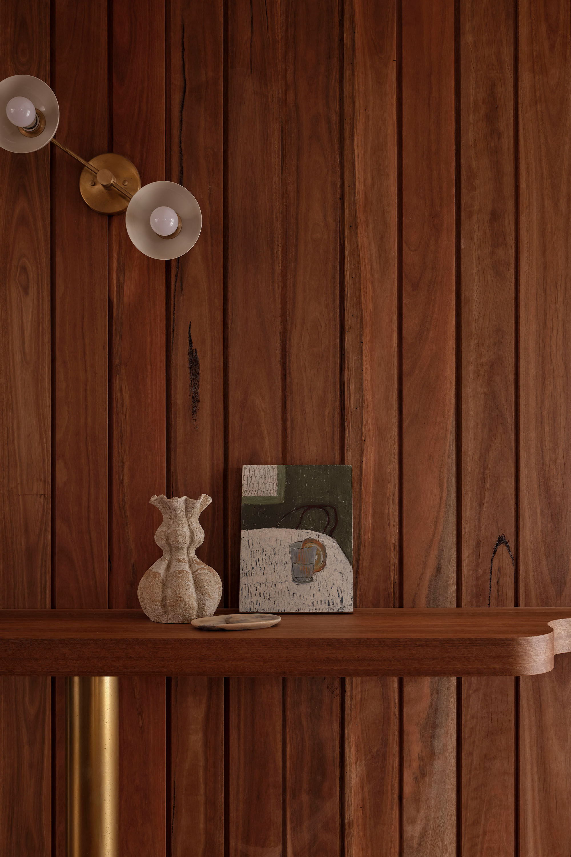 The service spaces were refined for modern convenience, with a reconfigured laundry and powder room designed to function independently. Downstairs, a playful new pool bar and lounge were introduced, transforming a former storage room into a bold social hub. Patterned tiles, pedestal bases, shell lights, and textured timbers create the feeling of a 1960’s pool bar rediscovered and revived, complete with an adjoining ensuite in preparation for the reinstatement of the original pool.