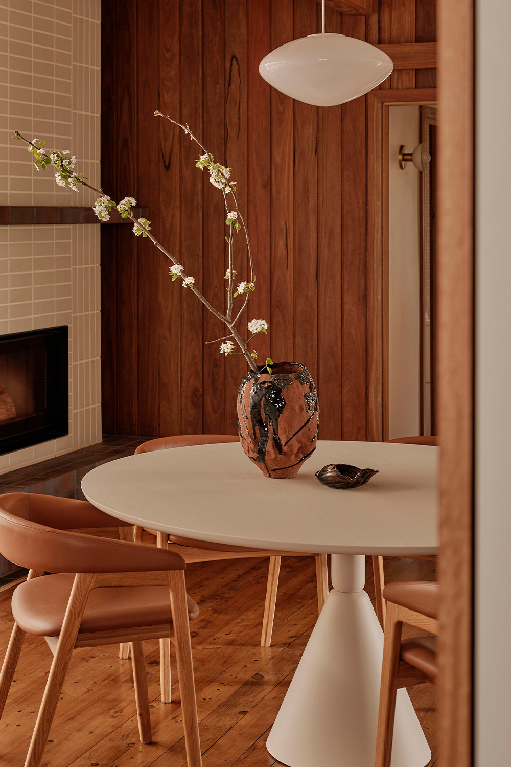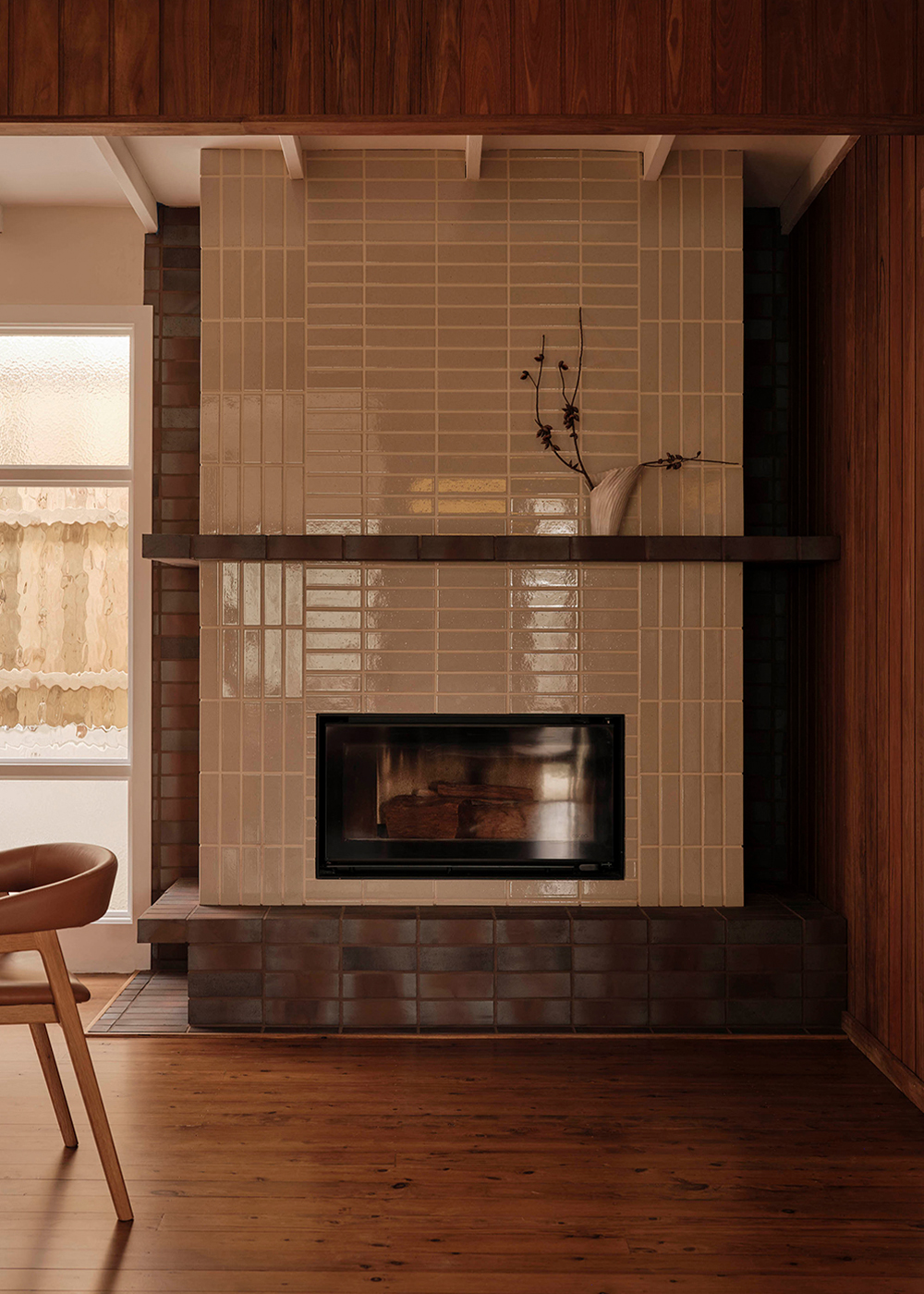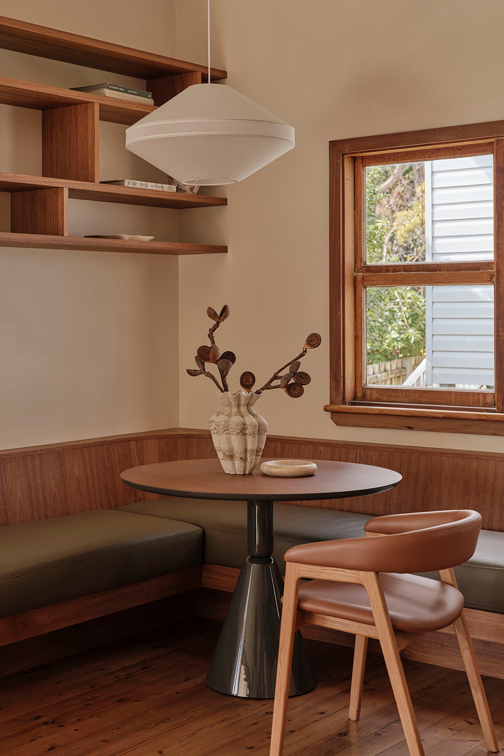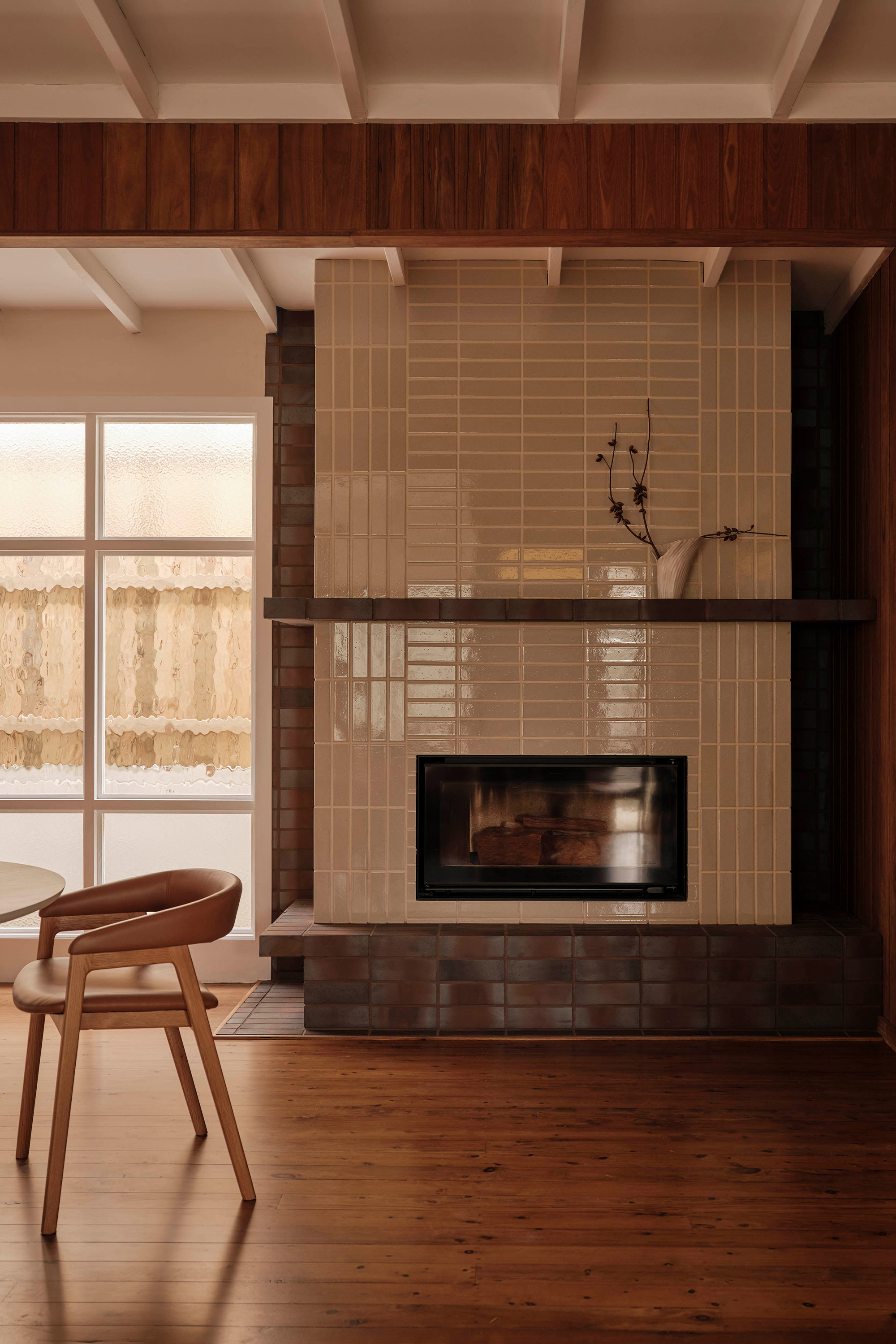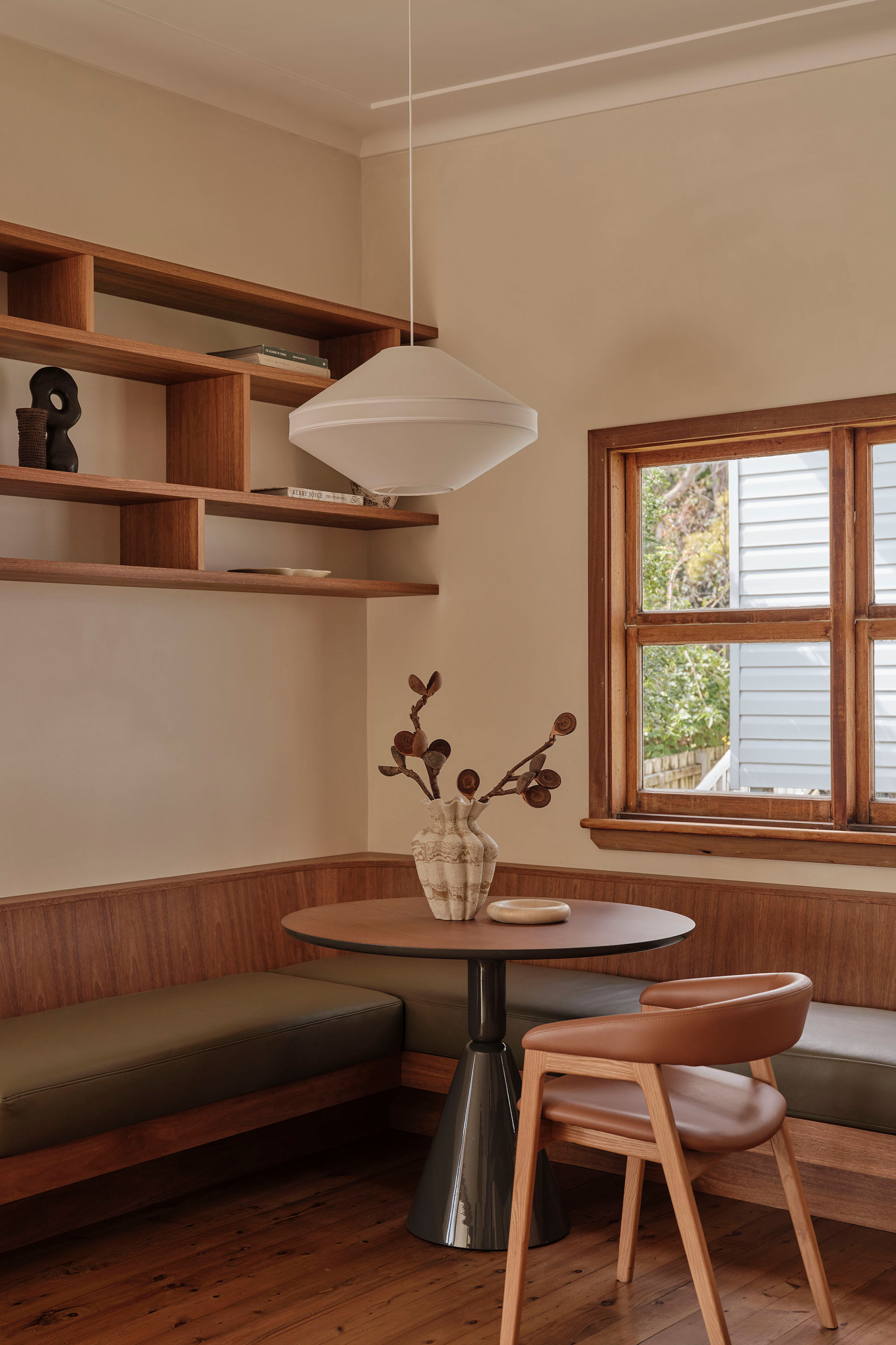 Spatially, the entry and living areas were reimagined to improve flow and connection. The oncepokey foyer was opened up into a semi-open plan arrangement, where a new fireplace and retro glass windows reference the home’s original verandah. A custom joinery unit acts as both divider and connector between dining and living spaces, offering shelving, storage, and an integrated TV console tailored to the client’s lifestyle. A built-in banquette further enhances the living space, providing a casual dining spot that links kitchen and lounge while preserving the separation of rooms, in keeping with retro floorplans.