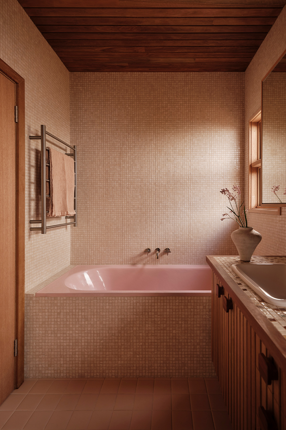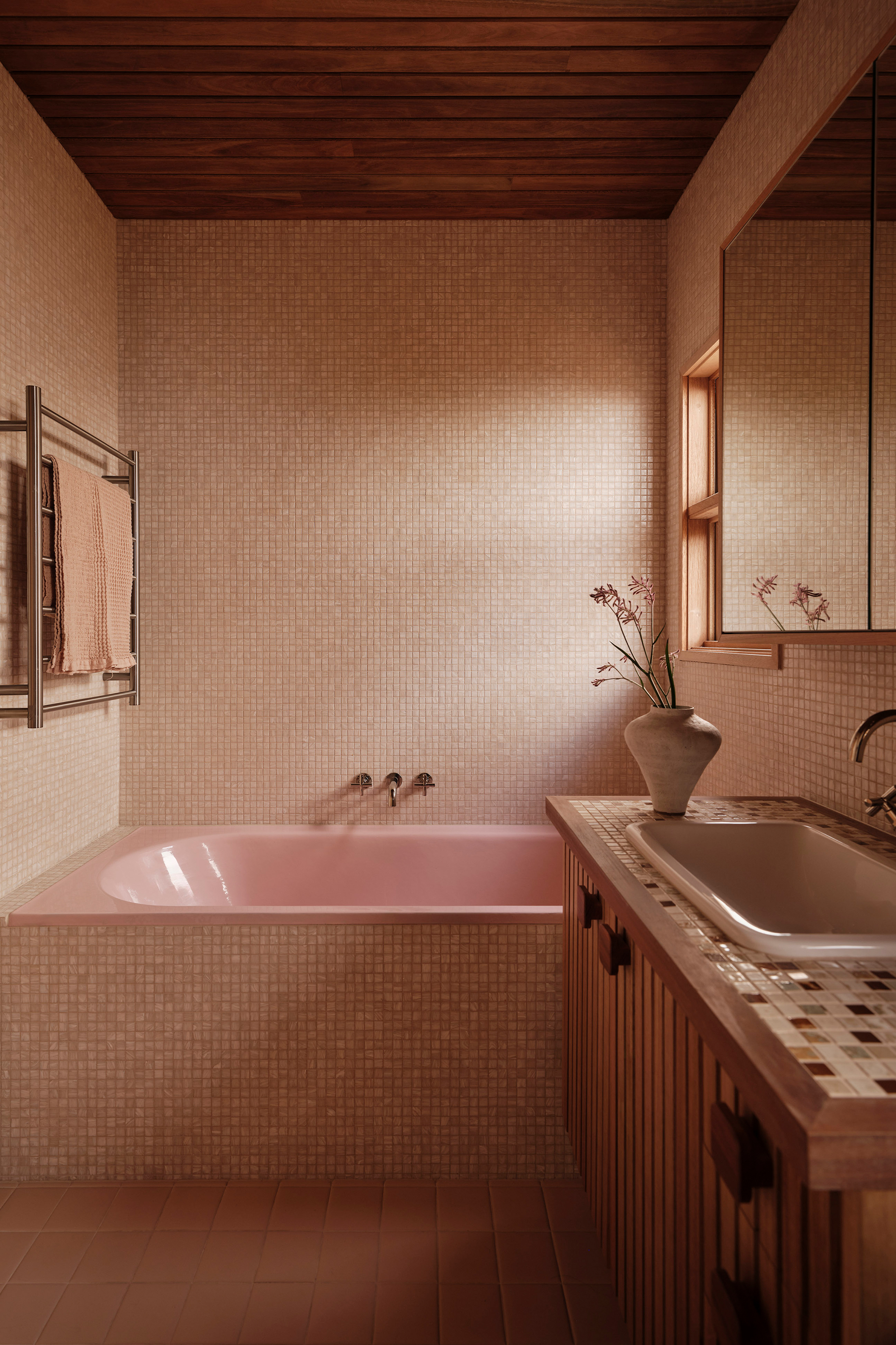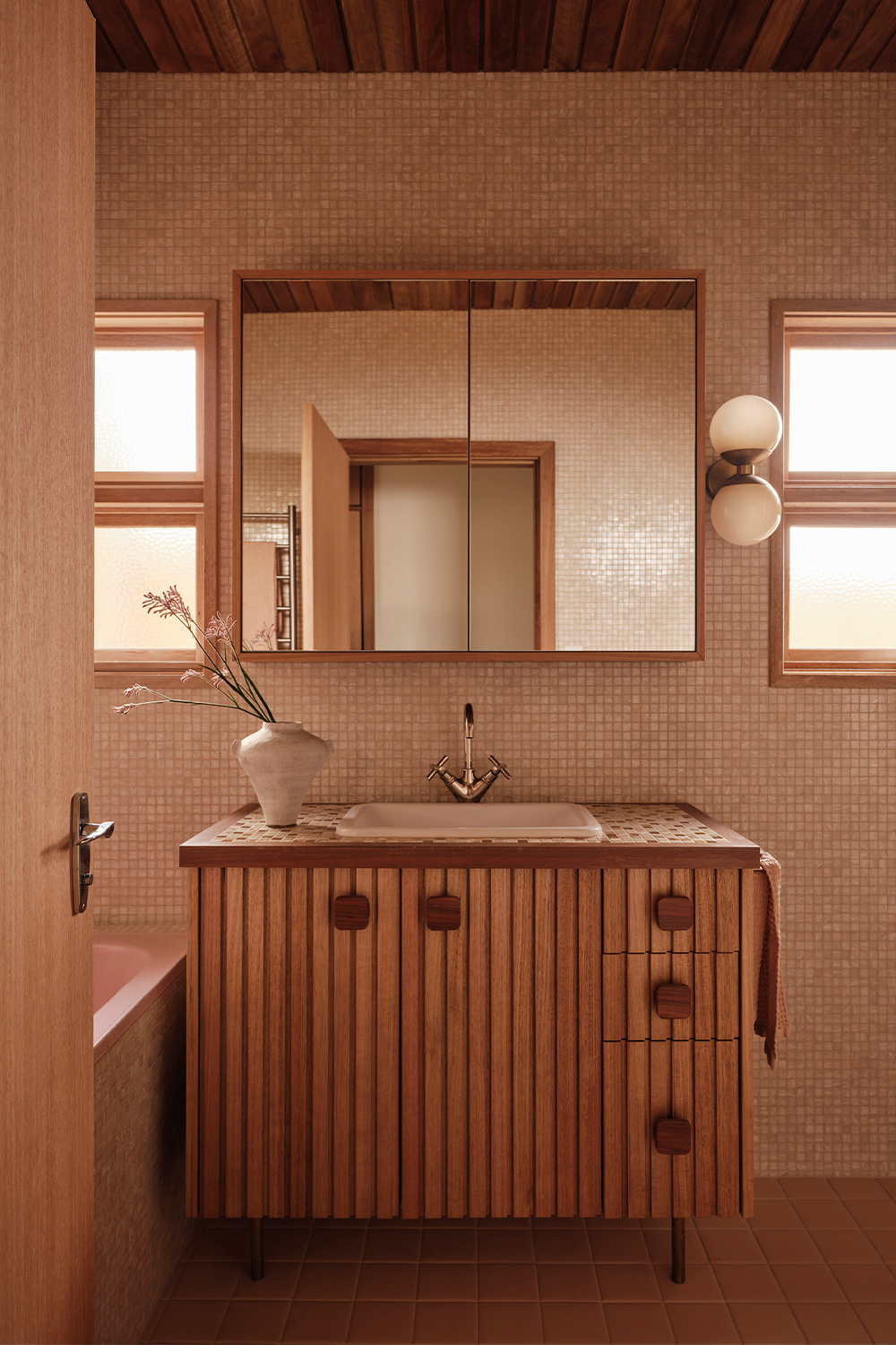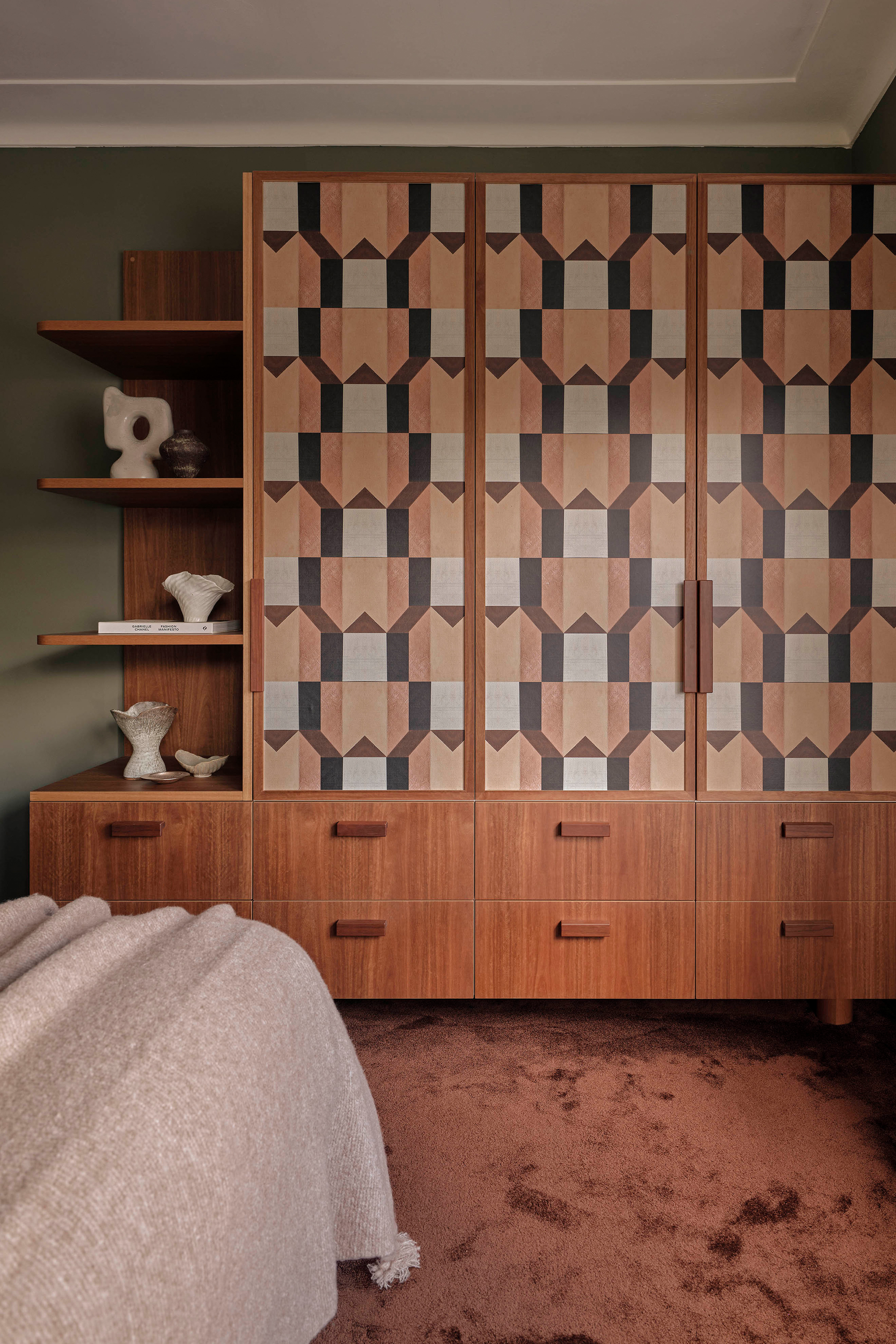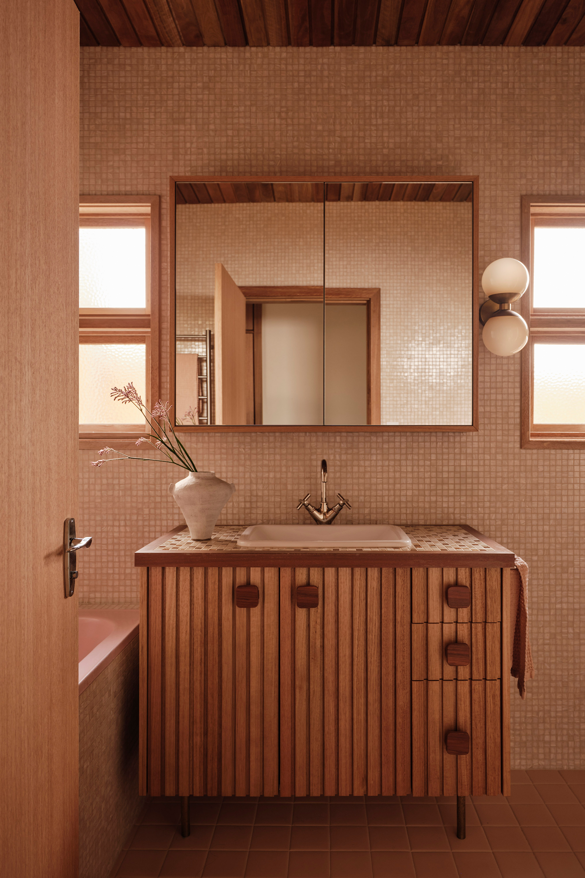 The main bathroom is centred around the repurposing of the original pink bathtub, creating a softer, more feminine retreat within the home. Blush-toned Bisazza mosaics wrap into softly rounded corners, complemented by a retro-inspired vanity with timber doors and tiled benchtop. In contrast, the master bedroom introduces bolder colour and pattern, combining geometric wallpaper, a richly toned carpet, and warm timber cabinetry to meet the practical need for new storage while celebrating the spirit of the era.