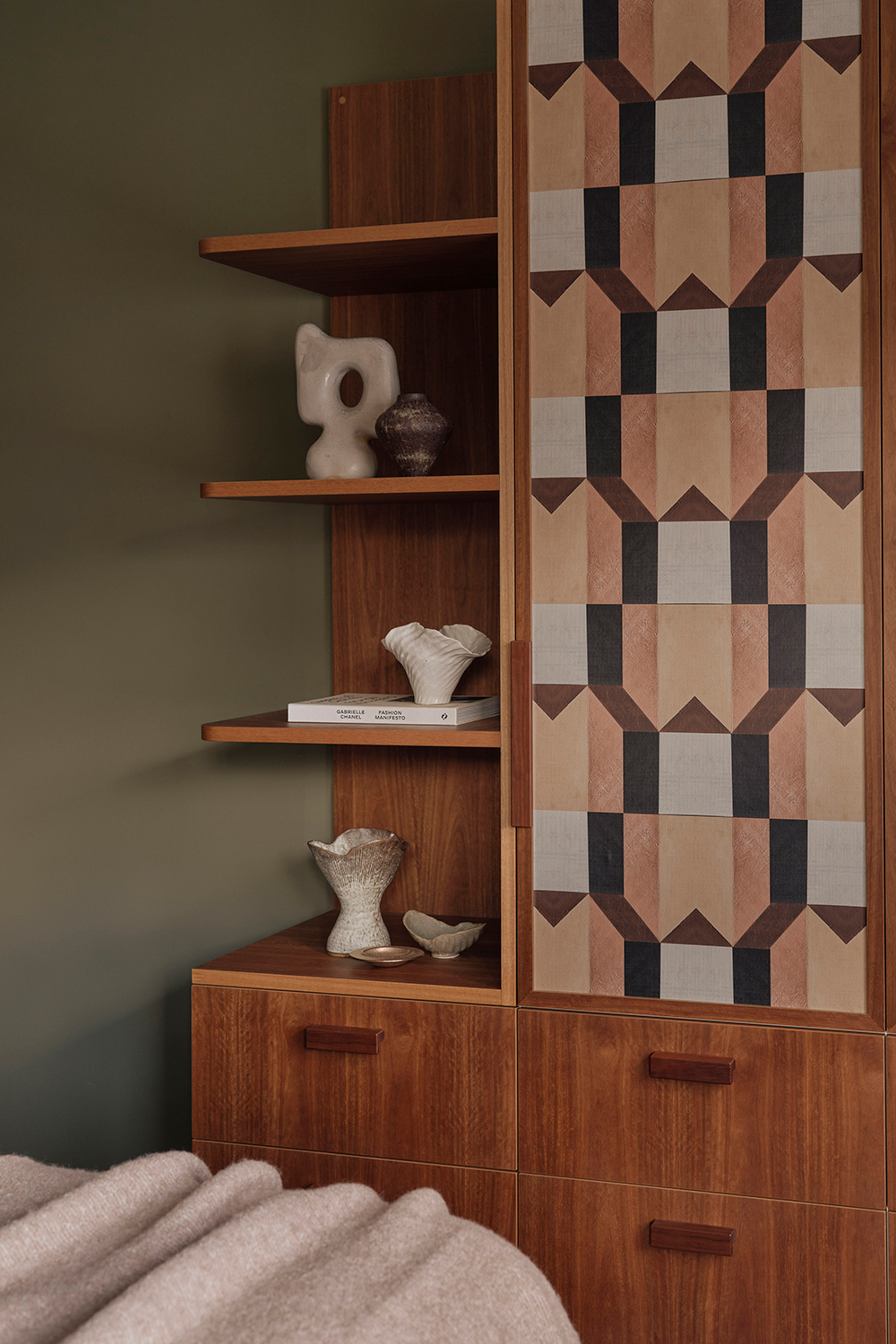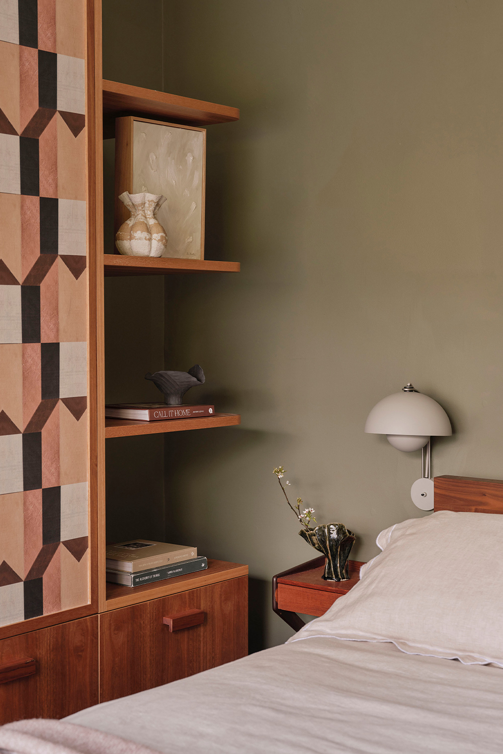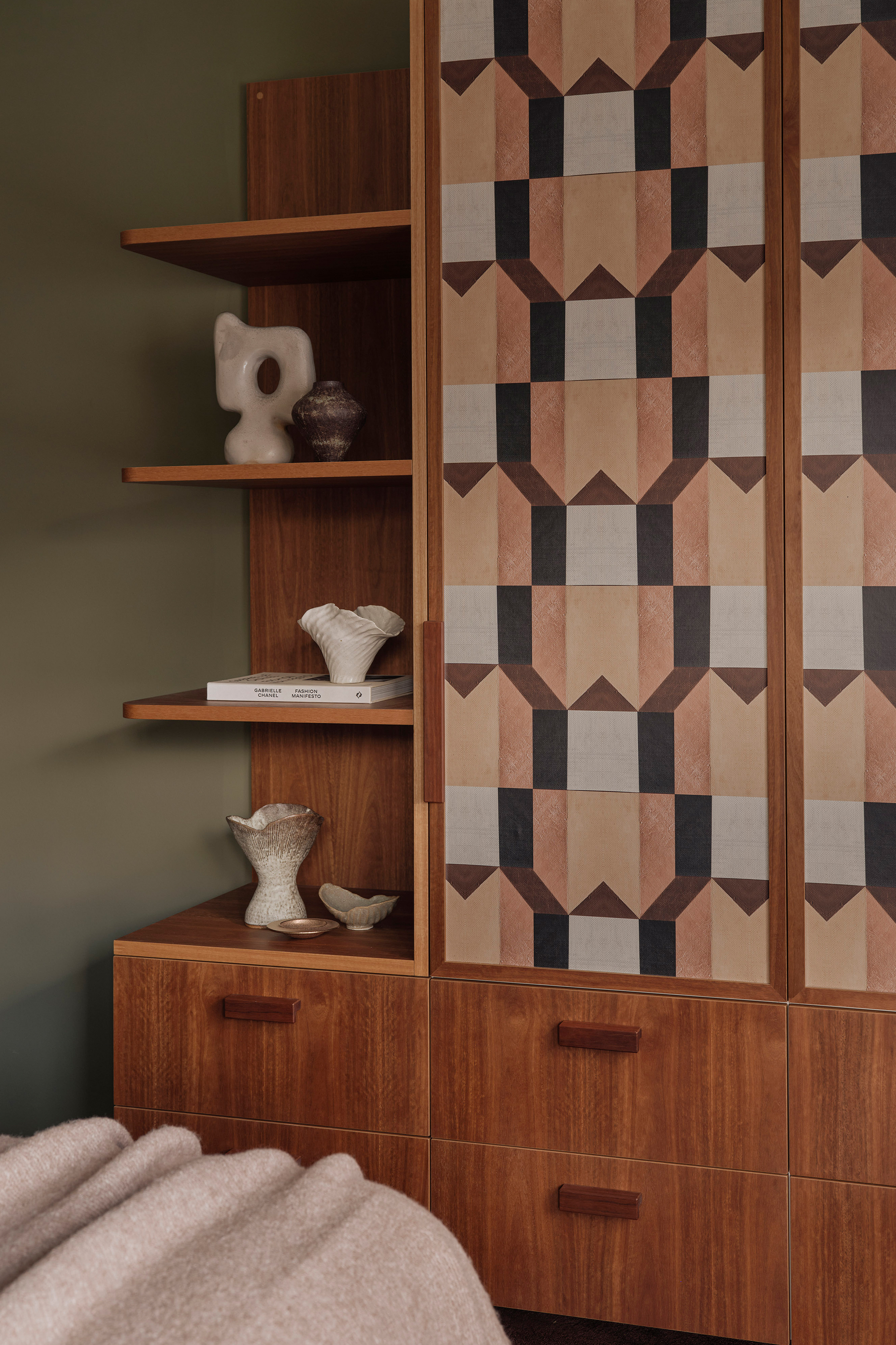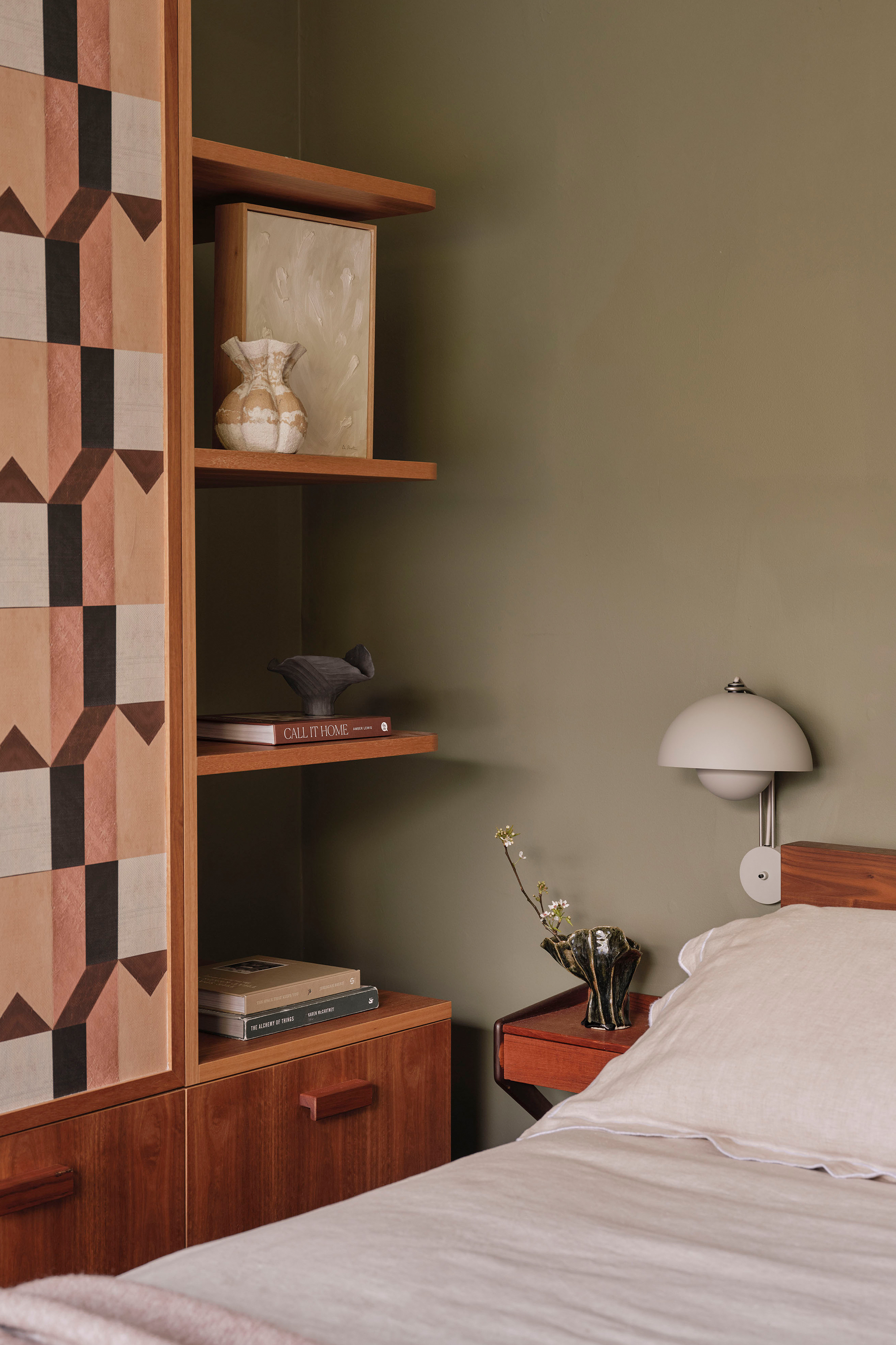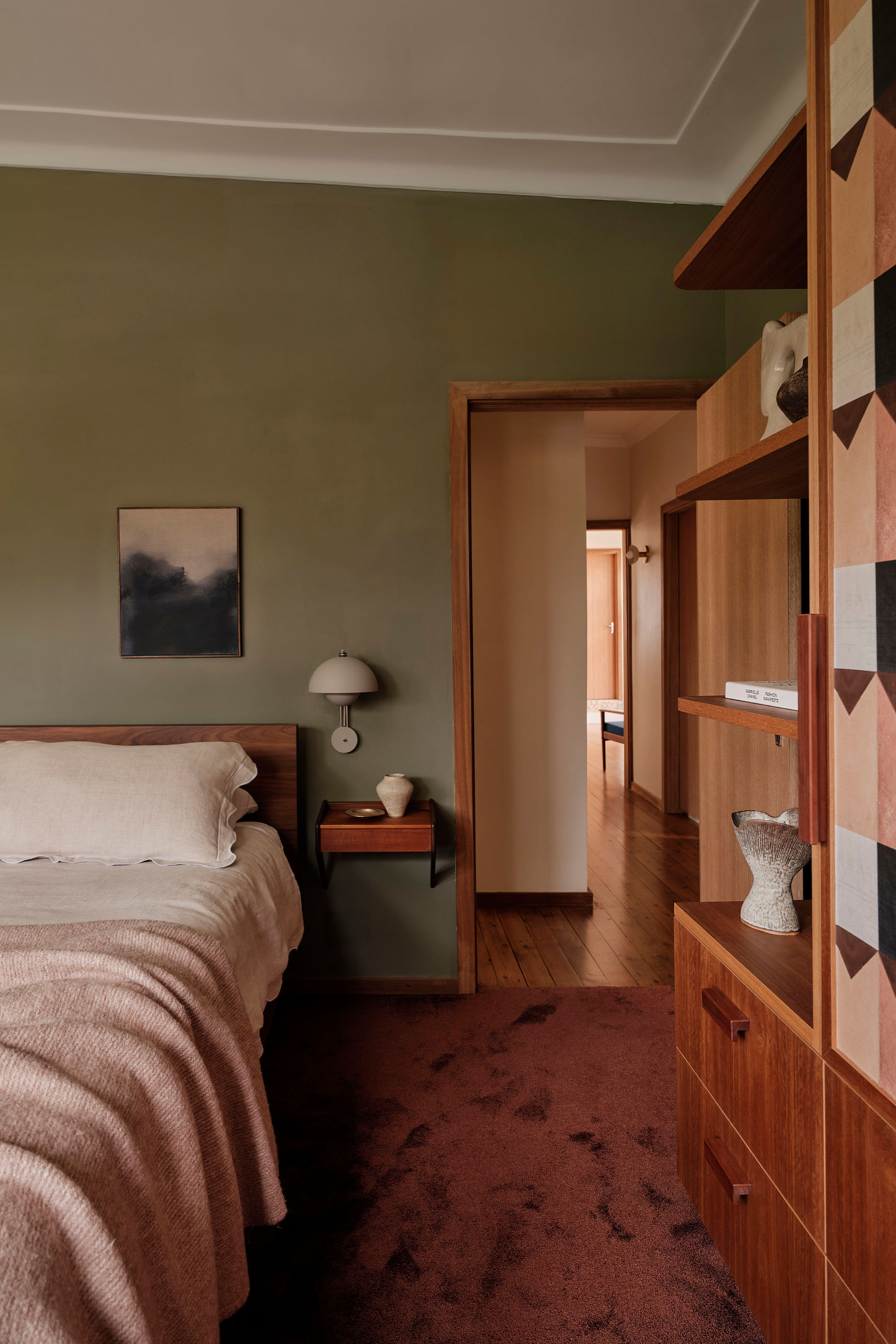 The main bathroom is centred around the repurposing of the original pink bathtub, creating a softer, more feminine retreat within the home. Blush-toned Bisazza mosaics wrap into softly rounded corners, complemented by a retro-inspired vanity with timber doors and tiled benchtop. In contrast, the master bedroom introduces bolder colour and pattern, combining geometric wallpaper, a richly toned carpet, and warm timber cabinetry to meet the practical need for new storage while celebrating the spirit of the era.