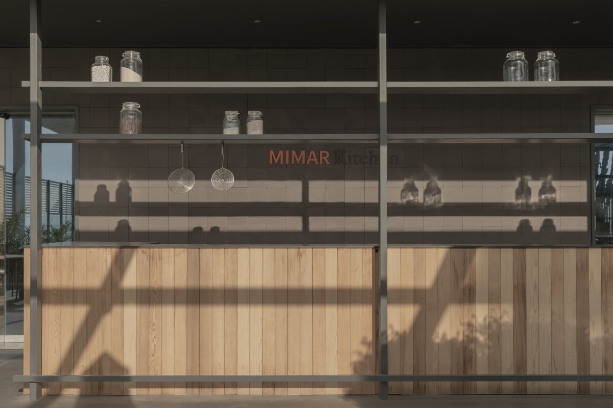 The grey terracotta ceramics embellish the exterior of the kitchen to explain the relationship between gastronomy, the environment, and local products. Next to it, a large bar allows visitors to witness the preparation and completion of the dishes, while a second bar, installed in front of the promenade, is intended to become a more casual service area.