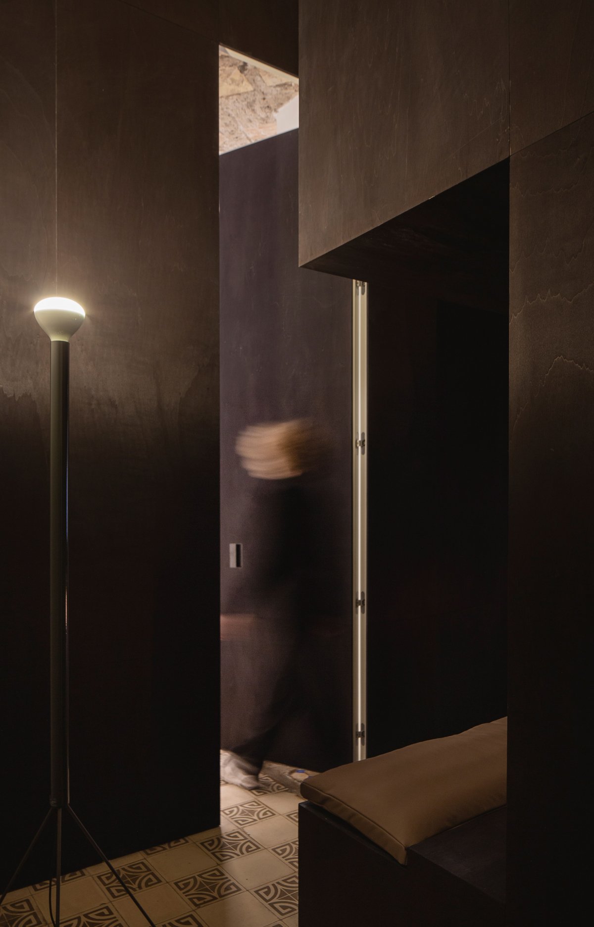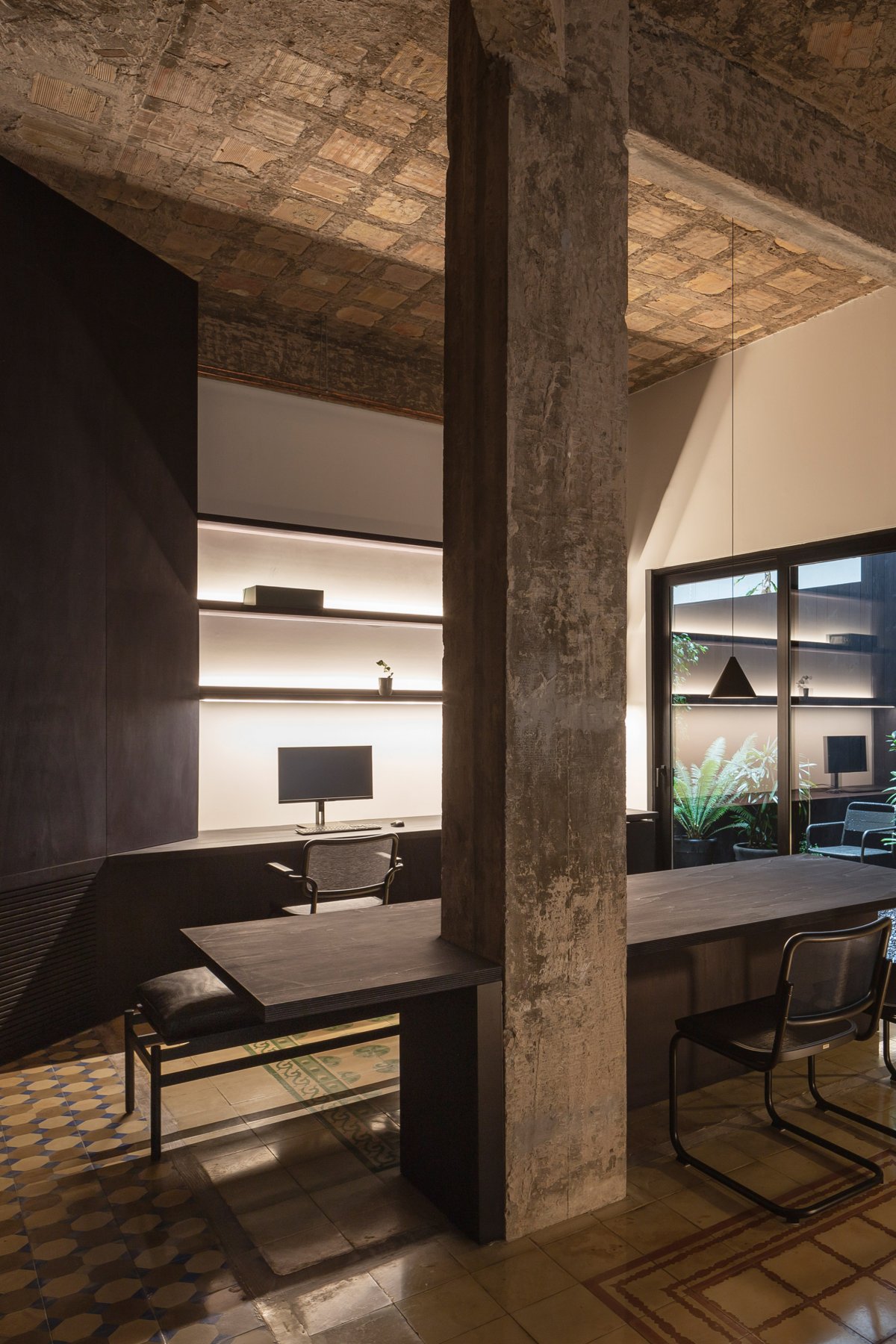 In the first part, Francesc Rife's work was to preserve the original nature of the space and secondly, dyed black poplar wood unfolds in the interior space as a discontinuous neutral material. The fairness of the color suggests that any historical evidence is noteworthy, whether it's the tiles covering the fireplace, or the ceiling.