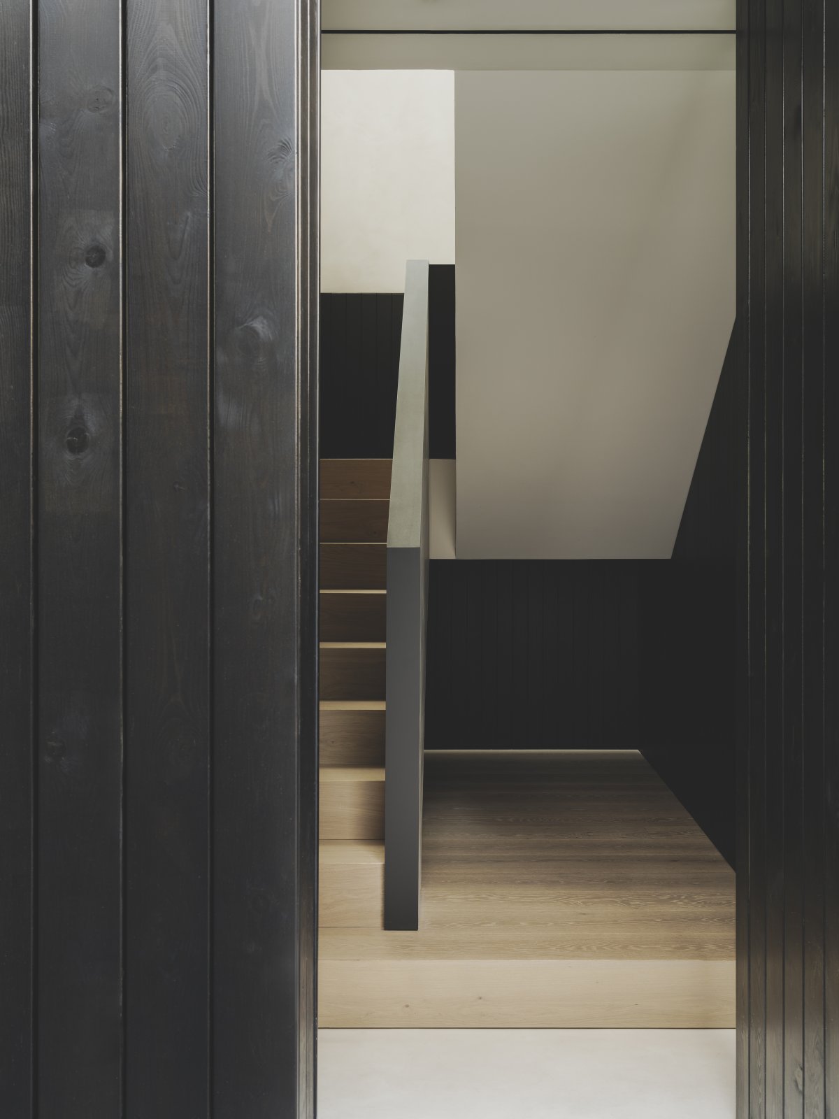 The staircase, located directly opposite the entrance, is one of the main architectural features, enhanced by a large skylight that floods it with natural light each day. Its design combines two of the project’s most important materials: oak wood, in both natural and black-stained finishes, and concrete. As in the rest of the project, tactility is a key focus, and the railing incorporates a black steel handrail that enriches the sensory experience.