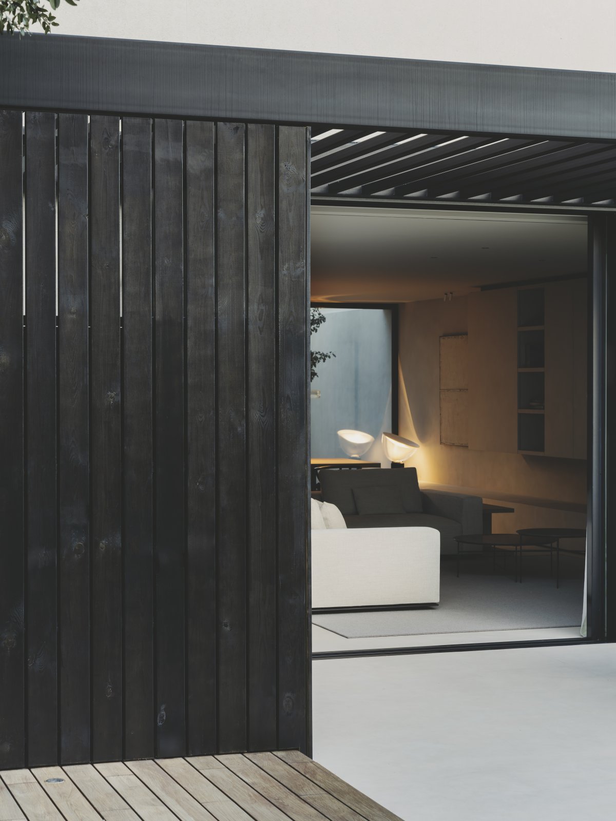 Although the house opens to the exterior on both ends, the dialogue with the outdoors is most clearly expressed in the rear courtyard. Here, the cladding of black-stained wooden slats extends beyond the facade, creating an integrated storage space outside. This terrace also features a swimming pool flanked by vegetation and a metal pergola designed to soften the direct impact of the sun on the outdoor dining area.