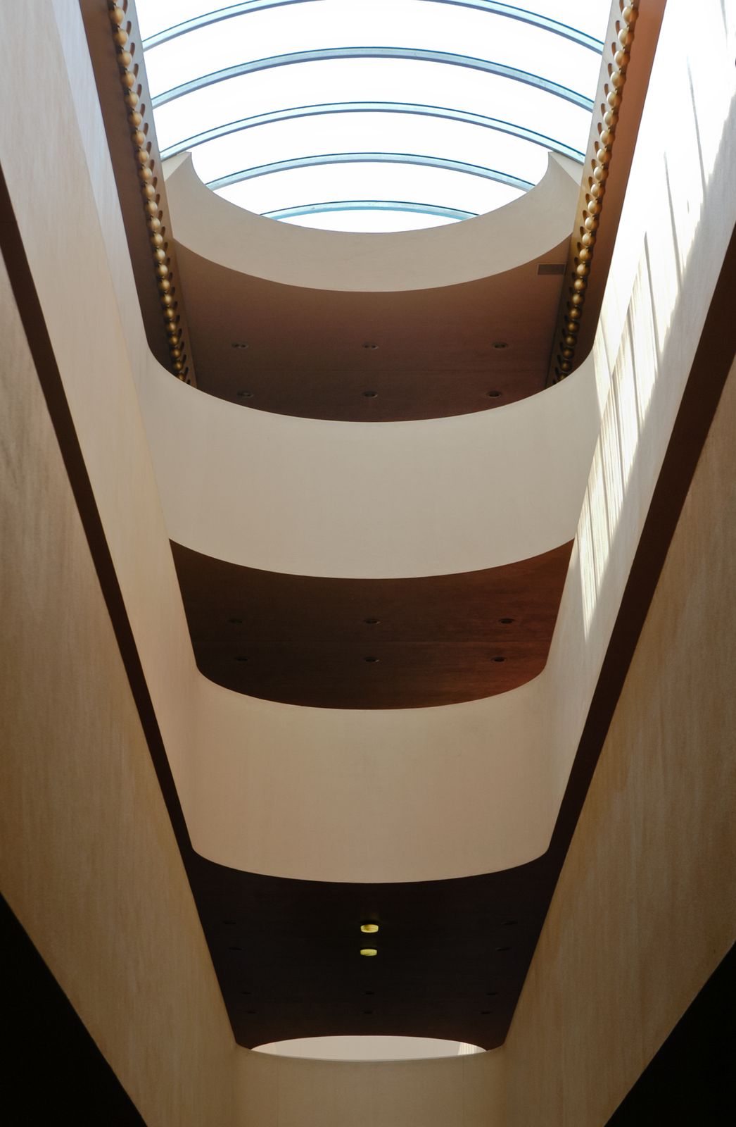 Completed in 1962, it is one of the few state-funded buildings designed by Frank Lloyd Wright. Government buildings always seem to require your attention to their thrust into the sky. Wright's design here avoids the long, low horizontal curve that surrounds the ground and merges with the hills to the east. "We know that good architecture does not harm the landscape, but makes it more beautiful than it was before it was built. You have one of the most beautiful landscapes I have ever seen in Marin County, and I am proud to make the County's architecture a beautiful feature of the area." - Frank Lloyd Wright