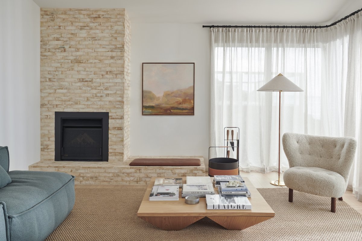 The home’s brick fireplace, shiplap cladding and timber-framed bunkbeds celebrate the charm of the traditional coastal beach house, while spirited touches, such as the bathroo’s scallop-edged mirrors, offer a playful edge.