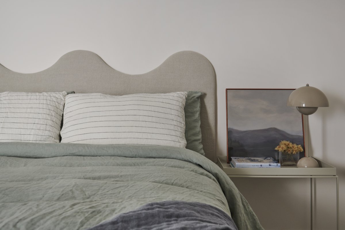 A tactile palette of oak, terrazzo, hand-glazed tiles and white marble lends spaciousness and grain to the modestly scaled home. The clients’ penchant for entertaining is met with an open kitchen, living and dining space, where views to the water are complemented by the interior’s soapy blue and green tones.