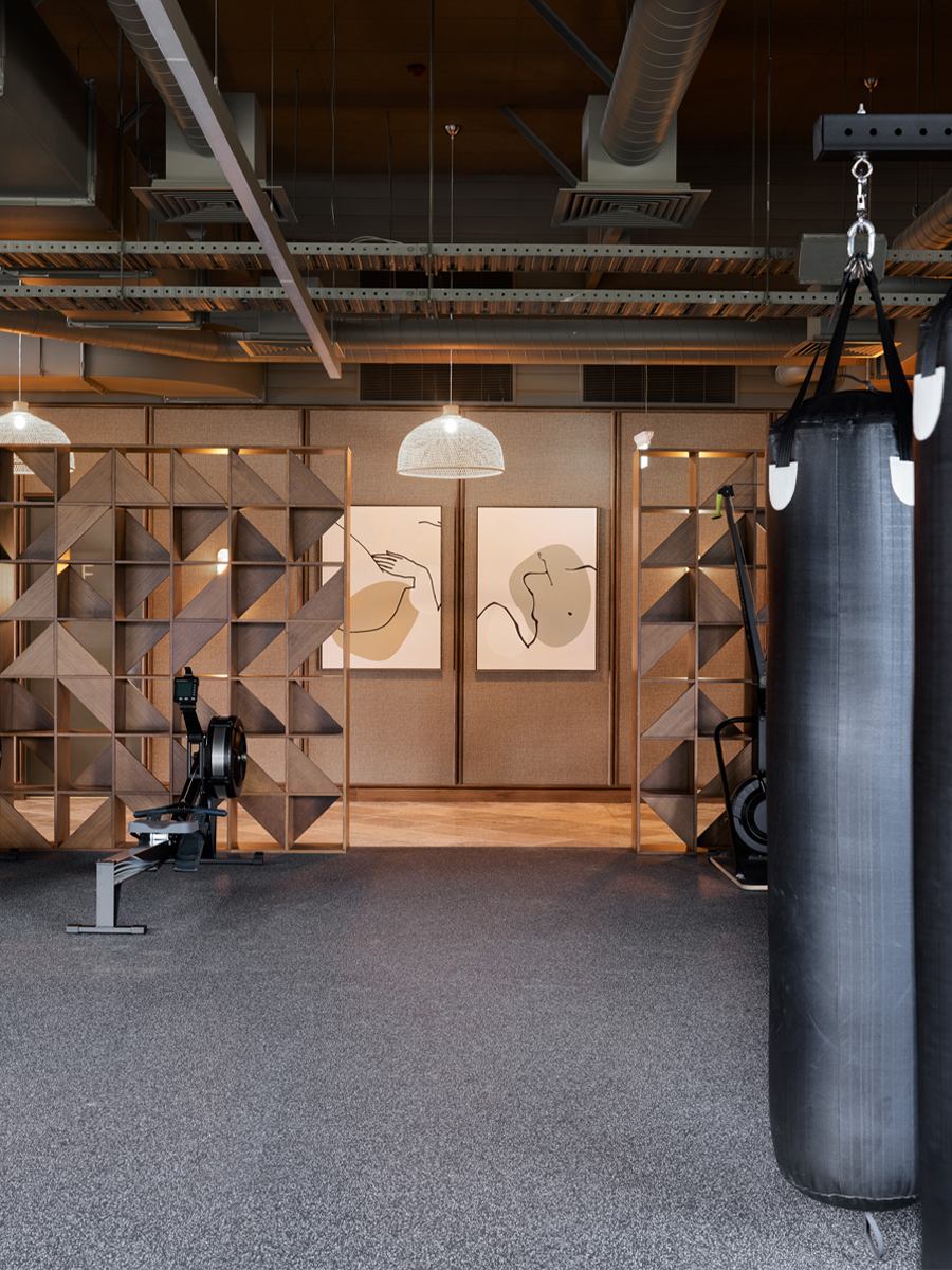 The Body Wellness & Fitness Centre is an office and leisure space designed by retail brand Cotton On for staff. The design is a warm layered resort style that elevates the workplace wellness space. Designed by Australian-based design studio Greg Natale in collaboration with PTID, the interiors include a variety of health and wellbeing Spaces, from meetings to meditation areas, yoga rooms to spin rooms and running tracks throughout the campus, reflecting the brand's emphasis on work-life balance and a holistic approach to nurturing its staff.