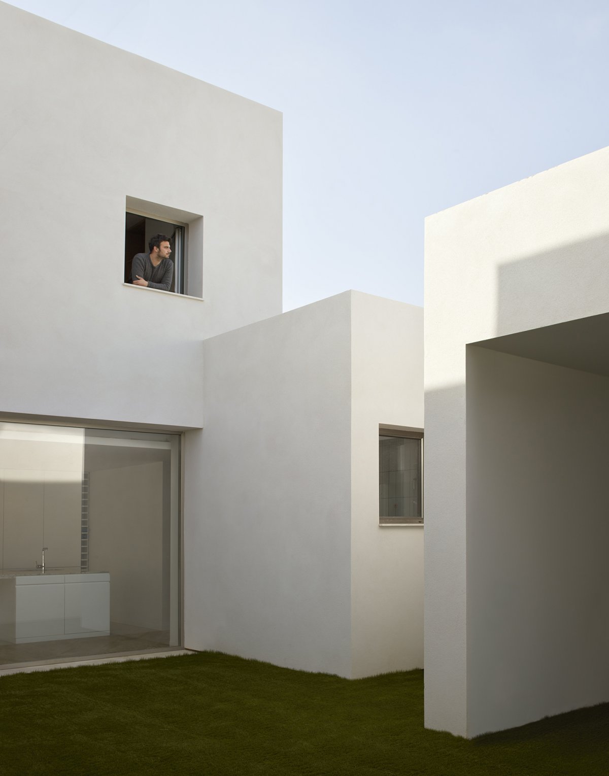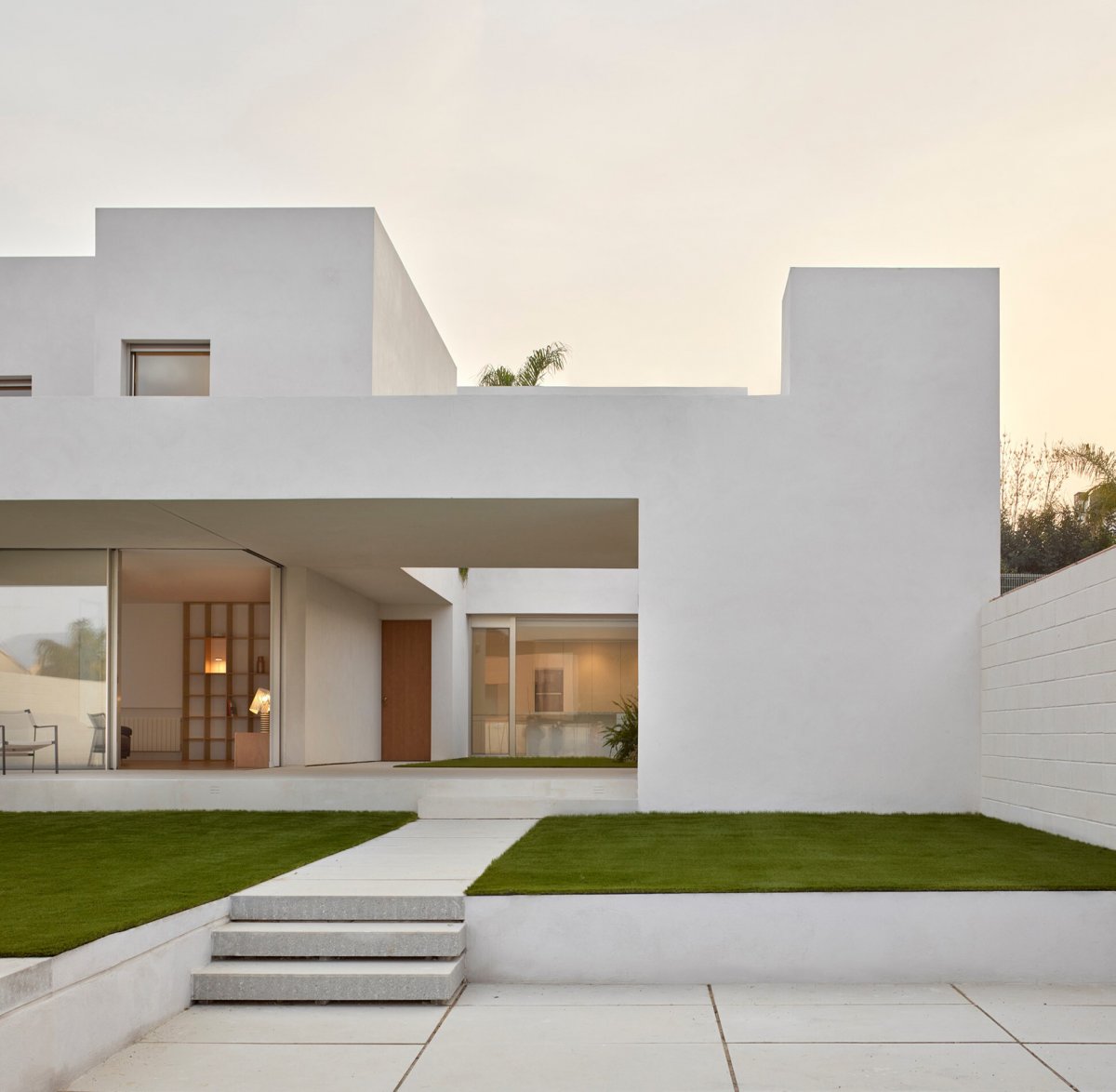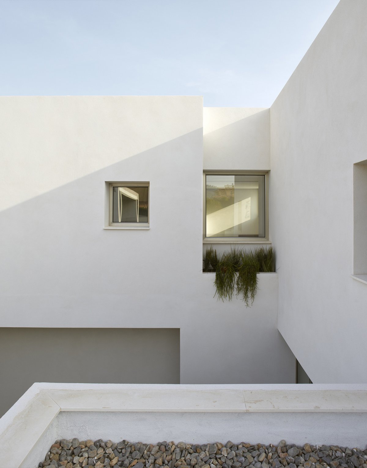From the street, a barrier crowned with concrete blocks provides privacity to the interior and allows to visualize the traces of the white volume which shapes the house.