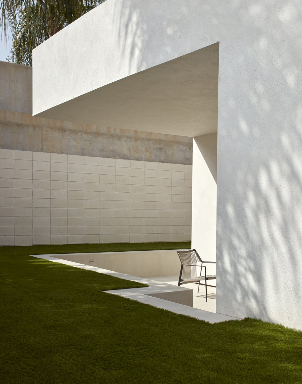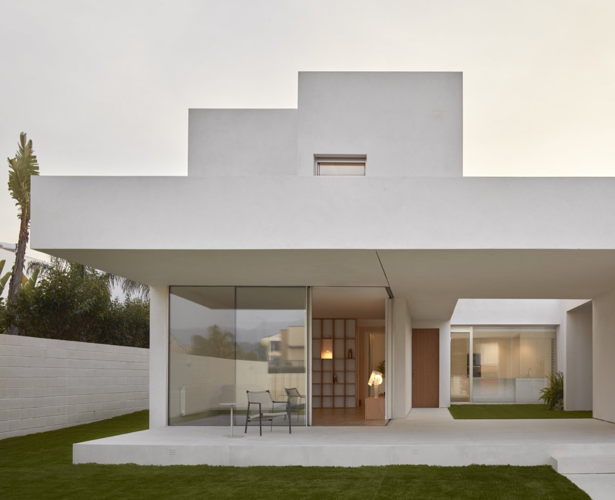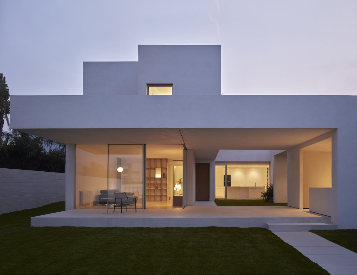 From the street, a barrier crowned with concrete blocks provides privacity to the interior and allows to visualize the traces of the white volume which shapes the house.