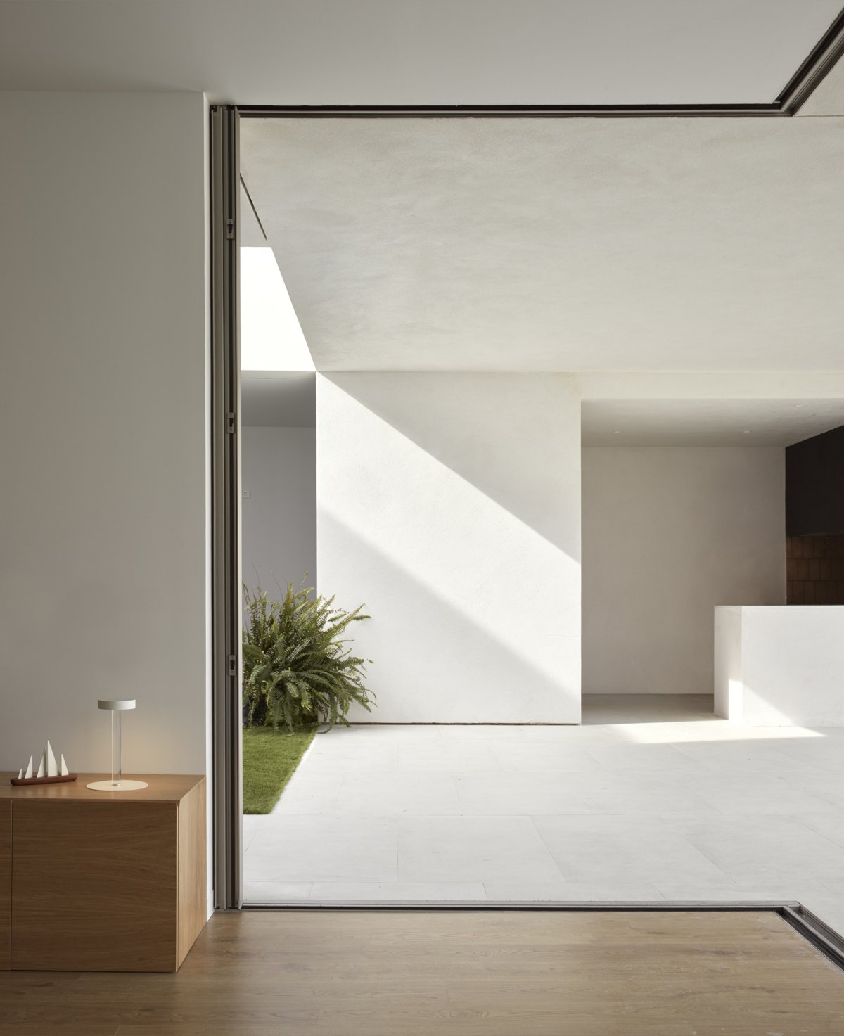 Its footprint on the ground floor is deformed to embrace a patio that gives meaning to each of its rooms. This patio serves as the center and articulator of the activity on the ground floor, in which the day area is located. Besides, it allows to maximize its facade length to extend its relationship with the outside, undoing the traditional limits and thus establishing a new link with it. The successive transitions between interior and exterior allow a fluid movement around the plot and an attractive relationship between the void and the sculpted body, which reduces the scale of the exterior and interior spaces of the house.