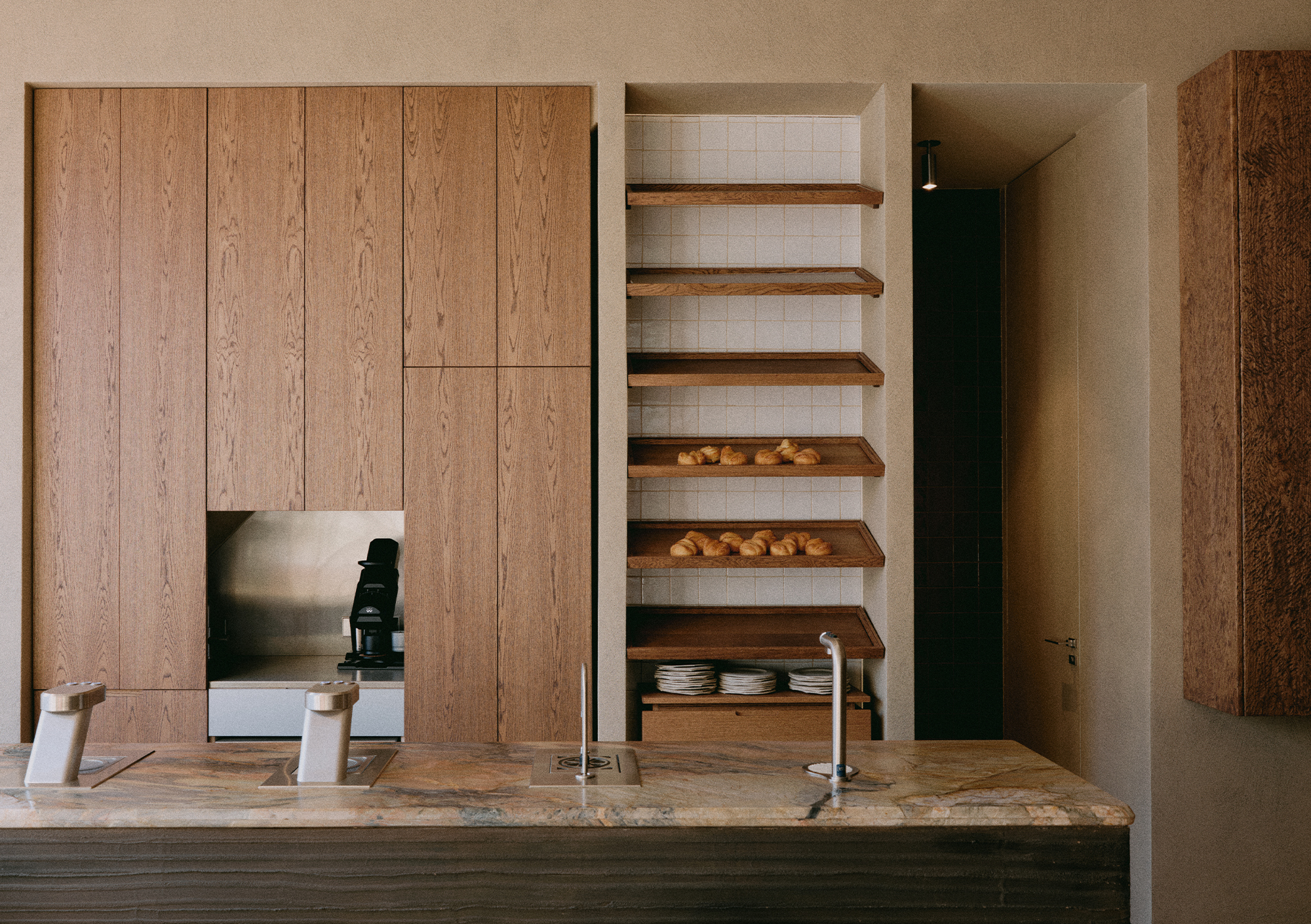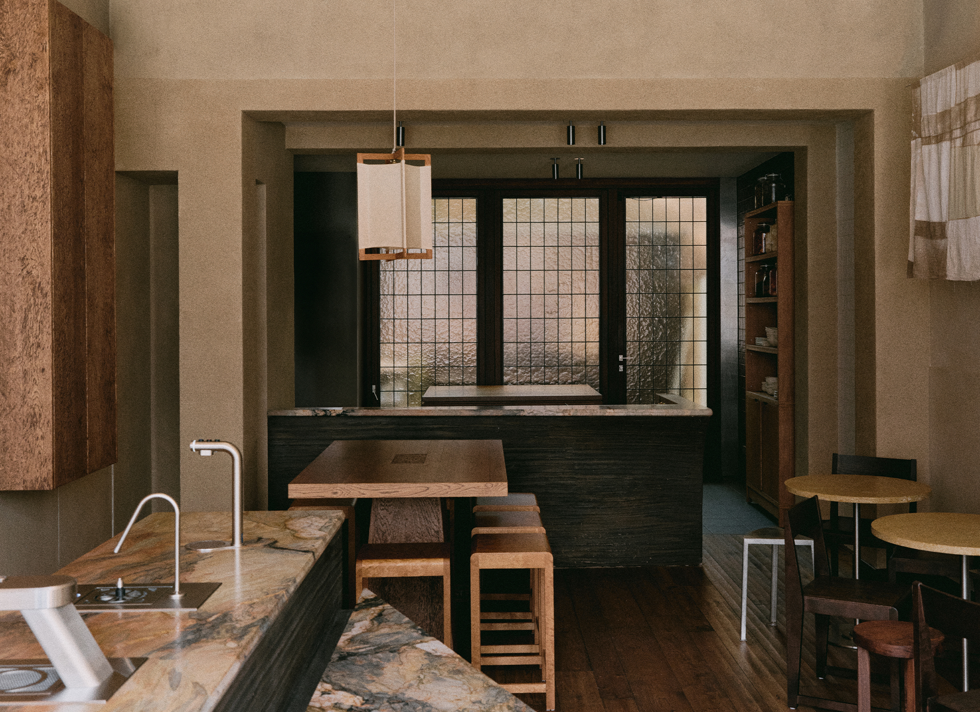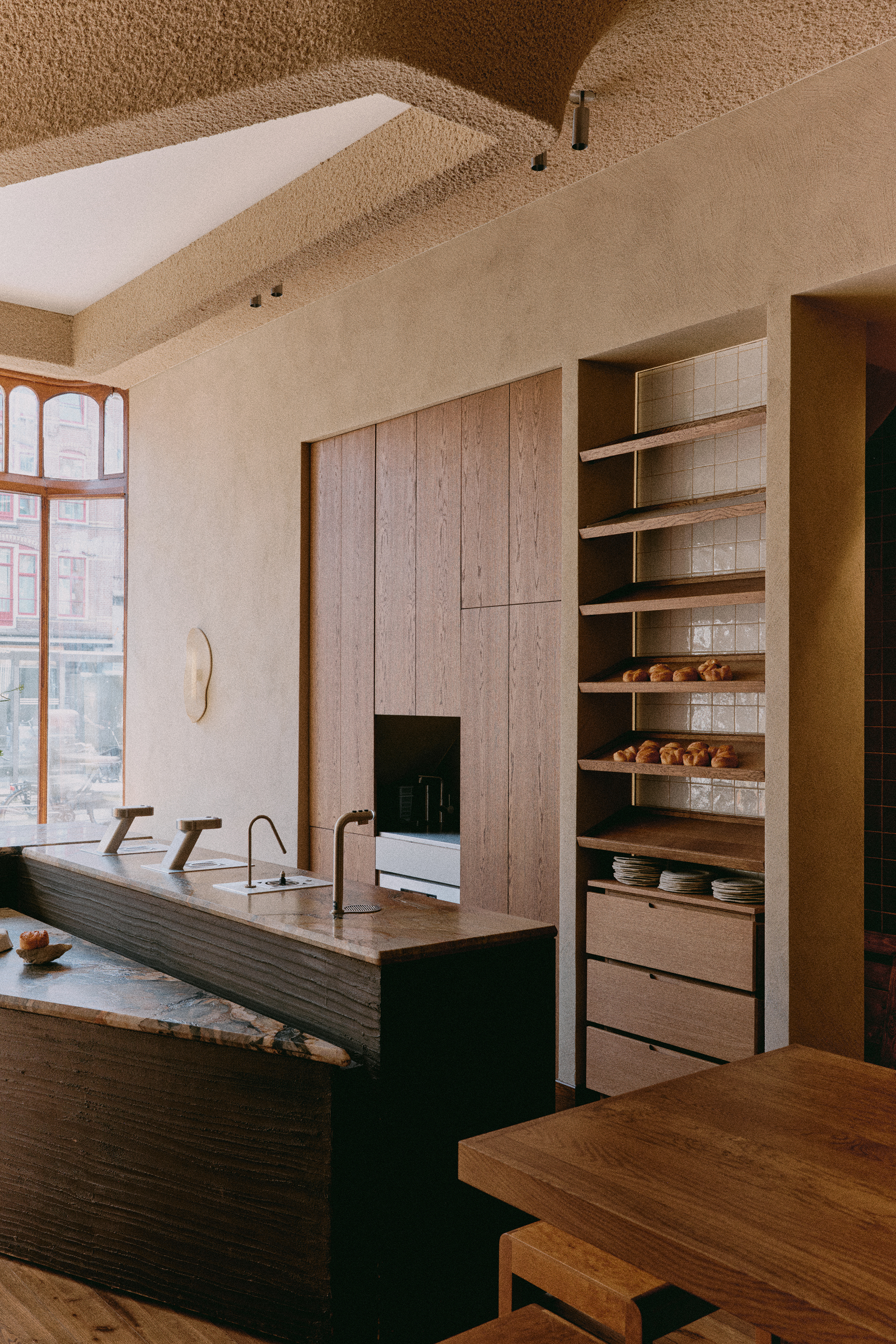 Every material and design element was chosen to heighten the sensory experience. Hemp-infused plaster on the pillars adds texture and a tactile connection to nature, while metal accents in the furniture reflect durability and strength, balancing the space's softer, more organic elements. These natural textures and patterns create a quiet rhythm throughout the space, gently encouraging visitors to engage with their surroundings on a deeper, more mindful level.