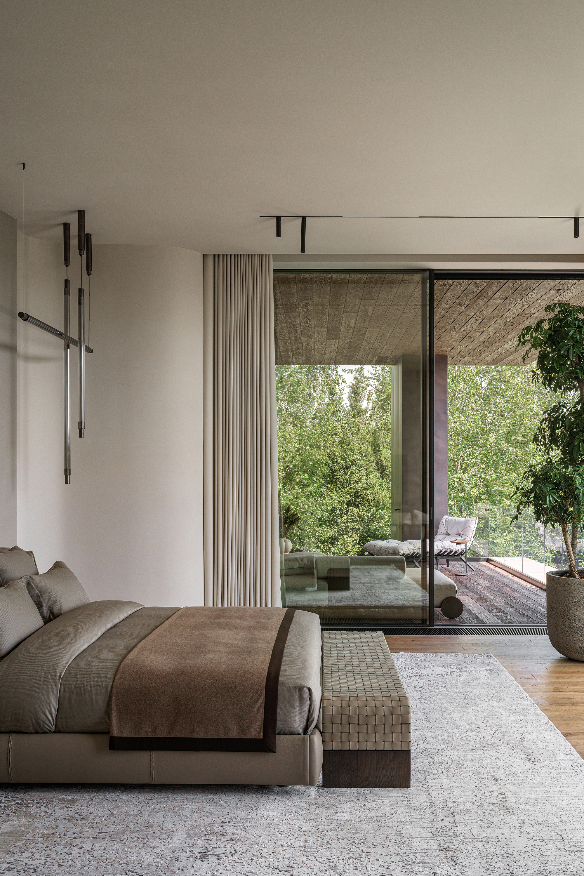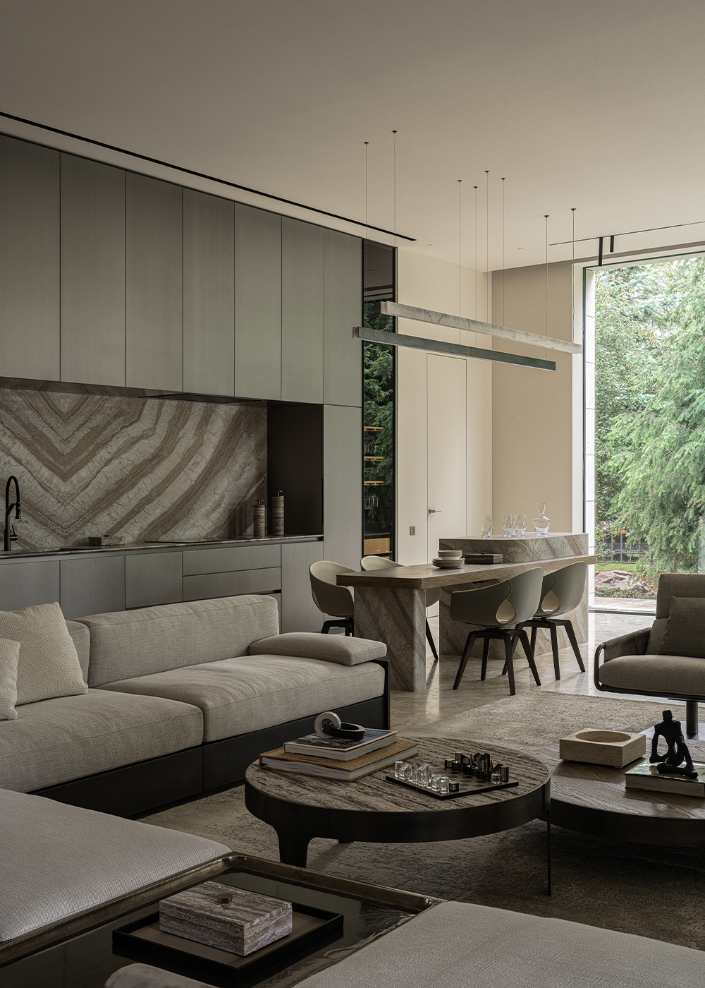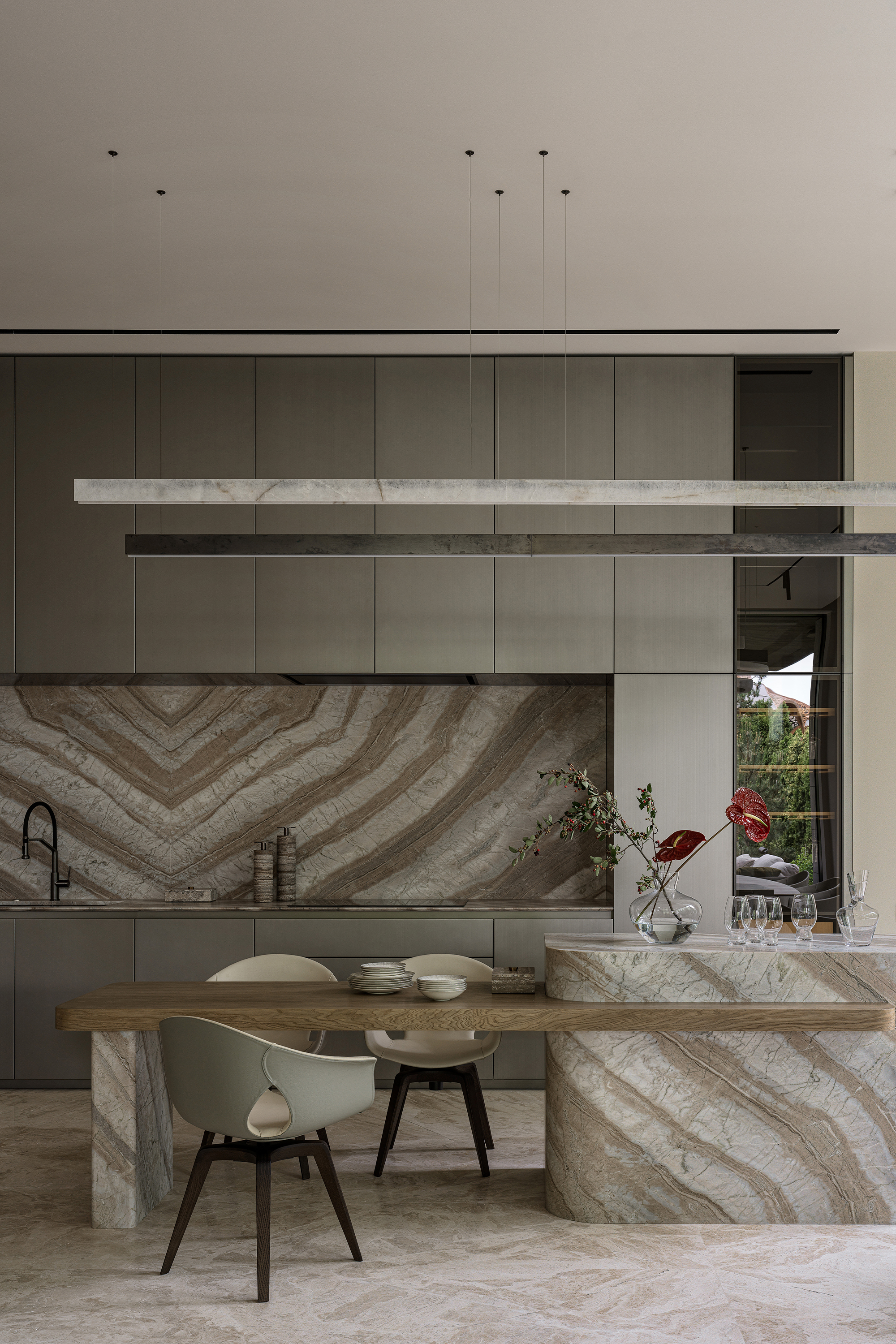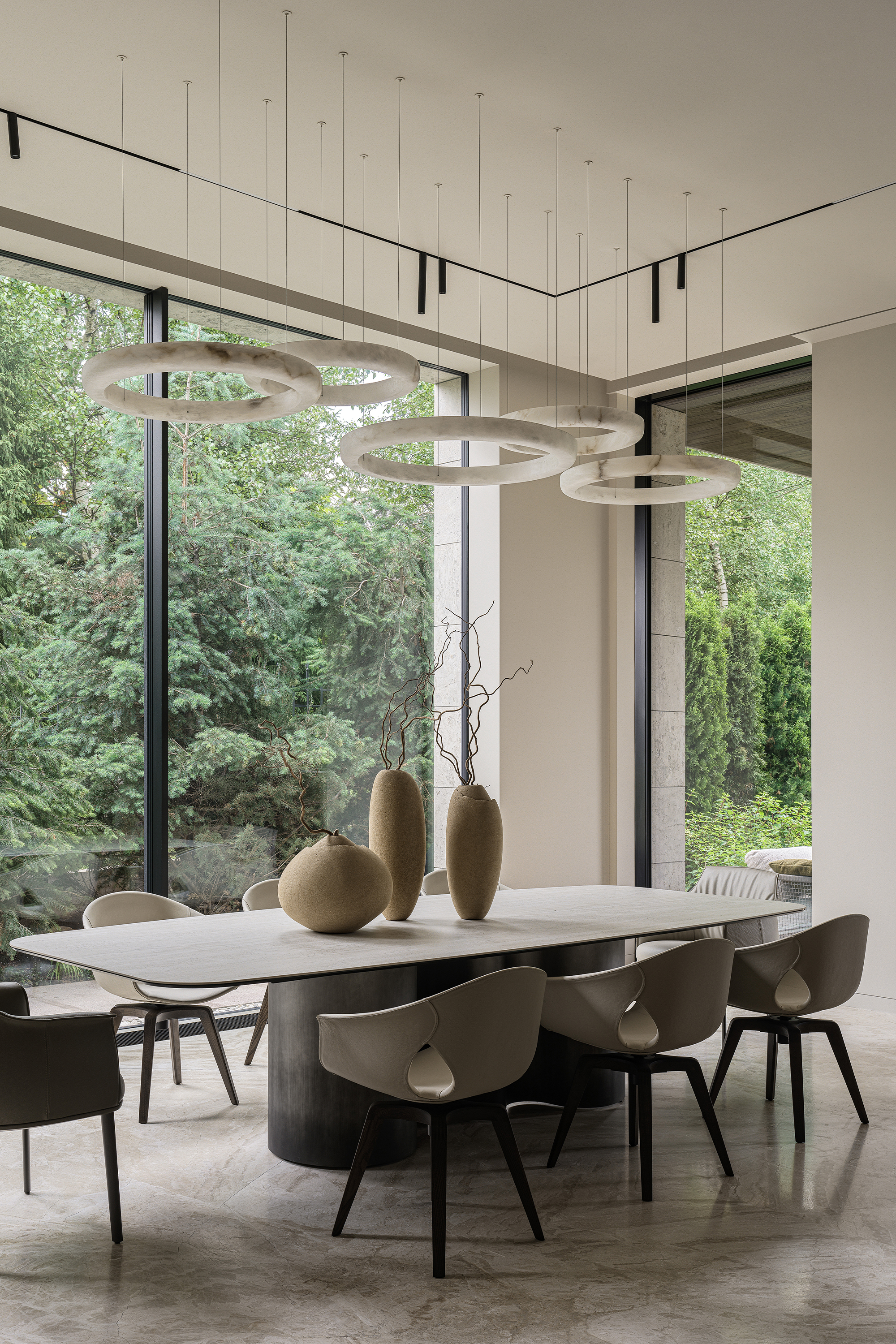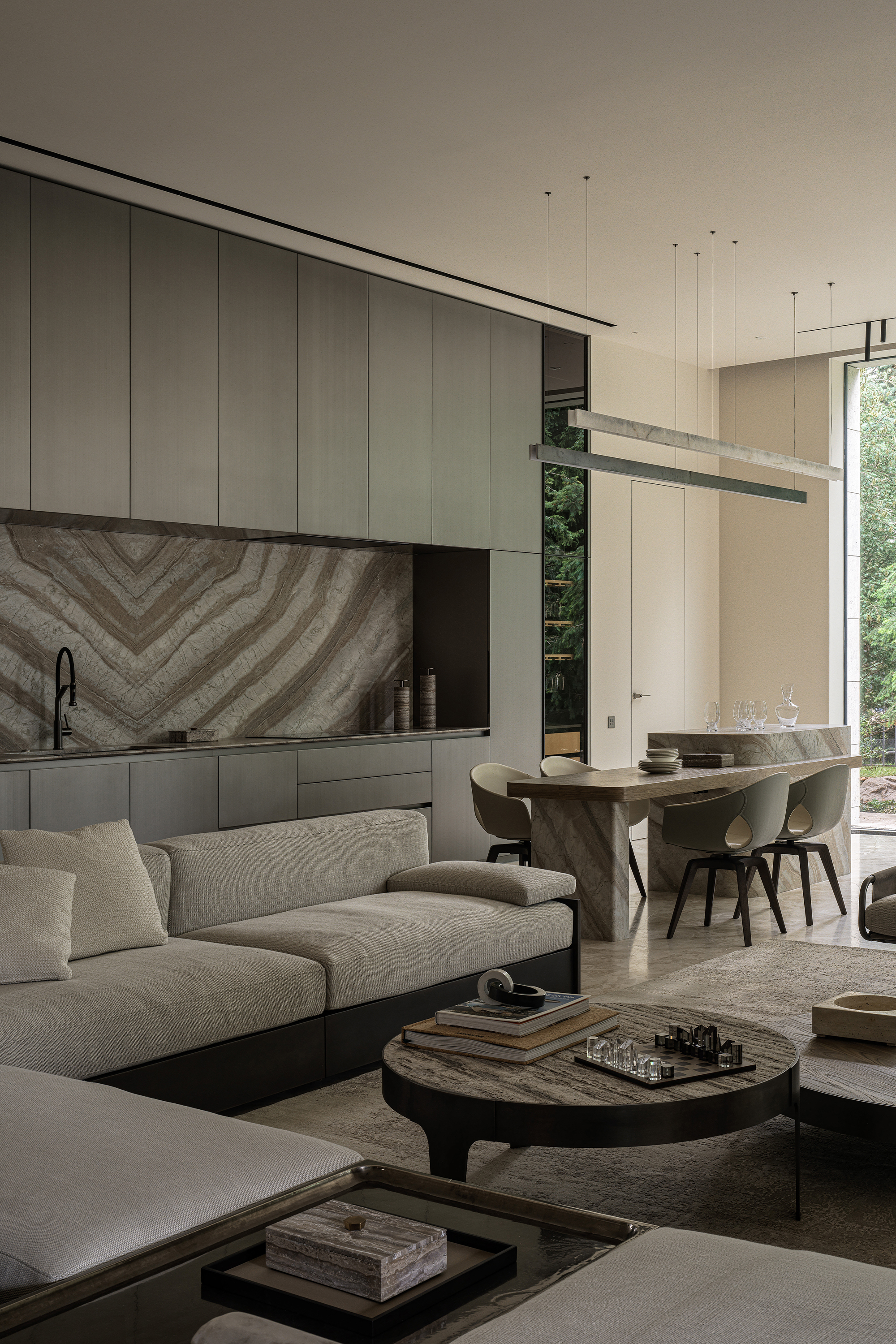 The main theme of this contemporary interior was a harmonious connection with the surrounding nature. The house is organically integrated into a Japanese-style landscape, and the interior became an ode to minimalism, tranquility, and deep respect for nature. The result is a space where functionality meets aesthetics and every element carries meaning, referring to the philosophy of wabi-sabi — the acceptance of imperfection and the transience of beauty. The mood I wanted to achieve was contemplation, meditation, and the pursuit of balance.