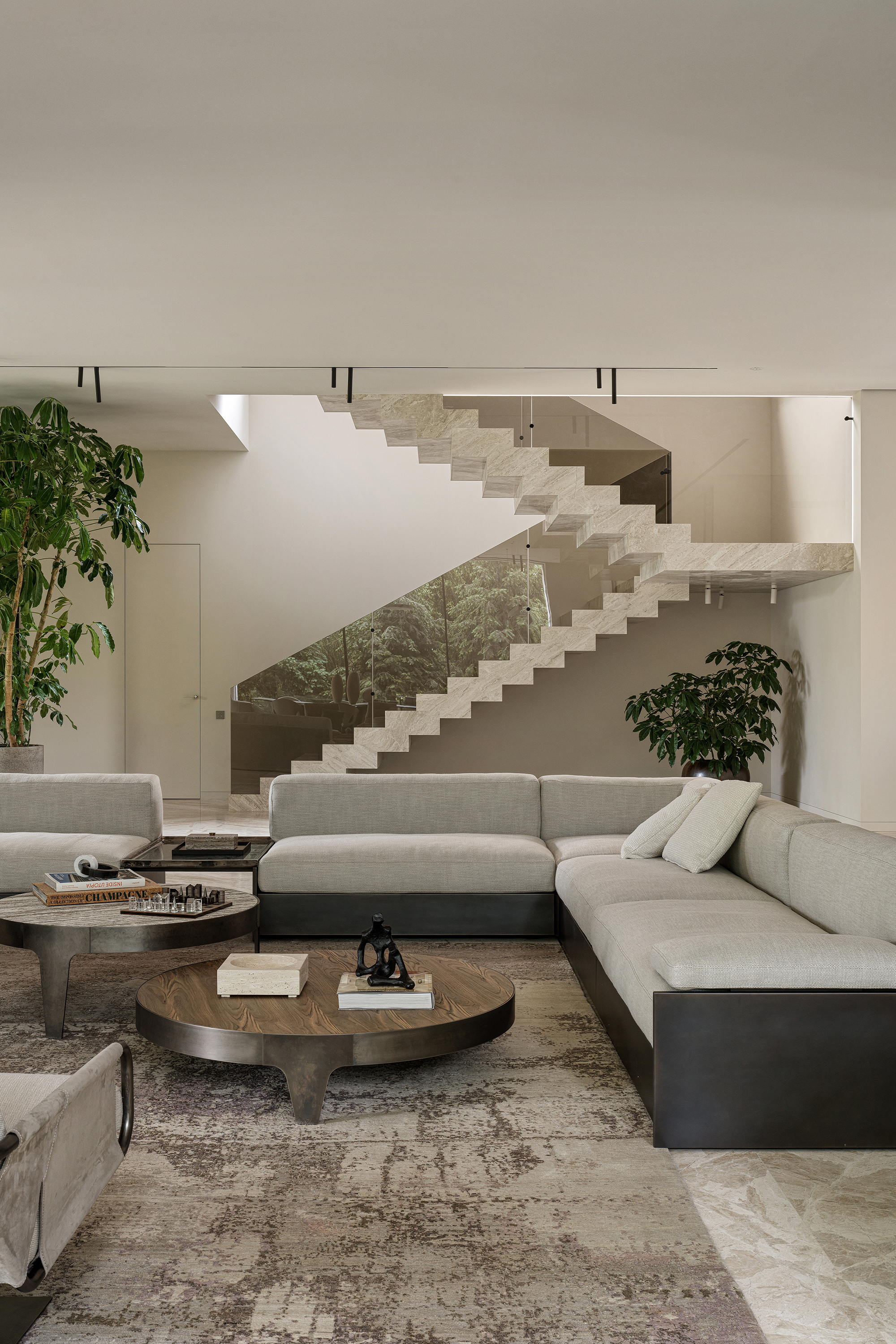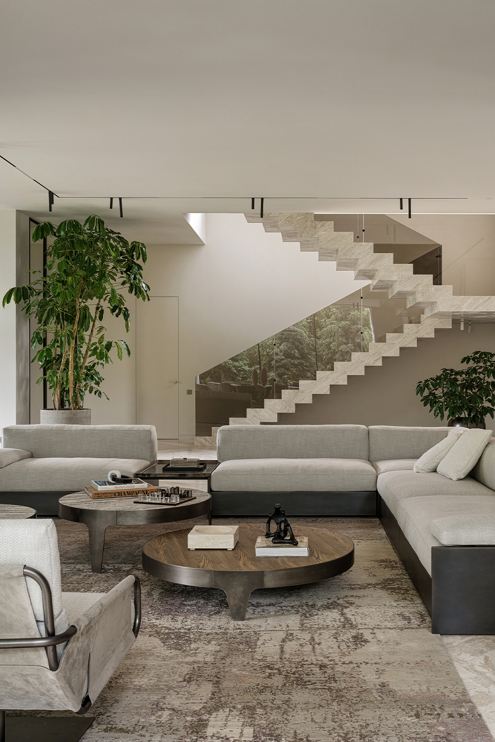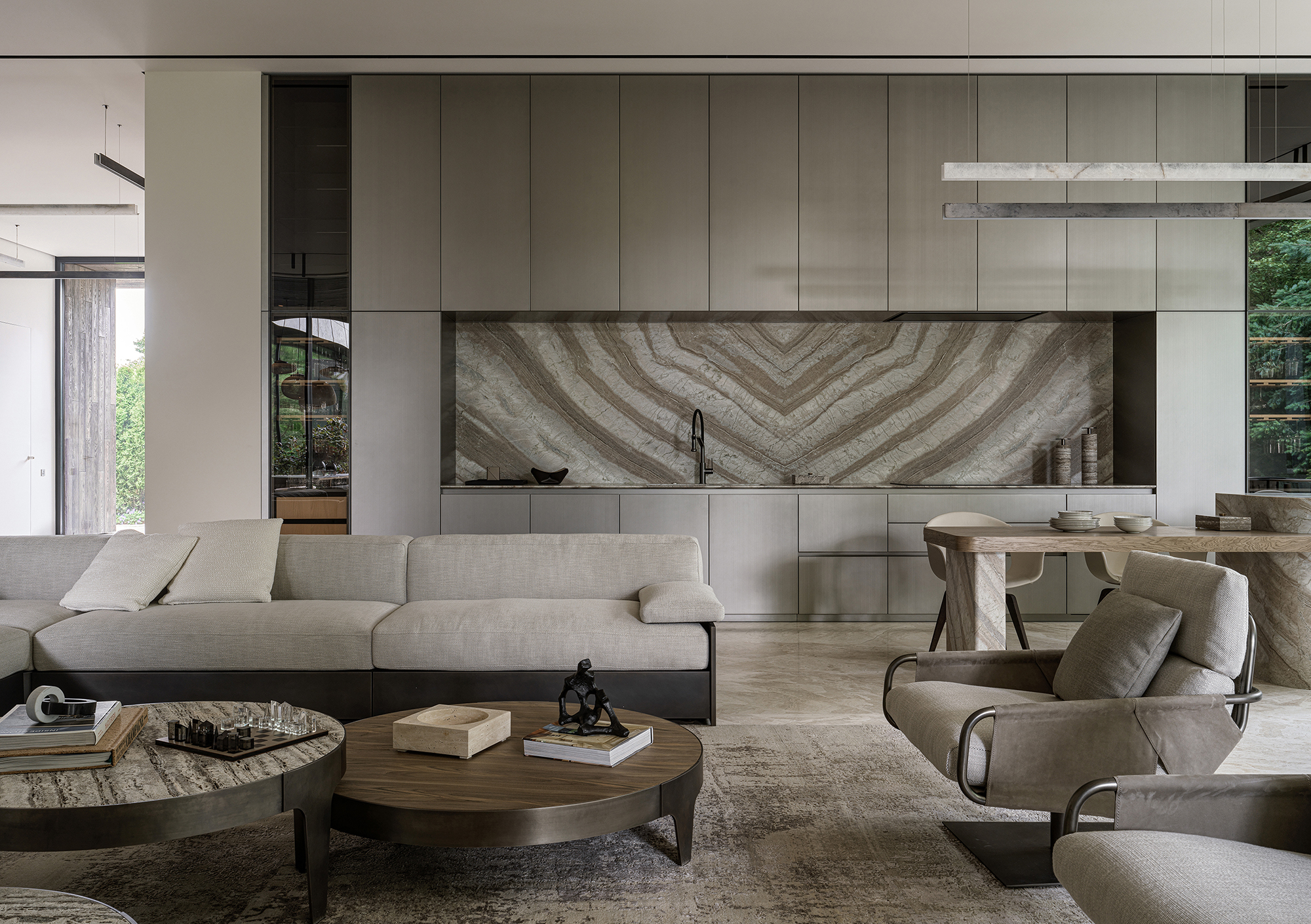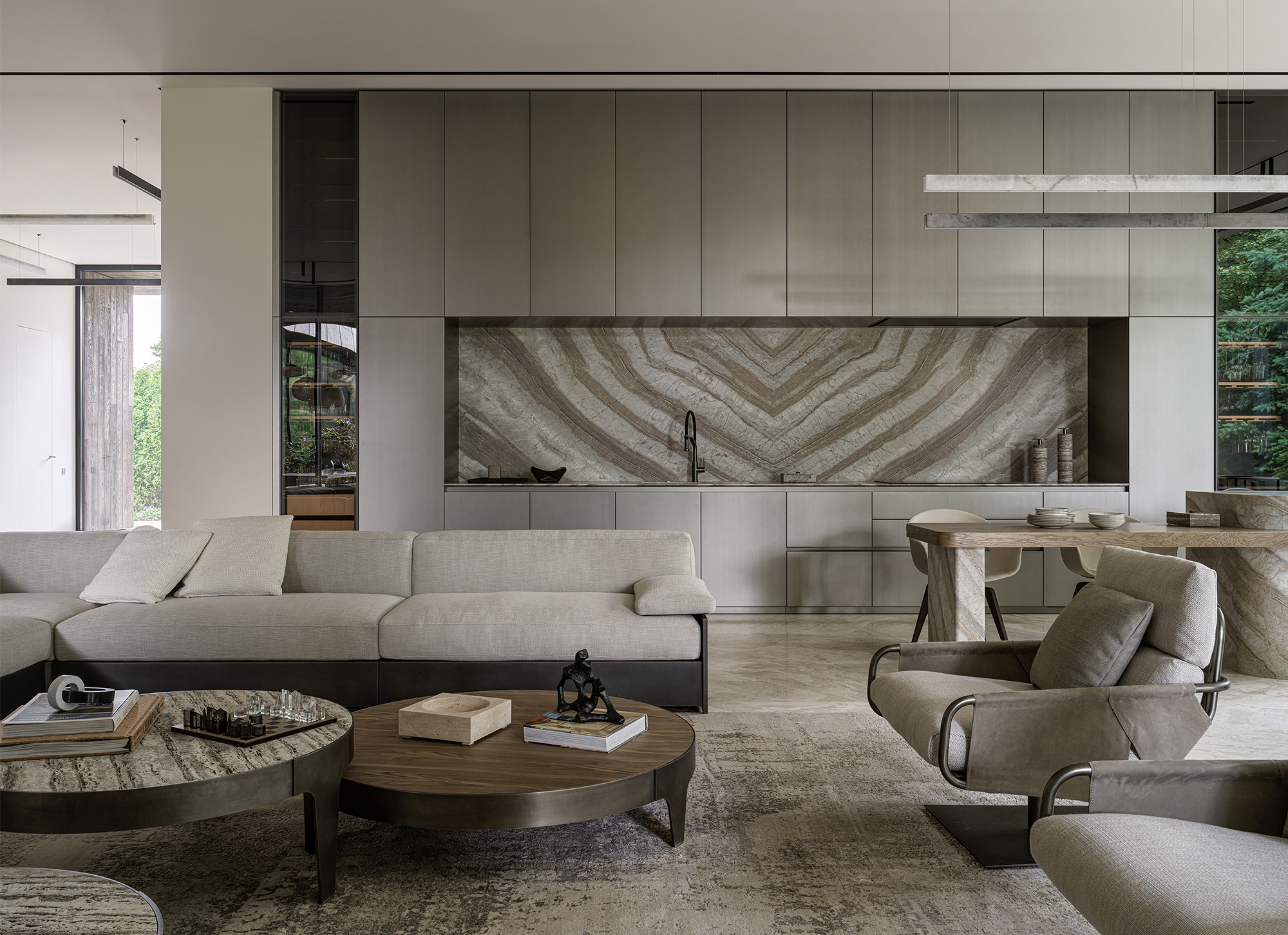 First, the use of natural materials — wood, stone, brass, and mirrors. They bring warmth, texture, and organic quality into the home, erasing the boundary between indoors and outdoors. Second, the restrained color palette, based on muted, natural tones: beige, ivory, brown, and green. Bright accents, if they appear, are minimal and natural in character. Third, the abundance of light and air, achieved through large curtain-free windows and a minimal amount of furniture.