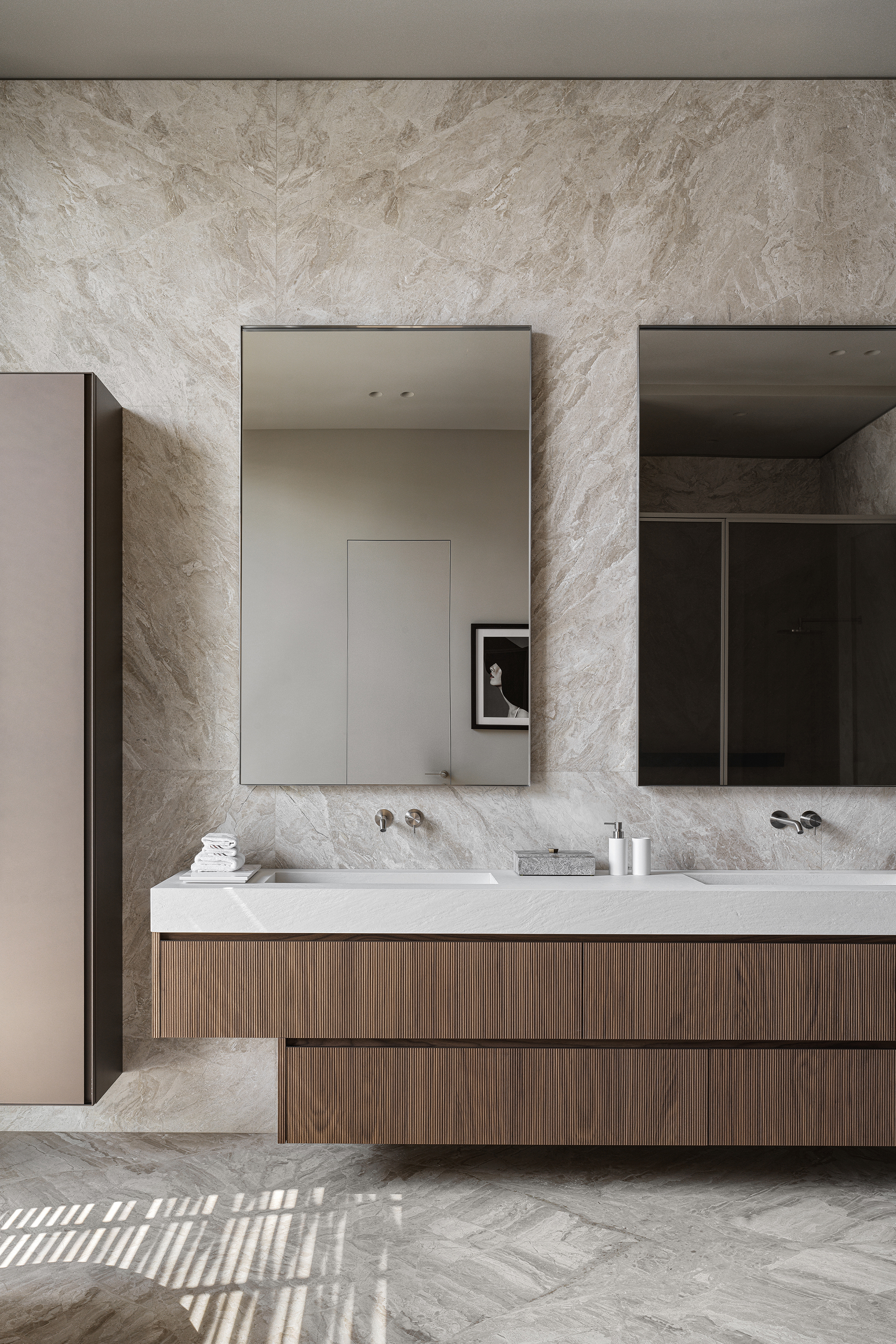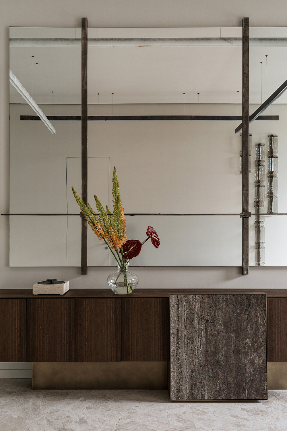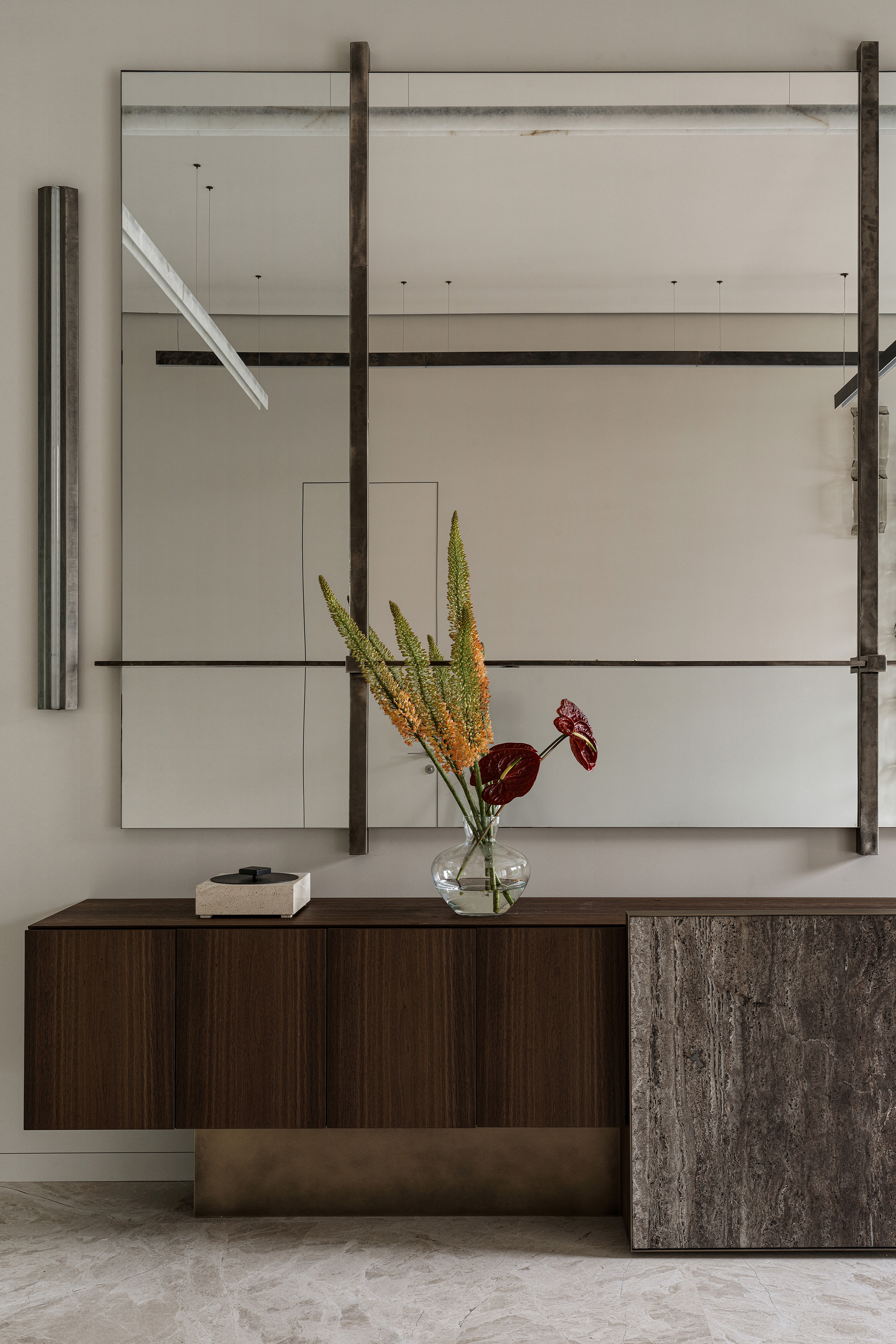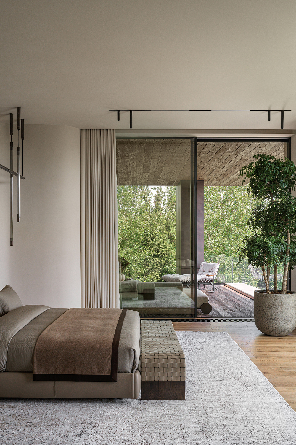 First, the use of natural materials — wood, stone, brass, and mirrors. They bring warmth, texture, and organic quality into the home, erasing the boundary between indoors and outdoors. Second, the restrained color palette, based on muted, natural tones: beige, ivory, brown, and green. Bright accents, if they appear, are minimal and natural in character. Third, the abundance of light and air, achieved through large curtain-free windows and a minimal amount of furniture.