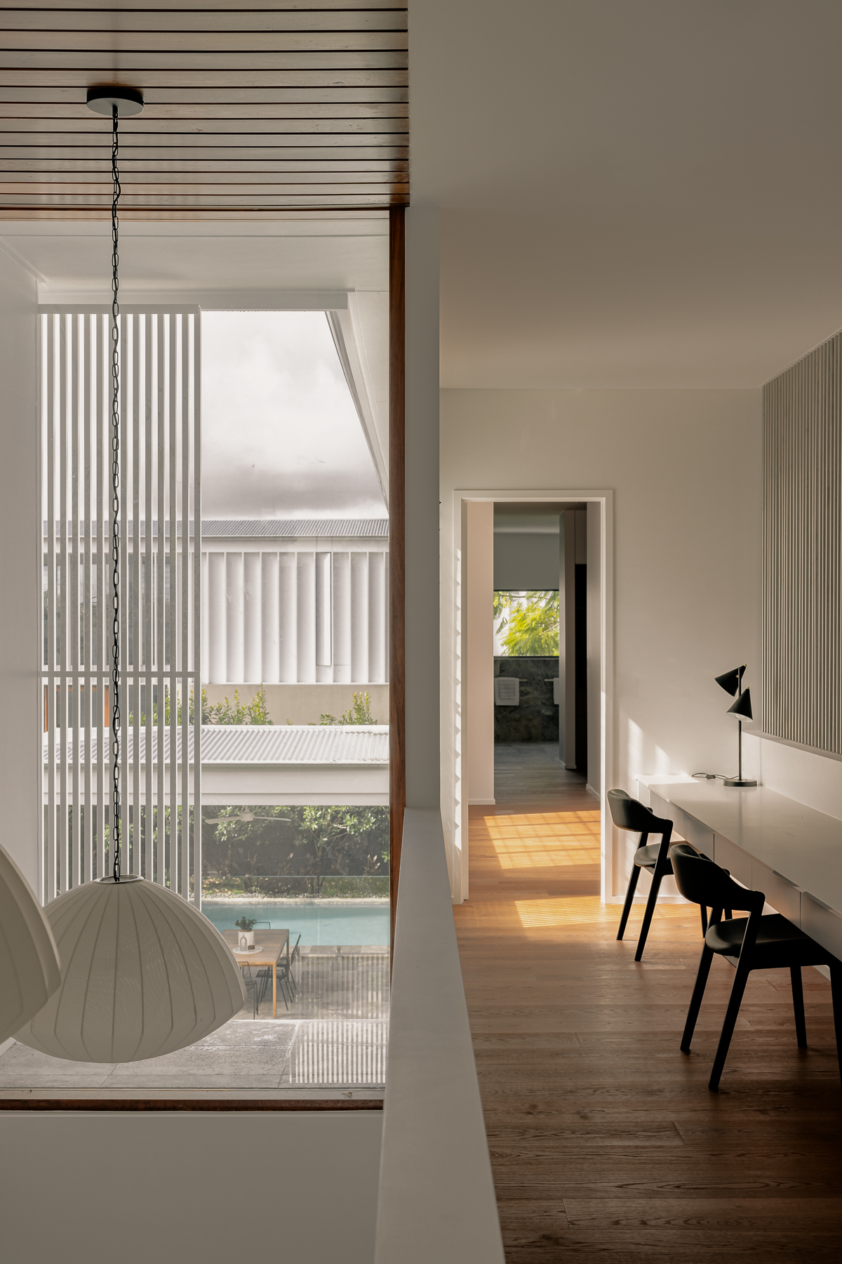 Nestled into the dense and established leafy area of Chelmer, K2 sits as a welcomed insertion of composure and restraint. Typical to the area are the more familiar weatherboard Queenslander homes, elevated with an open under volume that allows breezes to pass through and beneath the home, cooling upward. In a modern take on that formal approach, the home is comprised of more solid elements on the upper level, with more openly operable areas integrated into the lower ground level. This openness allows for partial or full enclosure as needed due to weather, while also being able to be as open as a more traditional home. Together, Joe Adsett Architects and Elm Interiors draw inspiration from the encasing setting and context.