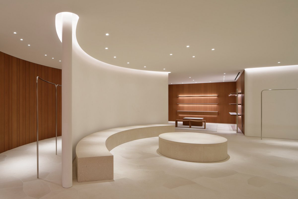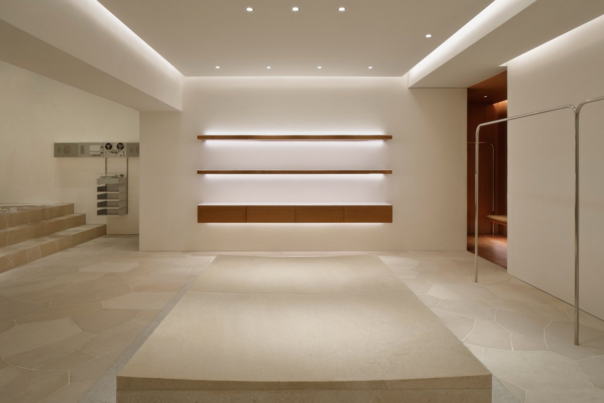 The design for the store on Ometosando uses refined geometry to sculpt space, shape patterns of movement and create atmosphere. Gestures are pared to a minimum, with the emphasis falling on a series of immersive sensory encounters with natural materials and elements of borrowed landscape — most powerfully in the play of light on timber, stone and steel, and through the branches and foliage of a mature tree.