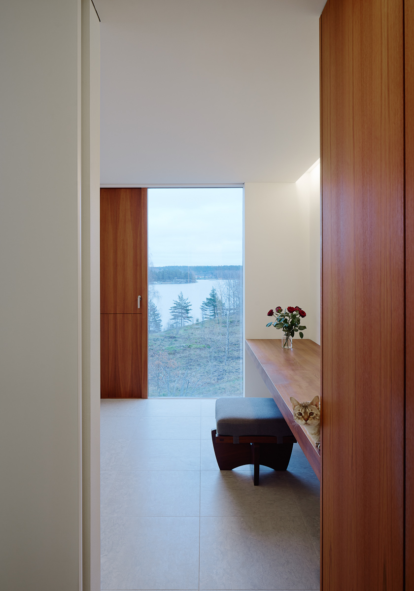 In summer, viewed from across the water, the elevations are fragmented by foliage. Inside the house is designed to be as open as possible to views over the lake, with spaces framed in simple surfaces and in a pale tonal palette.
